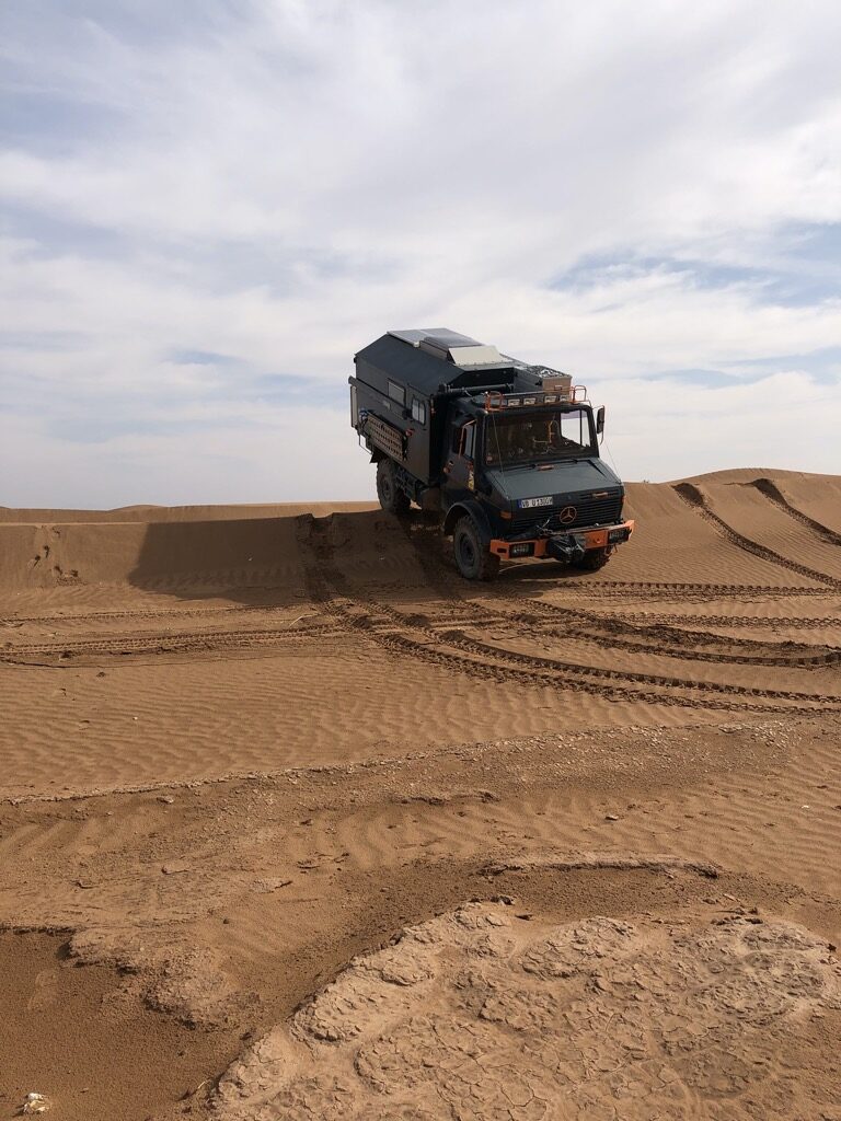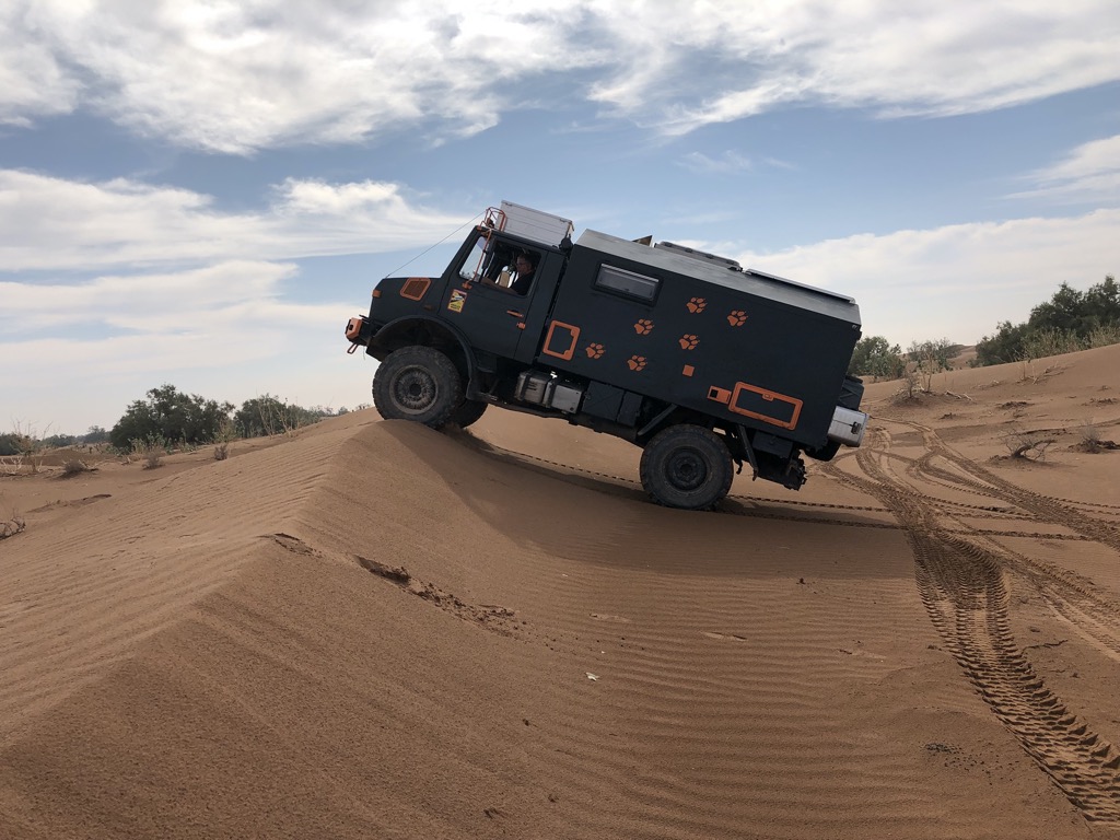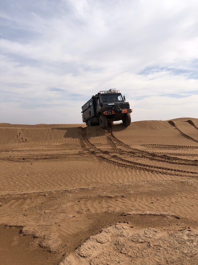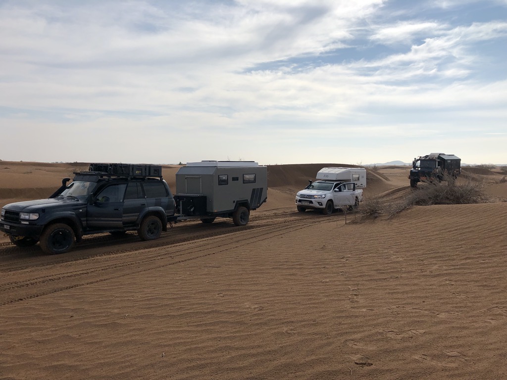 Am nächsten Tag geht es mit drei Fahrzeugen weiter, wir entscheiden uns für die lange Strecke durch die Dünen. Einfach wahnsinnig schön, das Fahren, die Dünen einfach alles! Daniel übernimmt die Navigation, so dass wir entspannt hinterher fahren können, auch mal schön. Bisher haben wir alles navigiert! Wir machen eine kurze Pause zwischen mittelhohen Dünen und Siggi kann nicht anders, muss den Moggel testen was im Sand möglich ist. Natürlich haben alle vorher der Tour den Luftdruck in den Reifen auf weniger als die Hälfte reduziert, sonst ginge hier gar nichts. Wir anderen staunen nicht schlecht, wie gut das geht, wobei einmal wars bissi knapp. Mein Herzschlag hat kurz ausgesetzt, war aber gar nicht schlimm, sah nur spektakulär aus.