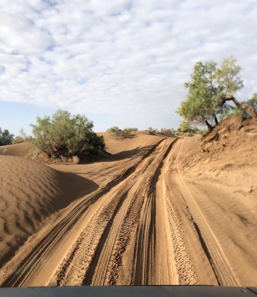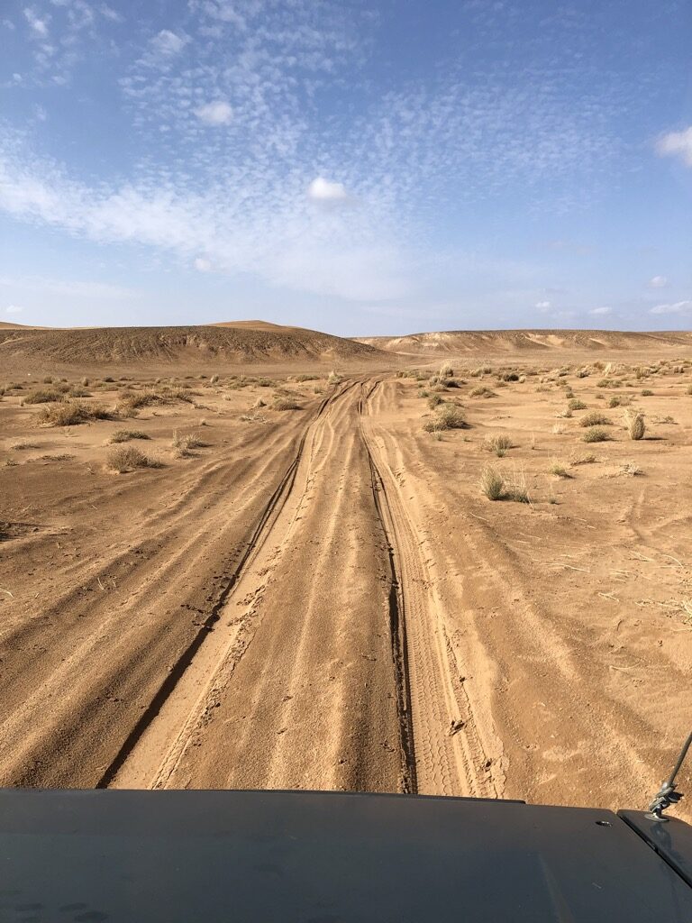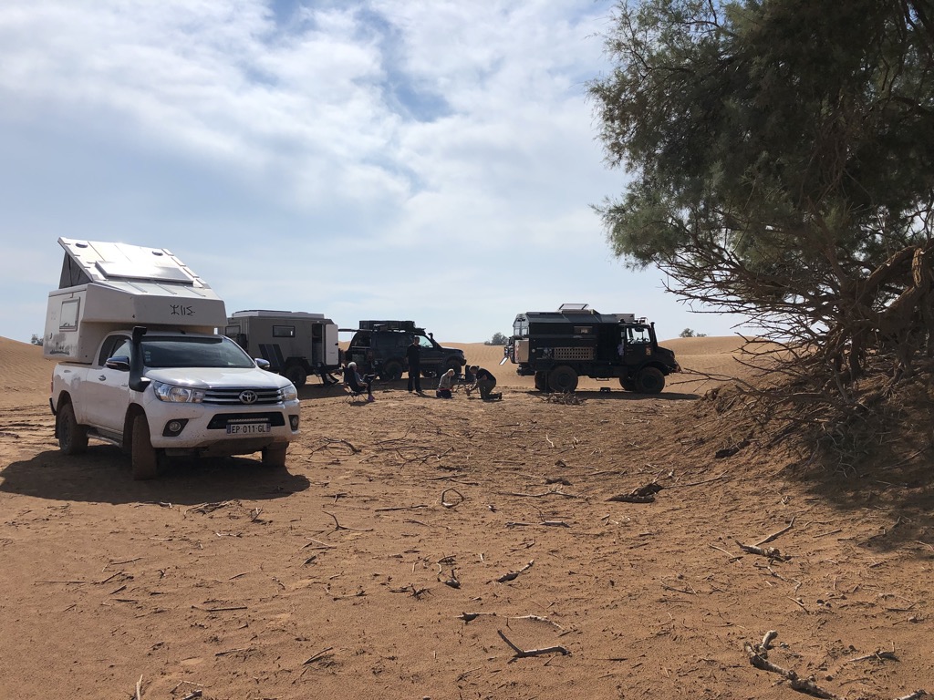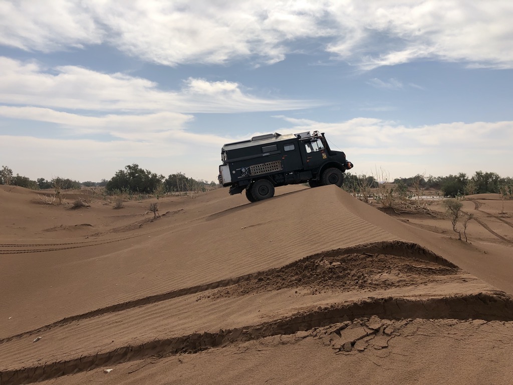 Am nächsten Tag geht es mit drei Fahrzeugen weiter, wir entscheiden uns für die lange Strecke durch die Dünen. Einfach wahnsinnig schön, das Fahren, die Dünen einfach alles! Daniel übernimmt die Navigation, so dass wir entspannt hinterher fahren können, auch mal schön. Bisher haben wir alles navigiert! Wir machen eine kurze Pause zwischen mittelhohen Dünen und Siggi kann nicht anders, muss den Moggel testen was im Sand möglich ist. Natürlich haben alle vorher der Tour den Luftdruck in den Reifen auf weniger als die Hälfte reduziert, sonst ginge hier gar nichts. Wir anderen staunen nicht schlecht, wie gut das geht, wobei einmal wars bissi knapp. Mein Herzschlag hat kurz ausgesetzt, war aber gar nicht schlimm, sah nur spektakulär aus.