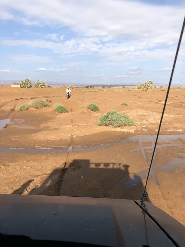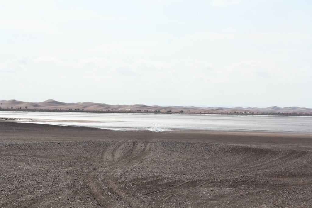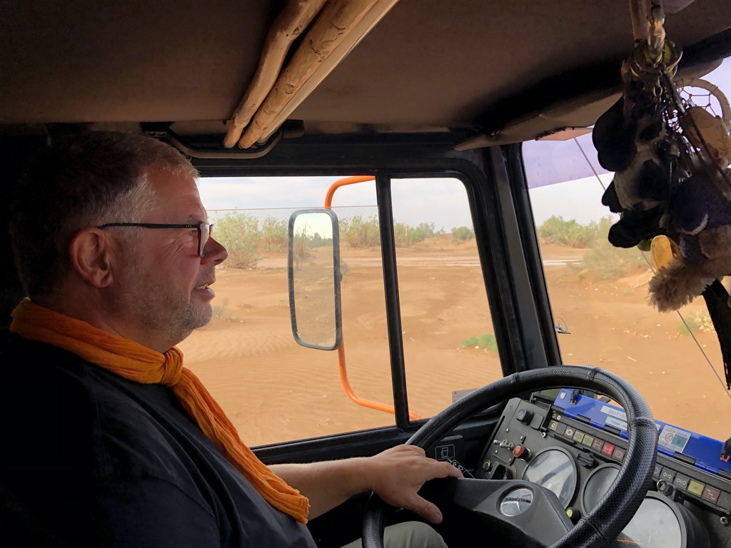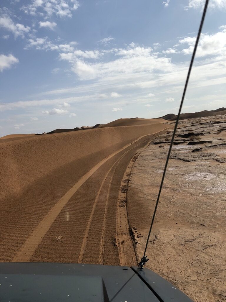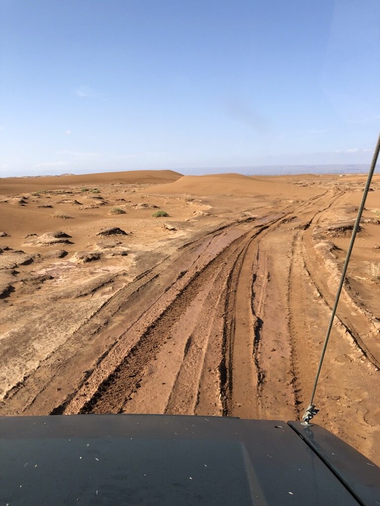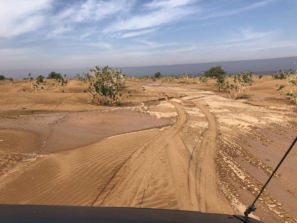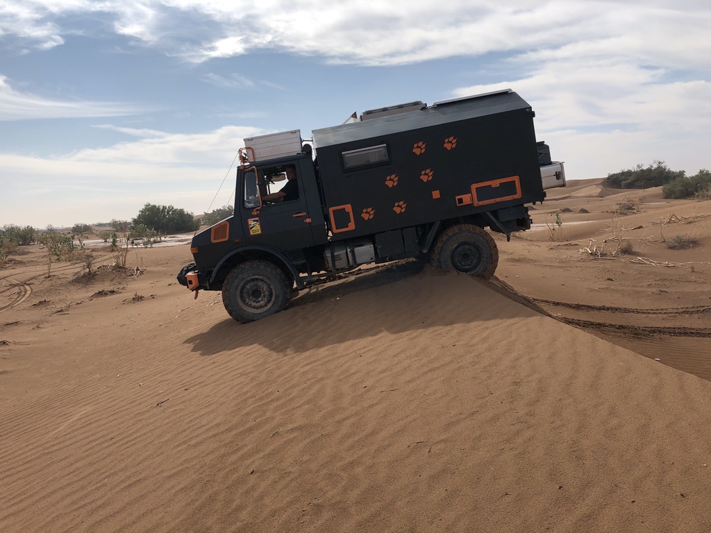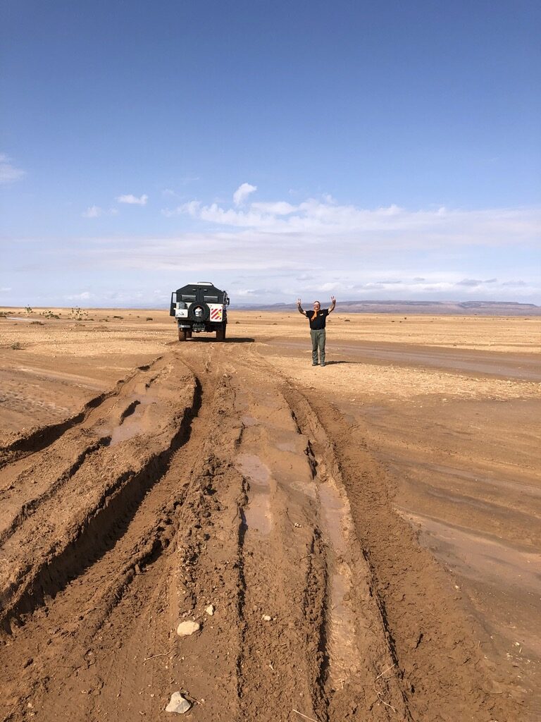 Aber jetzt noch mal zurück. Wir lassen uns von Said (dem Camp Besitzer) die „neue“ Route erklären, da die alte wegen des Wassers nicht befahrbar ist. Wir sollen immer den Spuren folgen und um Wasserstellen großzügig drumherum fahren. Nichts einfacher als das!