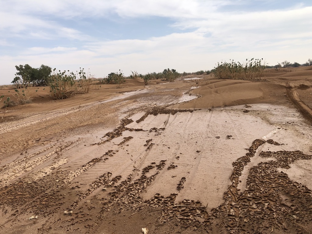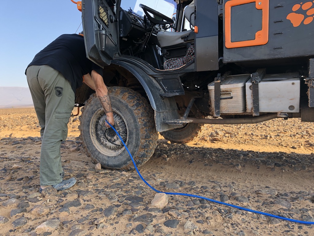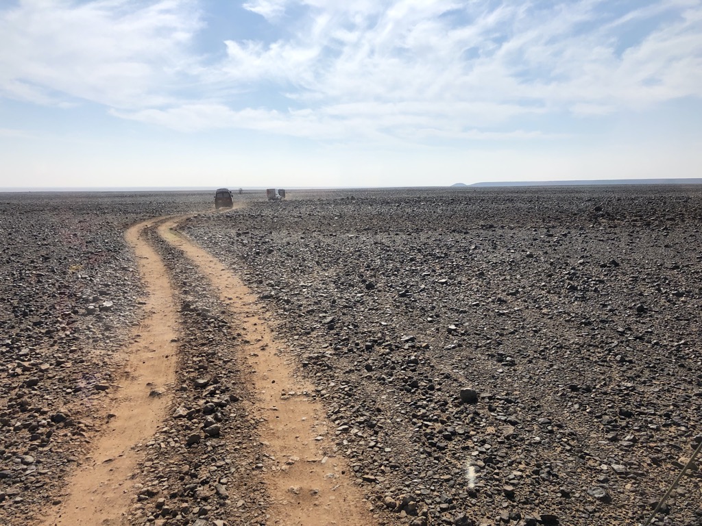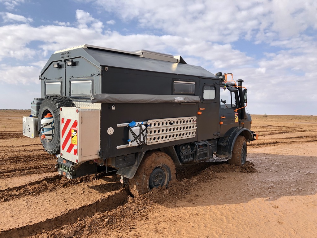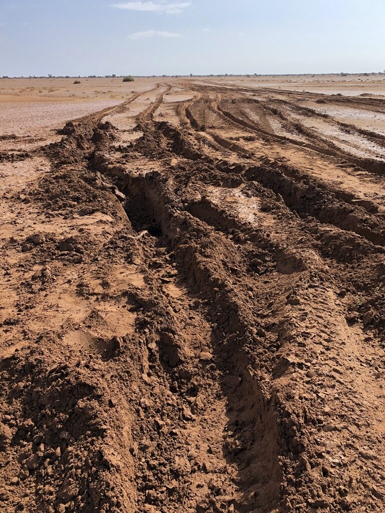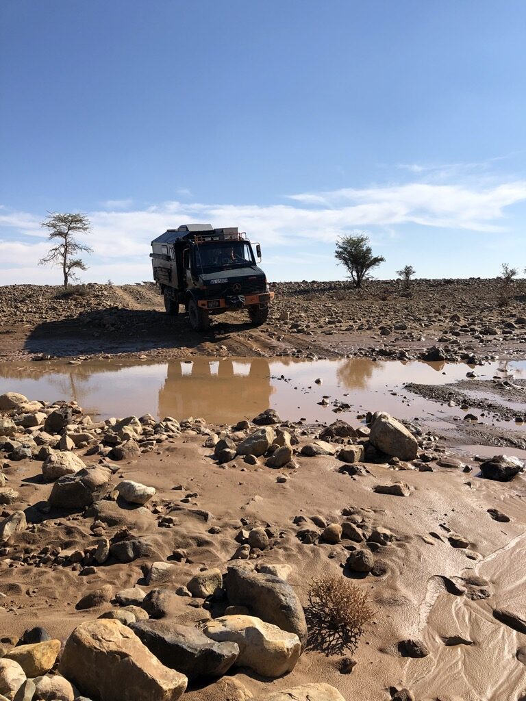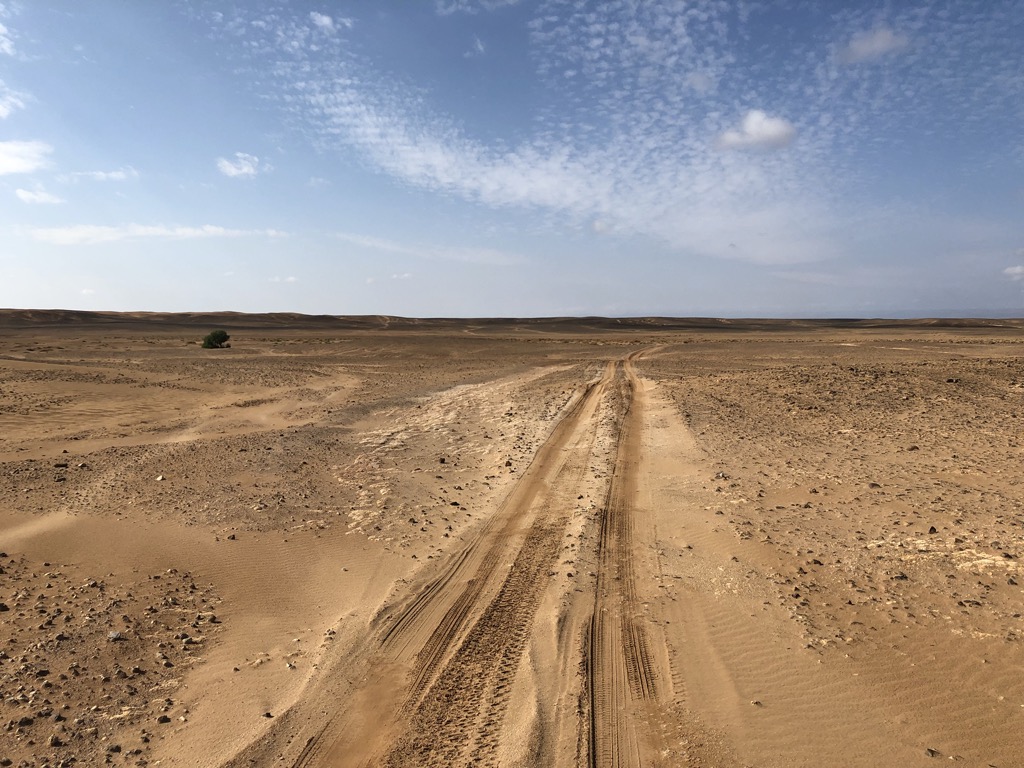 Aber jetzt noch mal zurück. Wir lassen uns von Said (dem Camp Besitzer) die „neue“ Route erklären, da die alte wegen des Wassers nicht befahrbar ist. Wir sollen immer den Spuren folgen und um Wasserstellen großzügig drumherum fahren. Nichts einfacher als das!