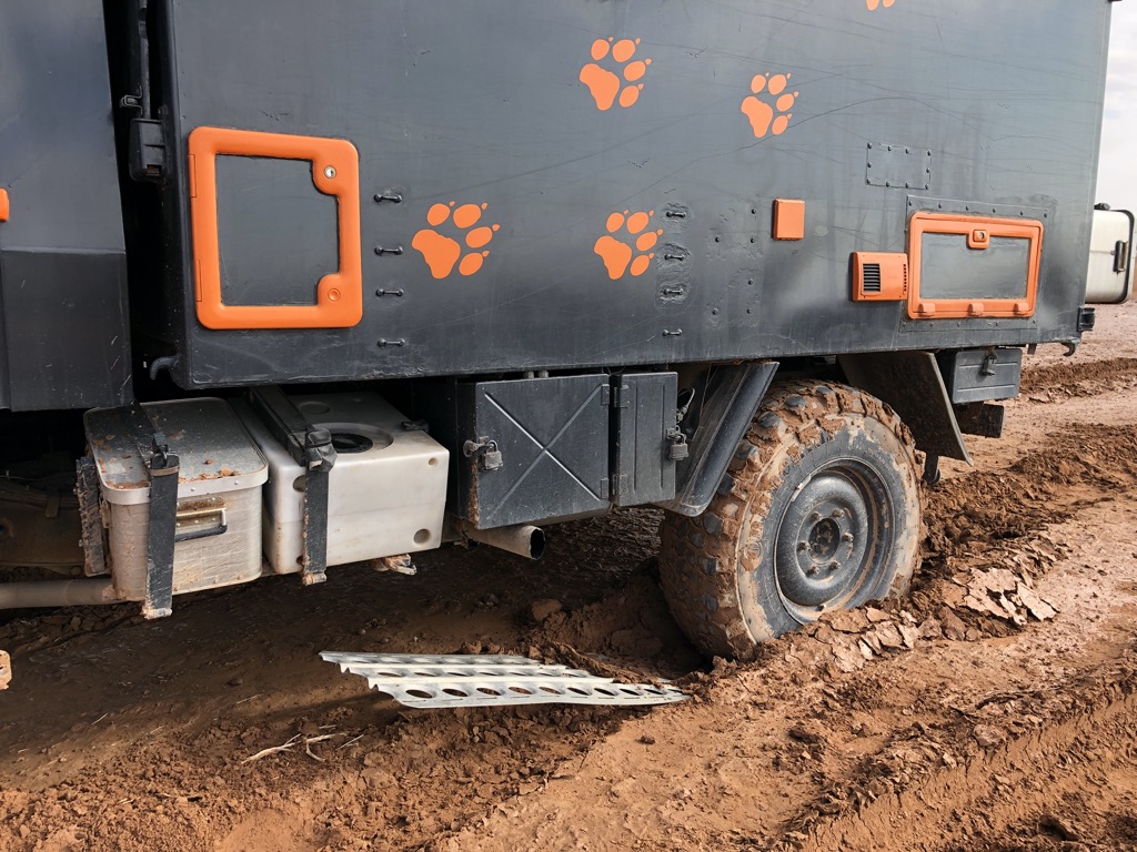 Es ist alles startklar und wir freuen uns auf ein neues Abenteuer. Das lässt auch gar nicht lange auf sich warten, denn unter dem vermeintlich festen Untergrund ist es super matschig und der Moggel zu schwer bzw. hat Siggi nicht genügend Schwung – wir sitzen fest! Es heisst schaufeln, die Sandbleche unterlegen und mit Gas raus aus dem Matsch – denkste! Das Profil der Reifen sitzt so zu mit diesem klebrigen Matsch, dass diese immer wieder über die Sandbleche rutschen. Nächster Versuch mit dem Bergegurt verbinden wir uns mit dem Toyota von Christian. Der Soll im Rückwärtsgang den Moggel unterstützen. Hmm, leider klappt das auch nicht! Ha, da ist doch noch die Seilwinde. Also Seilwinde auspacken die an den Toyota dran, wird schon klappen. Ach halt der Toyota hat ca. 2,5 Tonnen Gegengewicht – geht das? Nöö!! Anstatt sich der Moggel bewegt ziehen wir den Toyota zu uns ran! Haha… Mittlerweile ist ein Pickup mit 3 Jungs, dem Vater und 3 Französinnen stehen geblieben. Die Jungs helfen Schaufeln und schieben sogar. Mit deren Hilfe und nochmal dem Bergegurt holen wir den Moggel nach gut einer Stunde Arbeit aus dem Matsch! Jiihaaa!!!!!