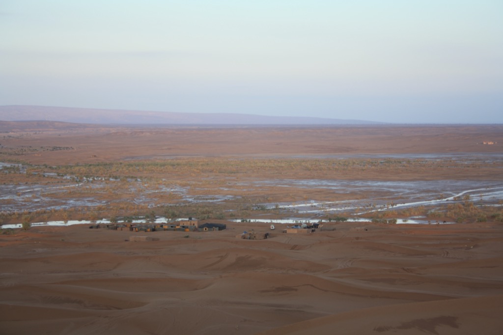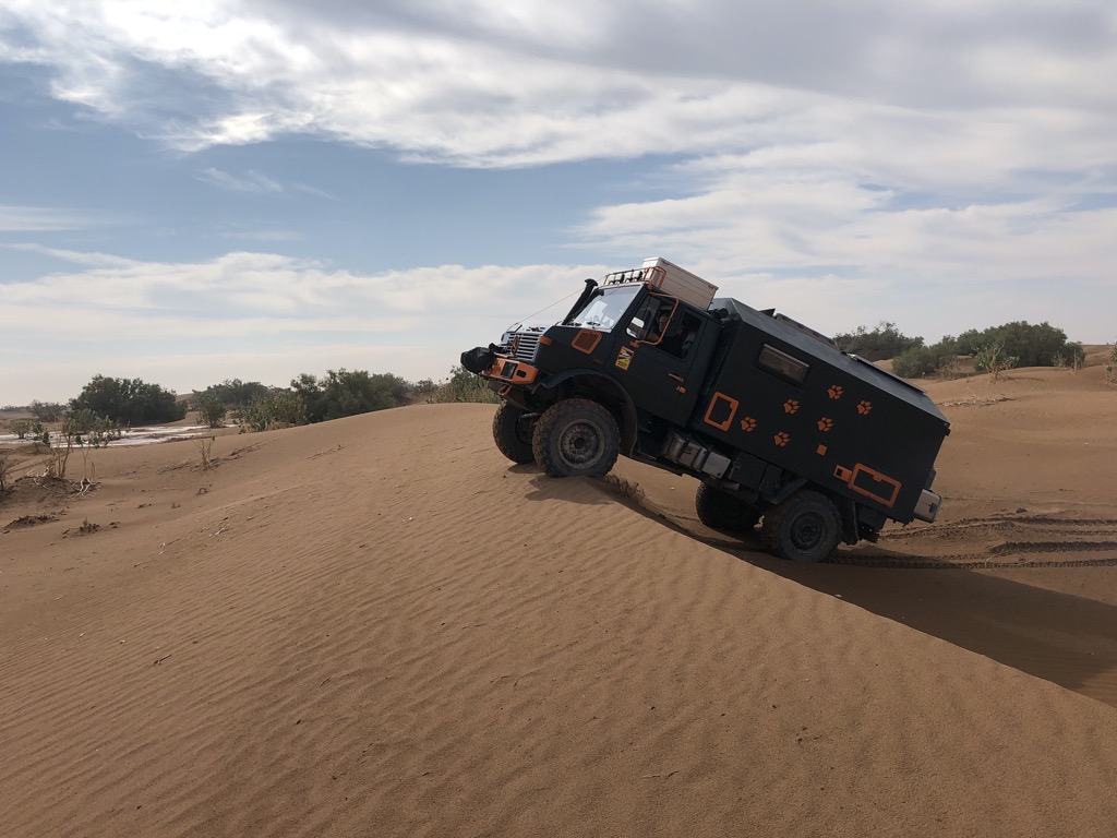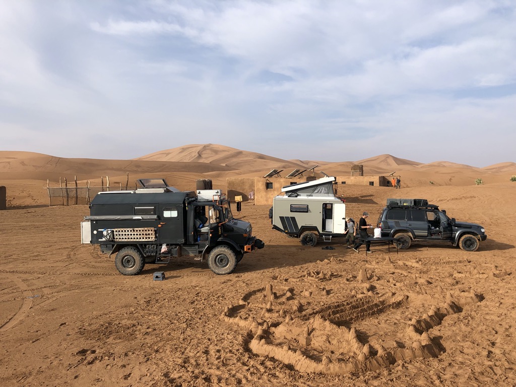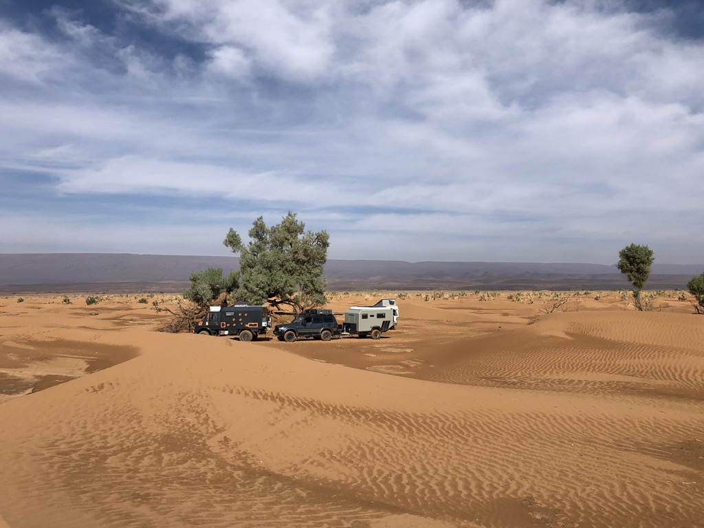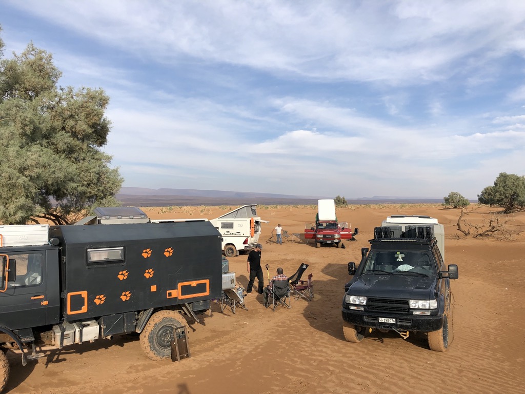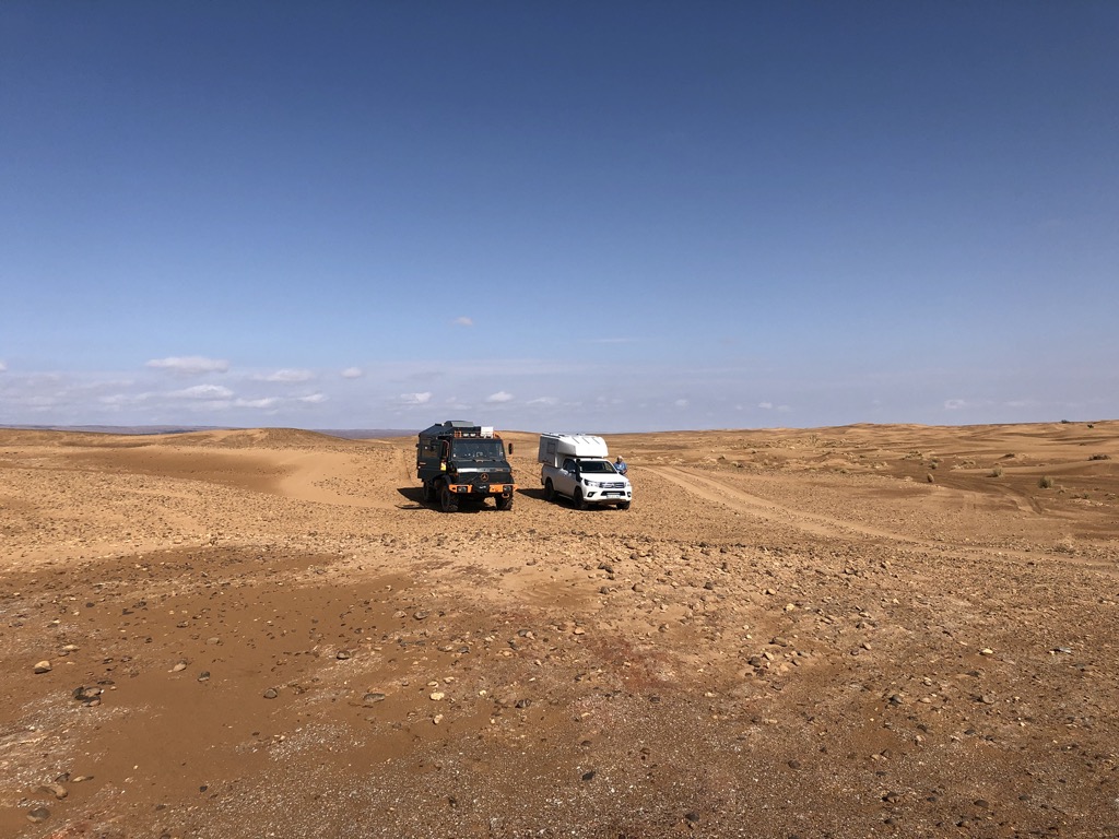 Wir haben den zweiten großen Wüstenteil Marokkos gleich an die erste dran gehängt. Heisst wir sind 2 Tage nach dem Regen, wieder mit Christian (dem Franzosen) in die Wüste gefahren. Wir haben eine App Park4Night, da rüber findet man Stellplätze und Camps aber auch schöne Orte in der Natur zum Übernachten, und auf dieser App lesen wir schon seit Wochen immer mal wieder Kommentare von „ChristBaum“, die sind uns immer 2-4 Tage voraus aber auf einer ähnlichen Route. Im Camp wo wir den Regen hatten sind die morgens abgereist und wir Nachmittags angekommen. Nach dem wir mit dem Camp Besitzer gesprochen haben sind wir mit „Christbaum“ in Kontakt getreten. Es handelt sich um eine Schweizer Familie die mit einem Toyota 4×4 und einem Offroadcaravan unterwegs sind. Da die schon im Erg Chegaga sind und wegen des Wassers noch nicht weiterfahren konnten verabreden wir uns und treffen die 4 in einem Camp zwischen den Dünen. Ich geh vor Sonnenuntergang noch mit Christine ( die Schweizerin) auf die höchste Düne am Camp. Wahnsinn, was für ein Ausblick.
