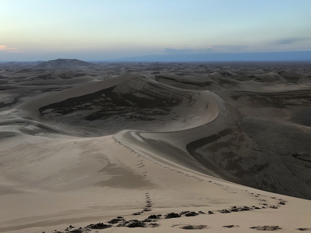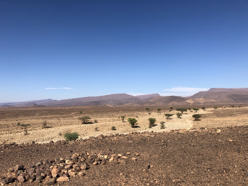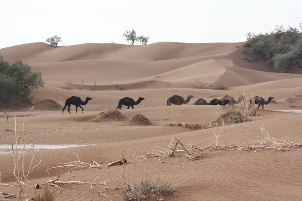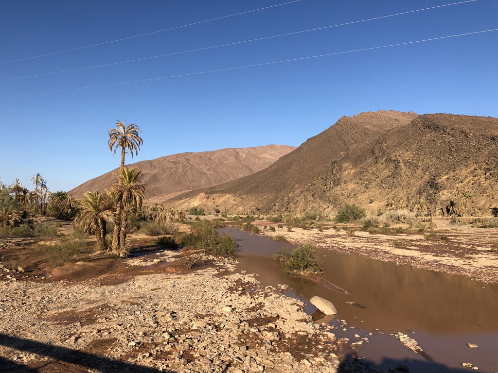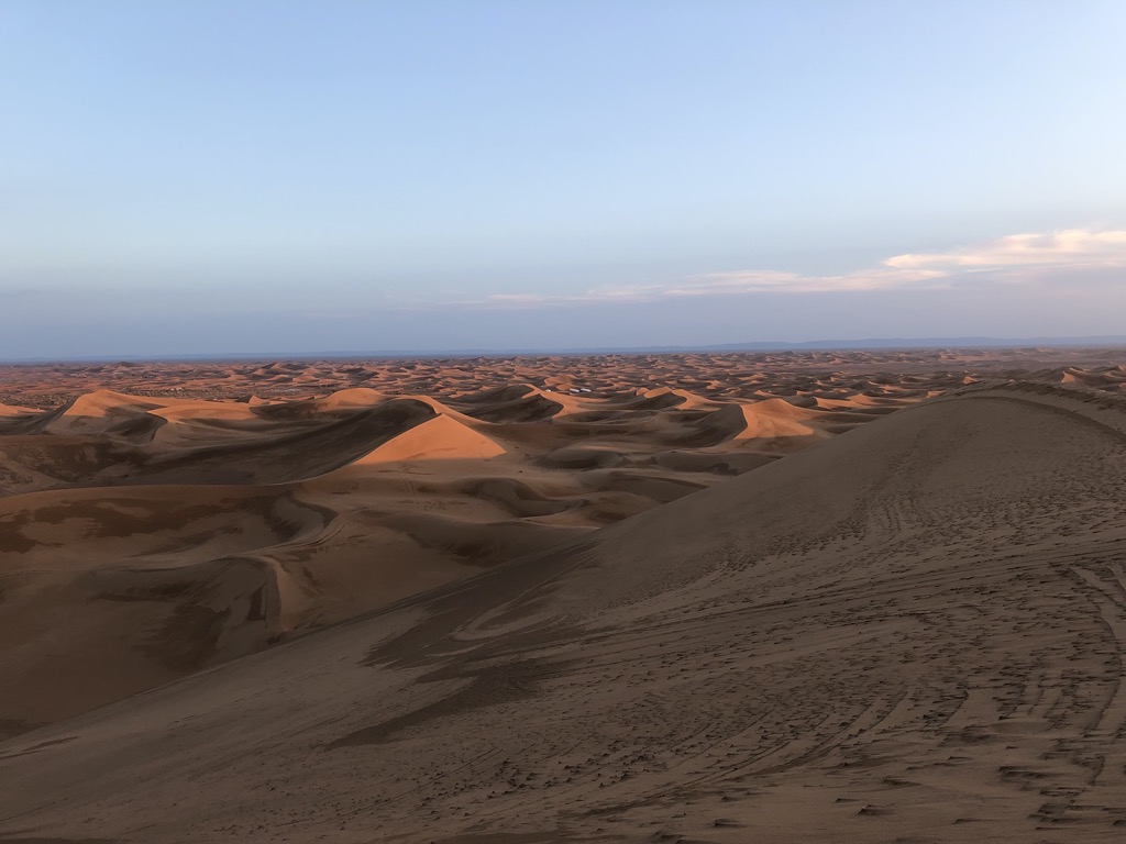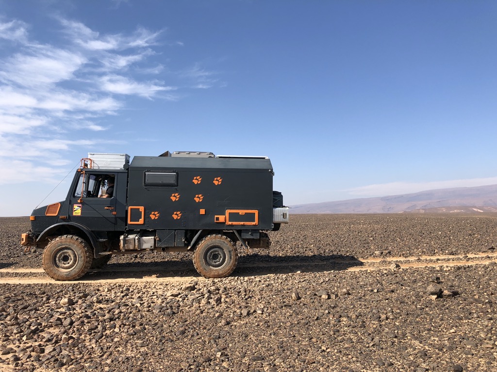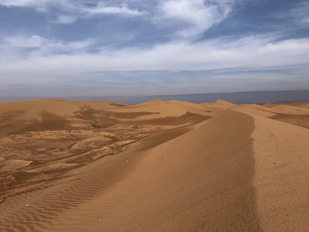 Wir haben den zweiten großen Wüstenteil Marokkos gleich an die erste dran gehängt. Heisst wir sind 2 Tage nach dem Regen, wieder mit Christian (dem Franzosen) in die Wüste gefahren. Wir haben eine App Park4Night, da rüber findet man Stellplätze und Camps aber auch schöne Orte in der Natur zum Übernachten, und auf dieser App lesen wir schon seit Wochen immer mal wieder Kommentare von „ChristBaum“, die sind uns immer 2-4 Tage voraus aber auf einer ähnlichen Route. Im Camp wo wir den Regen hatten sind die morgens abgereist und wir Nachmittags angekommen. Nach dem wir mit dem Camp Besitzer gesprochen haben sind wir mit „Christbaum“ in Kontakt getreten. Es handelt sich um eine Schweizer Familie die mit einem Toyota 4×4 und einem Offroadcaravan unterwegs sind. Da die schon im Erg Chegaga sind und wegen des Wassers noch nicht weiterfahren konnten verabreden wir uns und treffen die 4 in einem Camp zwischen den Dünen. Ich geh vor Sonnenuntergang noch mit Christine ( die Schweizerin) auf die höchste Düne am Camp. Wahnsinn, was für ein Ausblick.
