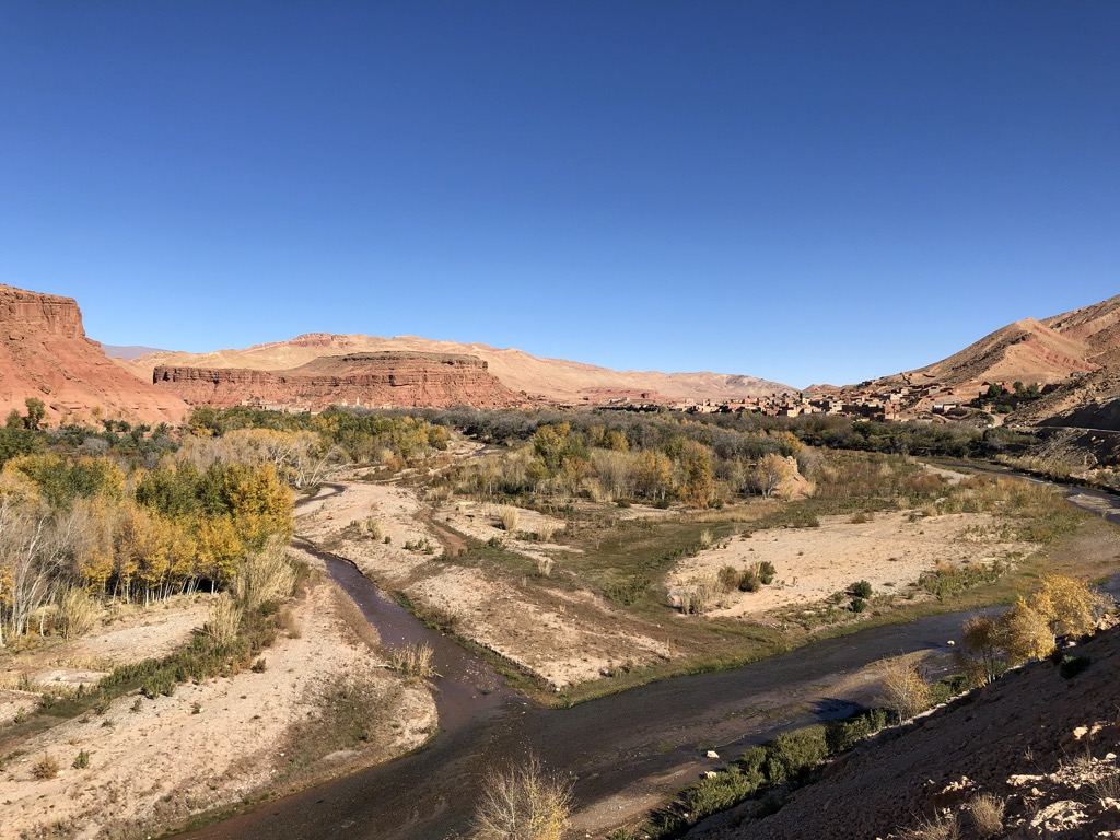 Wir fahren weiter durchs Dadestal. Das ist ähnlich wie auf dem Weg zur Todraschlucht. Die Landschaft wechselt mit Bergen, und immer wieder mal kleine Talstücke ab. In denen wird Landwirtschaft betrieben. Es gibt immer noch Bäume mit buntem Laub, was zusammen mit den verschiedenen farbigen Gesteinen und den Schneebedeckten Bergen teilweise im Hintergrund einfach wunderschön aussieht.