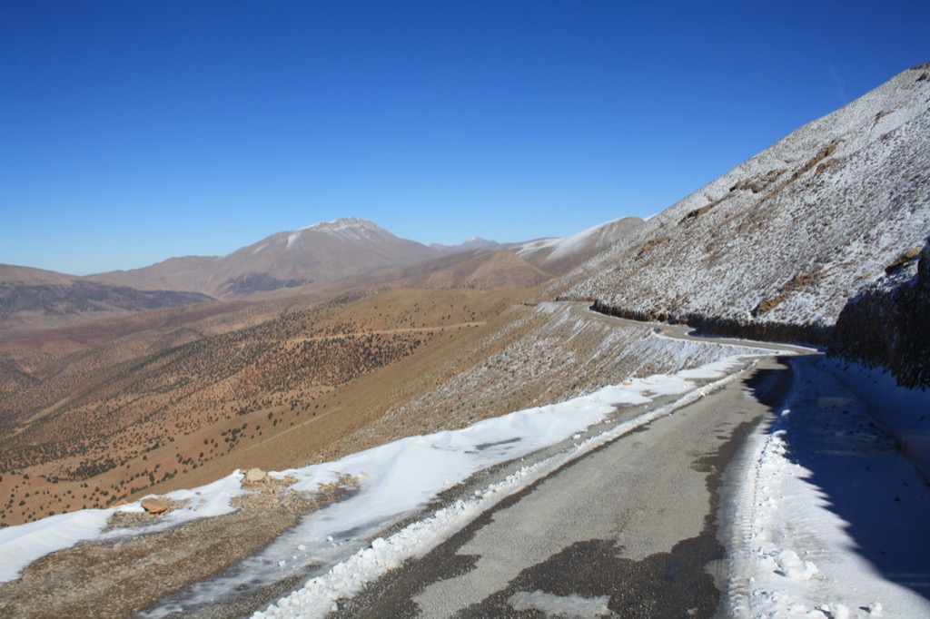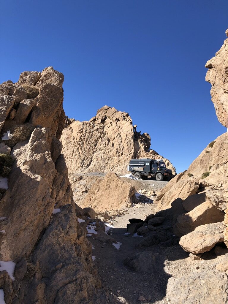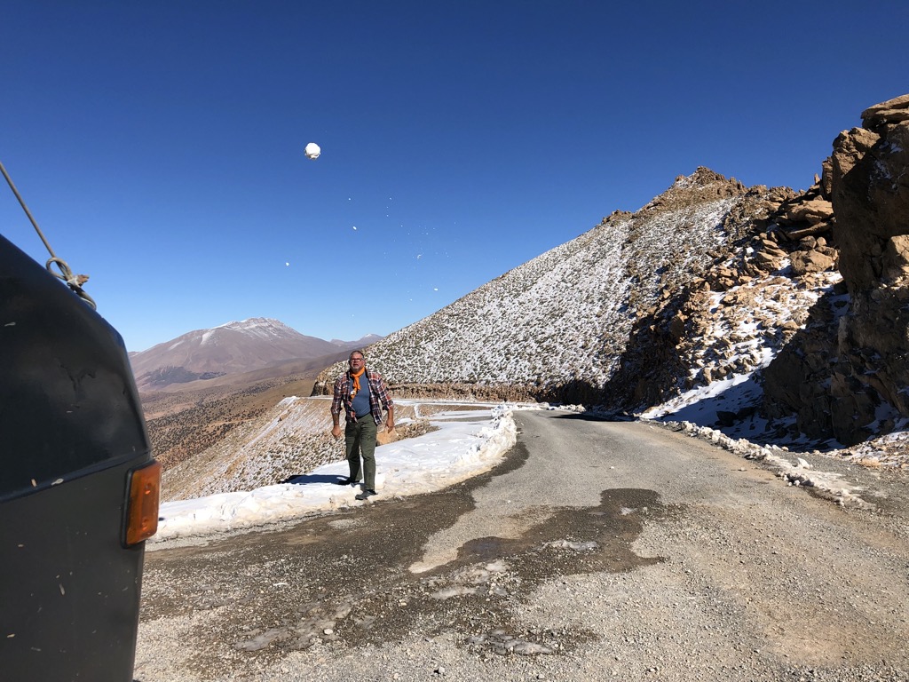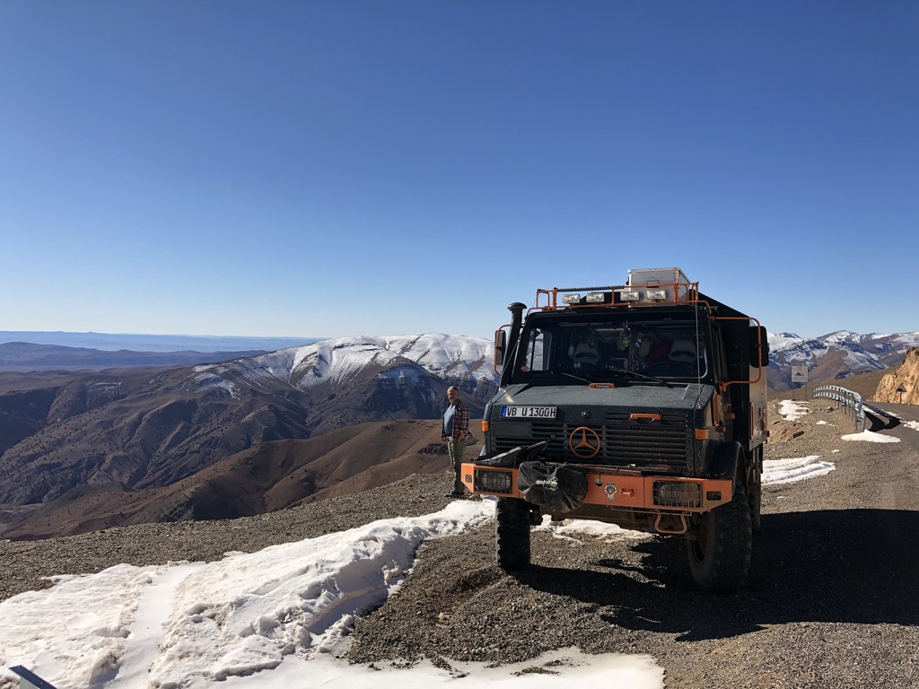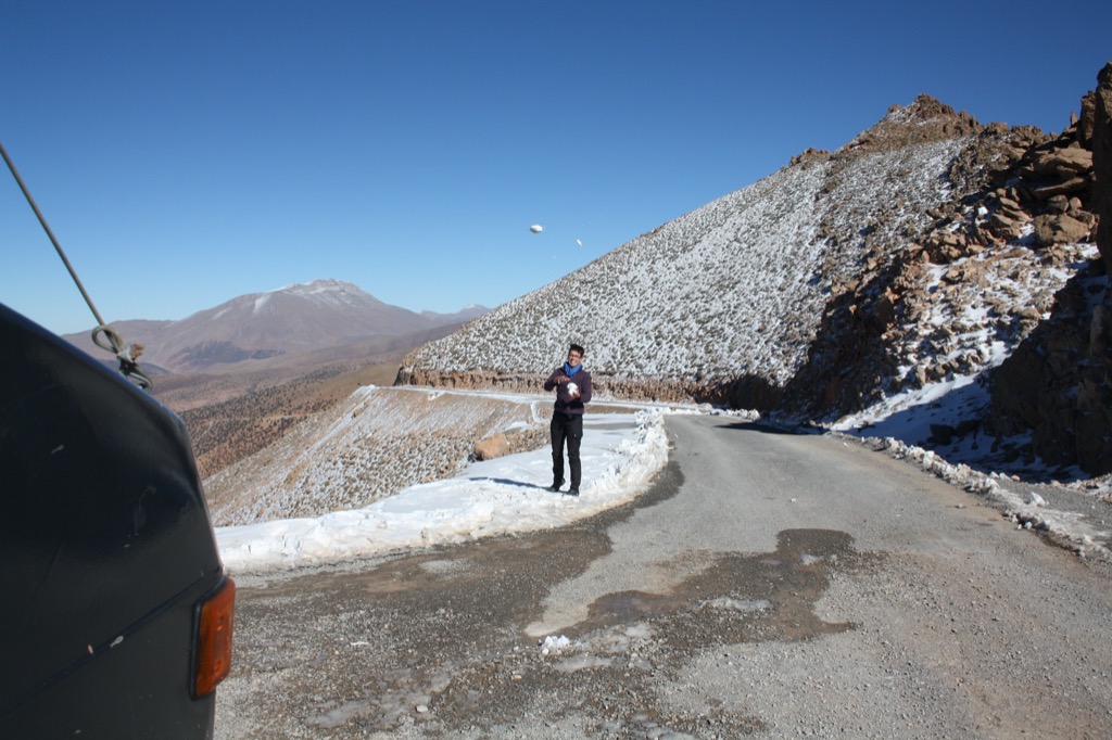 Der 2. Pass war der Höchste mit 3005m und Schnee, ich konnte sogar ein bisschen über den Schnee schlittern. Danach hatten wir ein Stück mit Schnee und Eis auf der Straße. Etwas weiter unten haben wir angehalten um Mittagspause zu machen. Noch im geschlossenen Führerhaus sitzend hatten wir die wahnwitzige Idee mit unseren Stühlen draußen zu sitzen. Diese Idee hatte sich nach dem aussteigen ganz schnell verflüchtigt. Es war einfach zu windig und zu kalt, wir hatten im Schatten 5 Grad und in der Sonne 11 Grad.