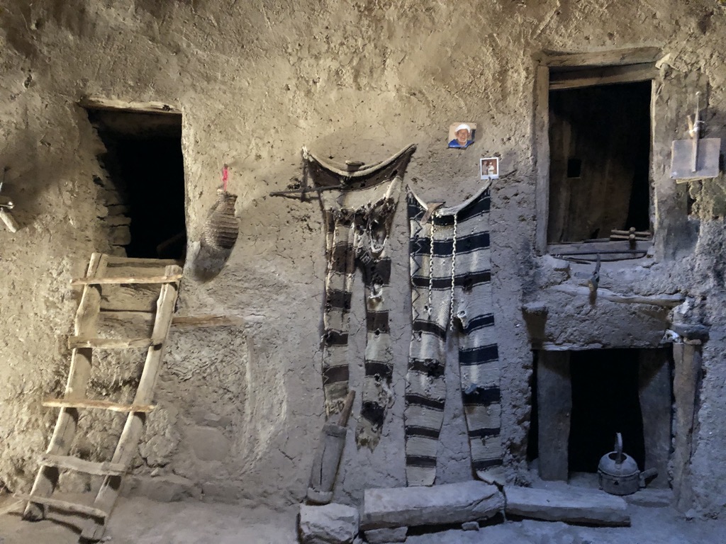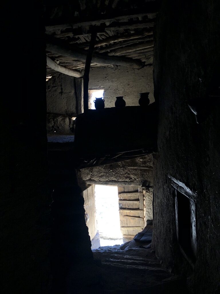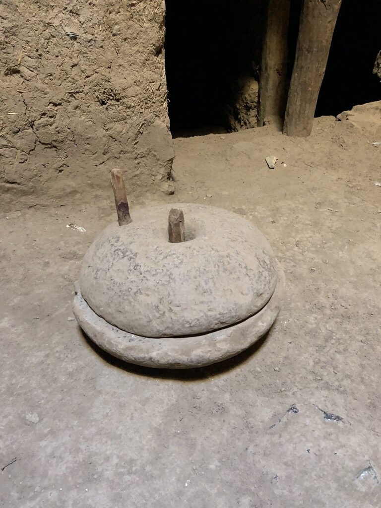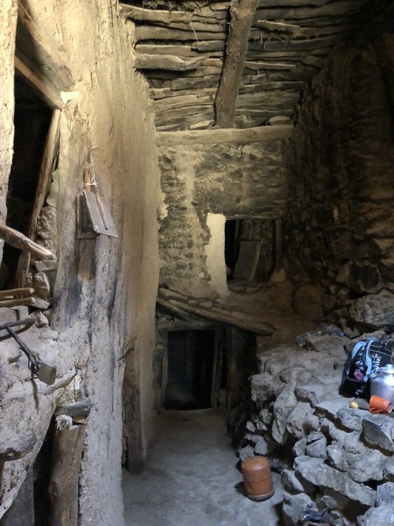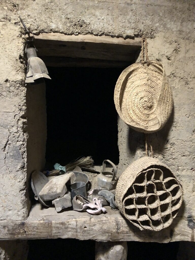 Wir haben sogar das Glück, dass gerade drei Männer im Agadir sind und renovieren. Ganz überraschend werden wir eingeladen für eine Besichtigung rein zu kommen und uns um zu sehen. Hier stehen viele alte Gegenstände wie z.B. ein alter Mühlstein, Teekessel und verschiedene Körbe und Tongefäße zur Aufbewahrung der Lebensmittel. Es gibt viele kleine Kammern, die tief nach hinten in das Gebäude gehen. Ich passe da gerade so rein, Siggi hätte da echt Probleme rein und wieder raus zu kommen.