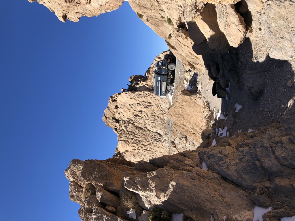 Der 2. Pass war der Höchste mit 3005m und Schnee, ich konnte sogar ein bisschen über den Schnee schlittern. Danach hatten wir ein Stück mit Schnee und Eis auf der Straße. Etwas weiter unten haben wir angehalten um Mittagspause zu machen. Noch im geschlossenen Führerhaus sitzend hatten wir die wahnwitzige Idee mit unseren Stühlen draußen zu sitzen. Diese Idee hatte sich nach dem aussteigen ganz schnell verflüchtigt. Es war einfach zu windig und zu kalt, wir hatten im Schatten 5 Grad und in der Sonne 11 Grad.