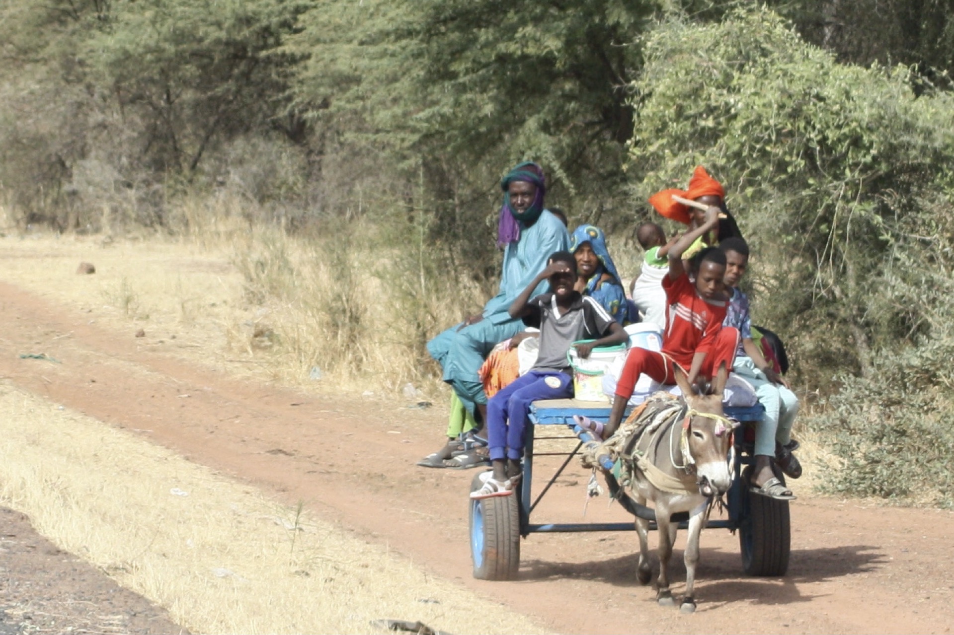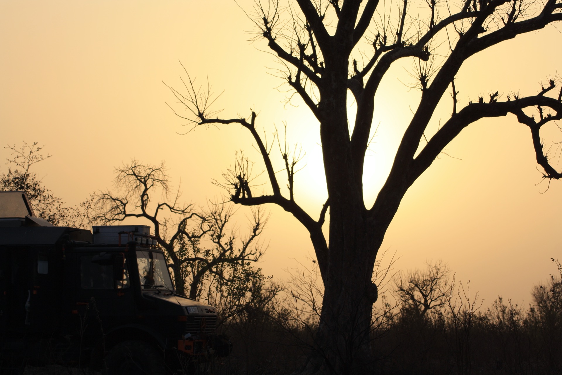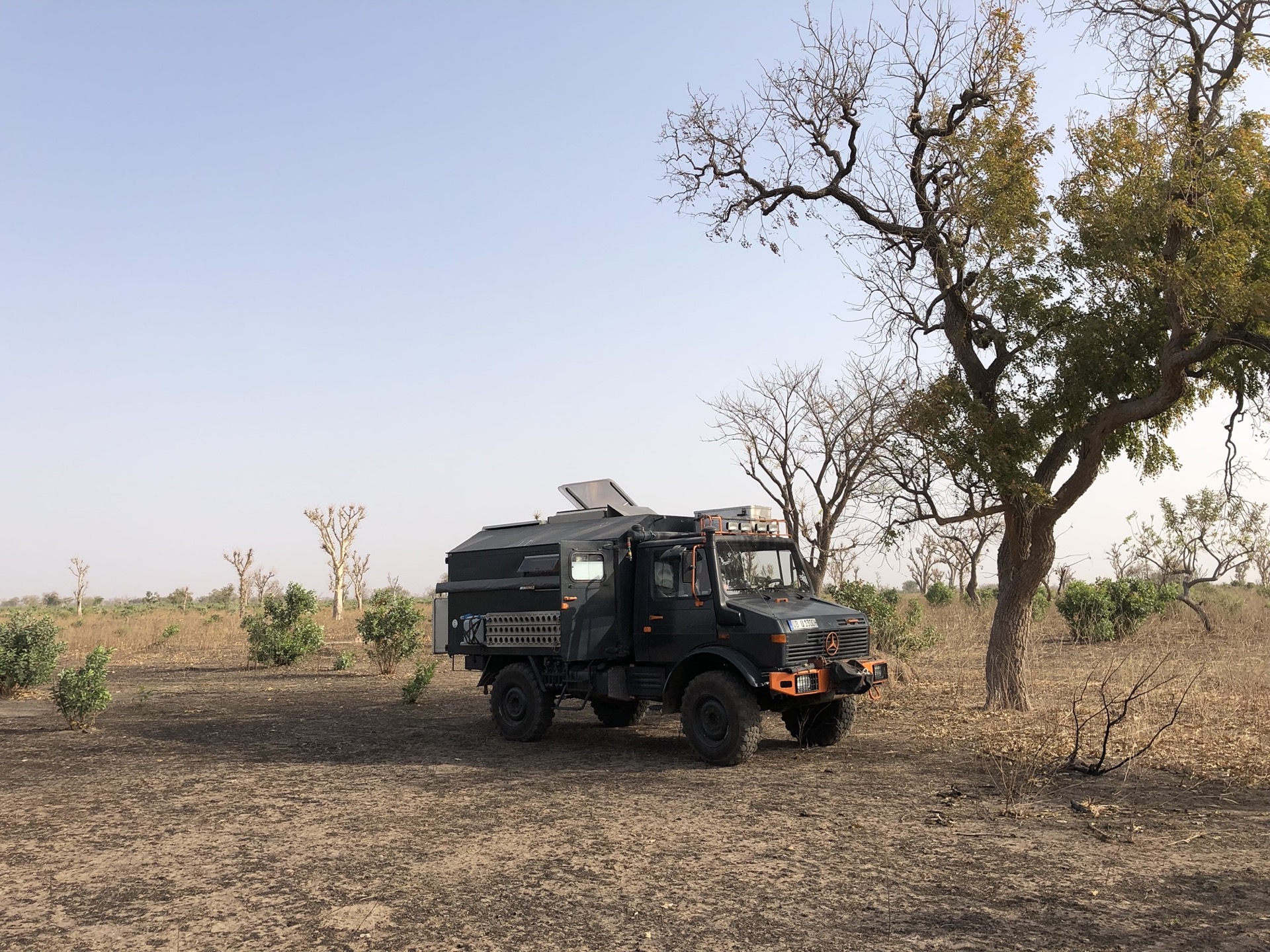 So stehen bei den Häusern und Hütten oft mehrere Mangobäume und darunter befindet sich eine Sitz- oder Liegegelegenheit. Das mit dem Schatten ist hier echt wichtig. Im Gegensatz zu Dakar sind es jetzt 20 Grad mehr, was das Thermometer anzeigt. Wir haben über 42 Grad (max. waren 45,1) und nachts sinkt die Temperatur erst gegen sieben Uhr auf 25 Grad und gegen halb neun steigt sie schon wieder deutlich an. Zwei Nächste verbringen wir jeweils in der Nähe von Dörfern. Es kommen wie immer Menschen vorbei und fragen wohin, woher und auf Nachfrage, ob wir eine Nacht stehen bleiben können und schlafen gibt es immer die Antwort, kein Problem. So gefällt uns das! Das letzte Dorf vor der Grenze zu Guinea erreichen wir nach 4 Tagen. Wir stellen uns an einen Baum um wenigsten ein bisschen Schatten zu bekommen. Die Nacht ist bis auf eine kleine Störung durch eine Handvoll Esel, die sich am Moggel schrubbern und laut Iiiaaaa rufen ruhig.