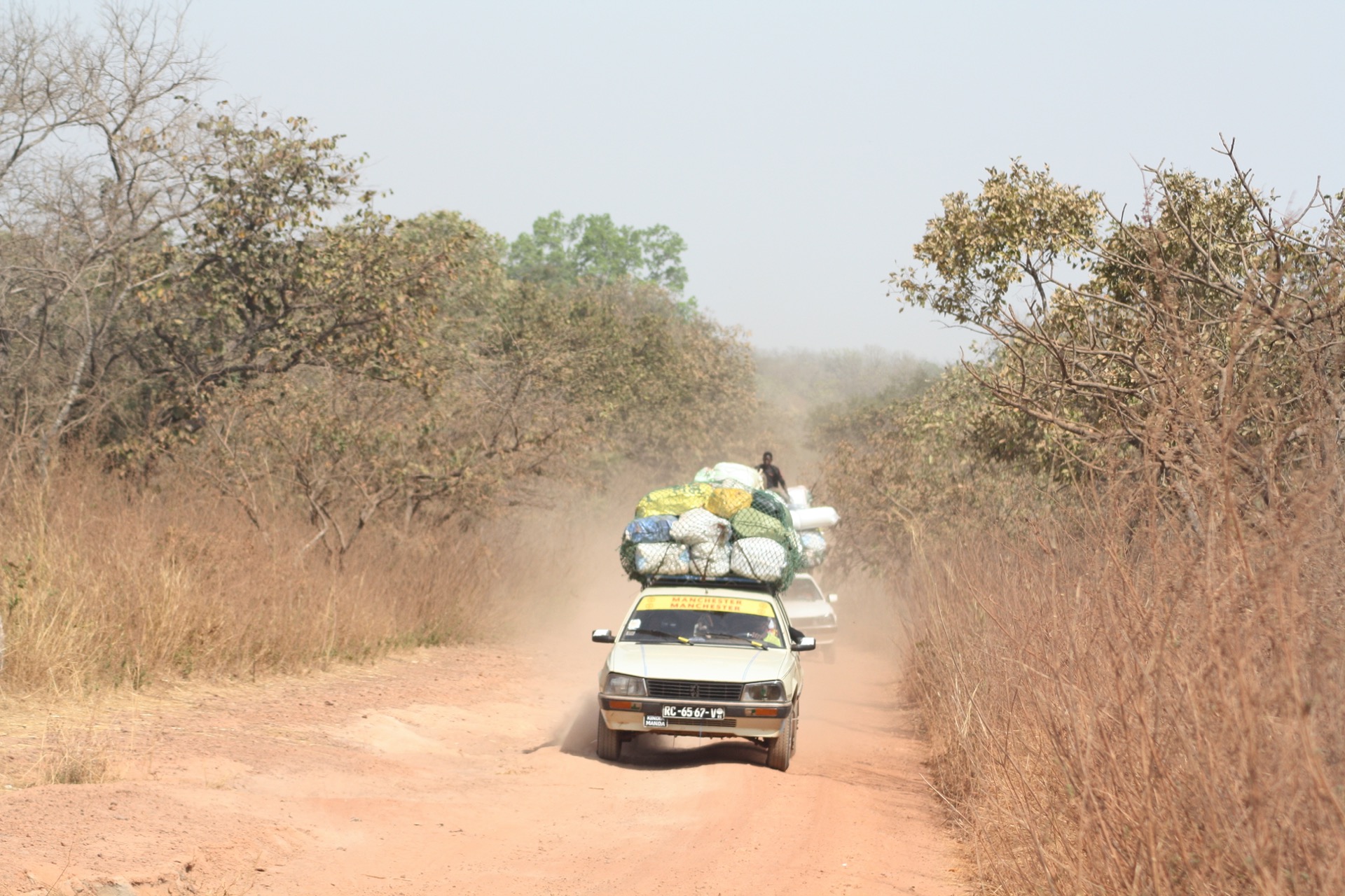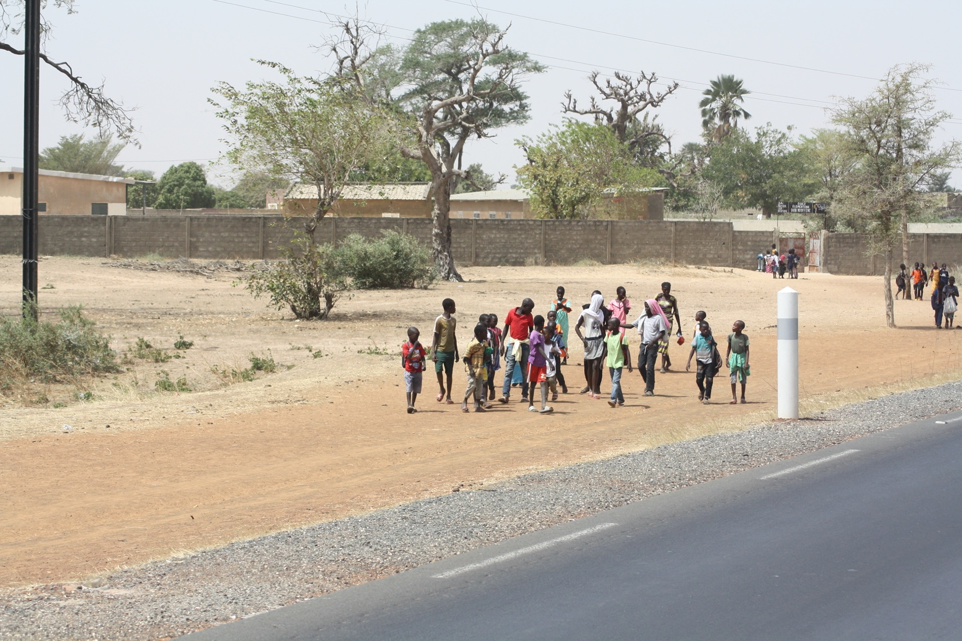 Am nächsten Morgen stehen in einiger Entfernung erst 3 Kinder, die sich aber schnell vervielfachen und je mehr sie werden um so näher trauen sie sich an den Moggel ran. Ist witzig zu beobachten! Wir machen uns startklar für den Grenzübertritt nach Guinea. Zur Abfahrt haben wir dann 20 Kinder winkend neben dem Moggel stehen. Der Grenzposten vom Senegal liegt im Ort Dialadian, aber noch fünf Kilometer von der wirklichen Grenze entfernt. Das Dorf macht den Eindruck, als sei es das am wenigsten entwickelste Dorf, von denen die wir bisher gesehen haben. Es hat die einfachen Rundhäuser mit schilfartigen Dächern überall brennen kleine Feuer, sogar mitten auf der Durchfahrtstraße. Es ist allerdings auch erst viertel vor neun.