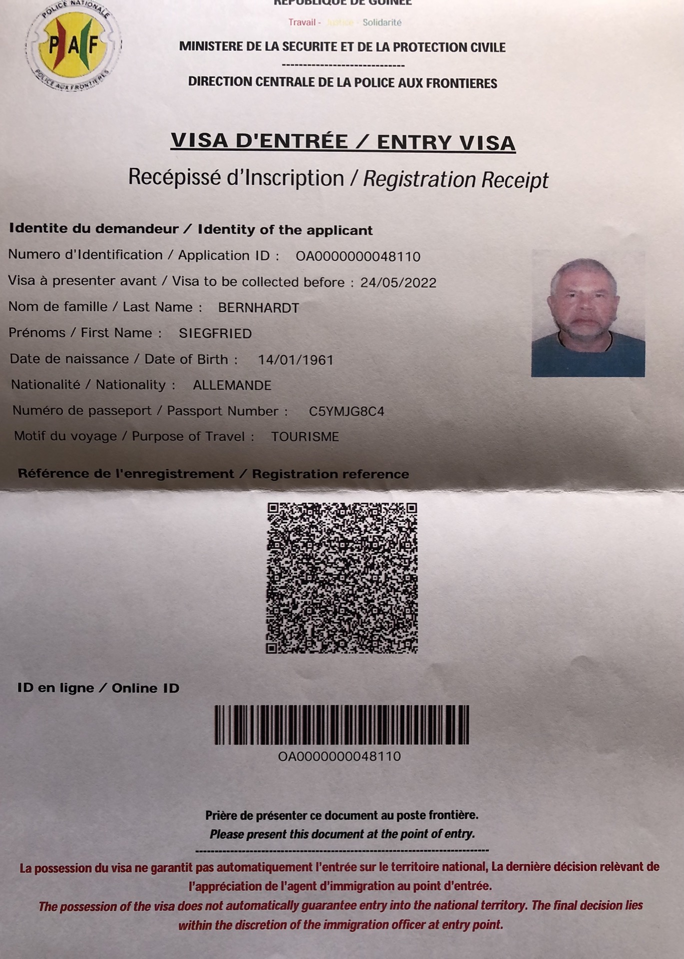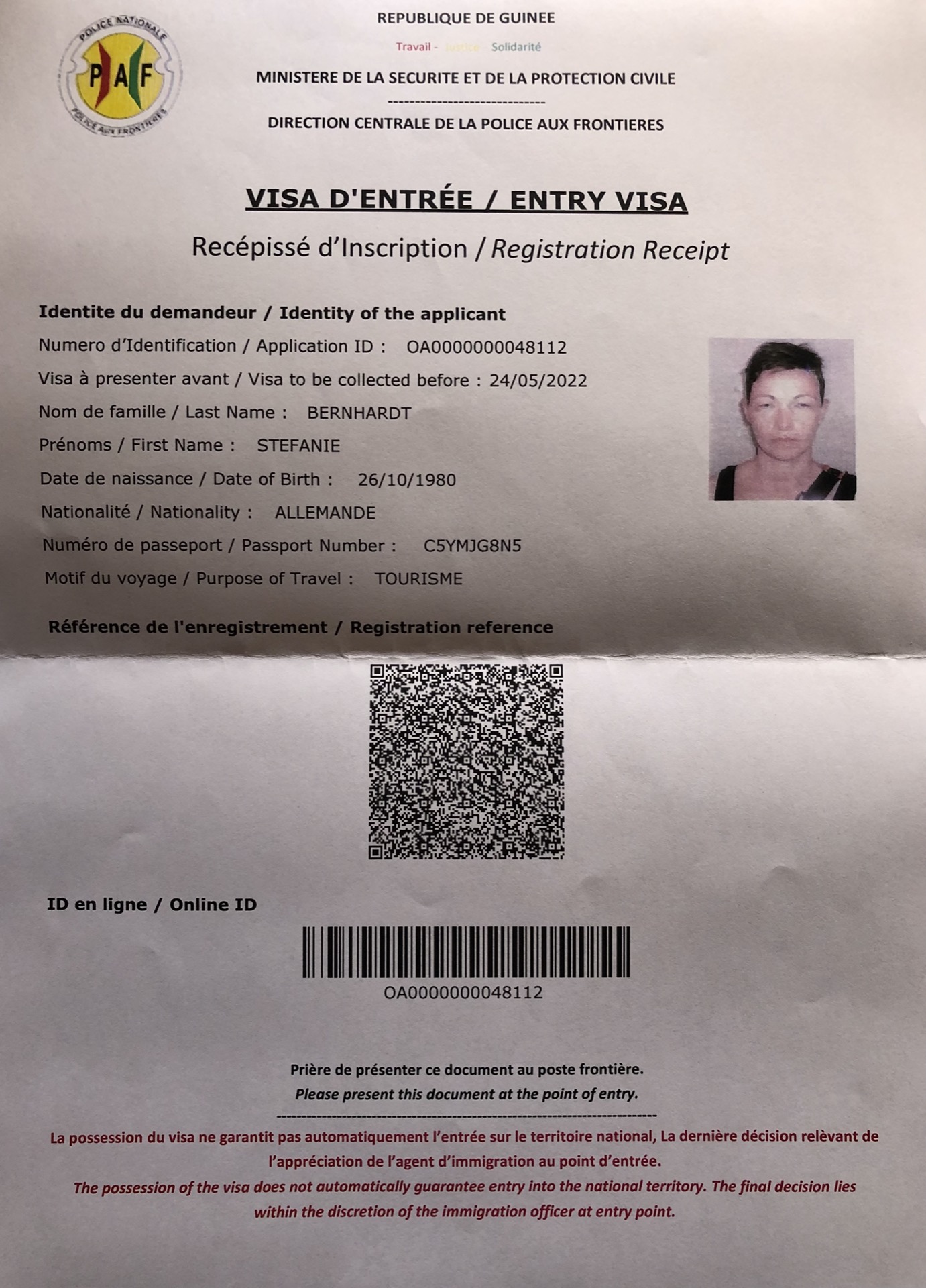 Fix und fertig kommen wir in Dakar an und wieder mal ist Marc unser „Retter“. Wir können nochmal im Hof der Werkstatt stehen. Es gibt zum Abschluss des Tages was zu Essen und dann ab ins Bett. Am nächsten Morgen gibt uns Marc einen seiner Mitarbeiter mit, um auf die Botschaft Guineas und Cotê d’Ivoire zu fahren. Cotê d’Ivoire geht relativ schnell, da wir nicht mit dem Flugzeug einreisen möchten, sondern auf dem Landweg, gibt es zur Zeit kein Visa wegen Corona. Hmm, was ist der Unterschied zwischen Flugreisenden und denen die auf dem Landweg unterwegs sind?? Dazu gibt es keine Antwort! Auf der Botschaft von Guinea verbringen wir ca. drei Stunden. Wir erklären was wir an der senegalesichen Grenze von der Polizei erklärt bekommen haben und werden ungläubig angeschaut. Laut aktuellen Gesetzen müssen die Visa elektronisch beantragt werden und es gibt keine Stempel mehr in den Pass. Okay, der Mitarbeiter auf der Botschaft erstellt uns das elektronische Visa. Dazu benötigen wir auch noch ein Bild von uns, das wird kurzer Hand im Nebenraum erstellt. Ich muss echt an mich halten, um nicht laut los zu lachen, als ich die Fotos überreicht bekomme. Wir sehen aus als hätten wir die ganze Nacht gekifft, gesoffen und nicht geschlafen, na super. Es dauert dann noch einige Zeit bis unsere Daten im PC eingegeben werden, der Kollege hat ein Augenproblem und ist zu stolz eine Brille zu tragen. Er liest die Daten von unseren Pässen mit der Taschenlampe ab und muss meines dann leider noch mal neu ausdrucken, da er meinen Geburtstag um zwei Tage vorverlegt hat. Aber wir haben ein Visum für Guinea! Jiiihaaa.