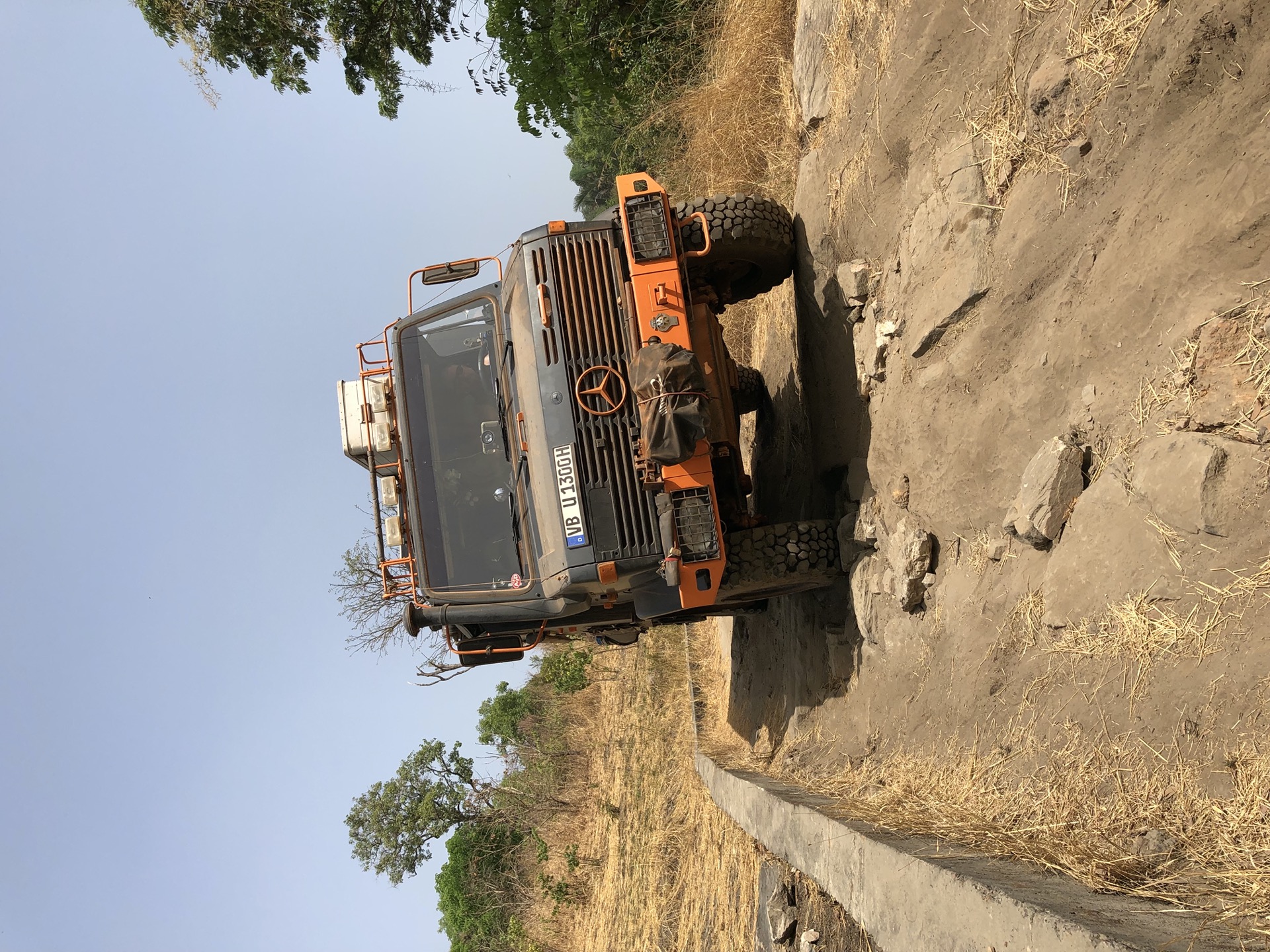 Ungefähr 2 Kilometer vor unserem Ziel lag noch ein Dorf und ausgerechnet als wir dort vorbei fahren, stehen da 2 Typen rum. Die sehen nicht so Vertrauens erweckend aus. Der Ältere spricht uns an, er sei der Ranger und wir müssten bezahlen, dann zeigt er uns den Wasserfall. Auf Siggis Nachfrage, wo denn seine Uniform und sein Ausweis ist, gibt er keine wirkliche Antwort. Wir fahren einfach weiter, nur leider rennen uns die beiden nach und lassen nicht locker, sie wollen Geld. Aber nicht von uns. Wir stehen ca. 10 Minuten an einer Stelle am Wasser und da fangen die doch tatsächlich an den Müll der dort rum liegt zusammen zu sammeln. Das haben wir auch noch nicht erlebt. Von unserer Park4Night App wissen wir, dass schon mal jemand hier übernachtet hat. Wir suchen die Koordinaten. Der Platz ist gleich um die Ecke, aber die beiden Gestallten wollen einfach nicht weggehen. Als die sich noch vor uns stellen und pinkeln, sind wir uns sicher wir fahren weiter durch den Fluß auf die andere Uferseite.