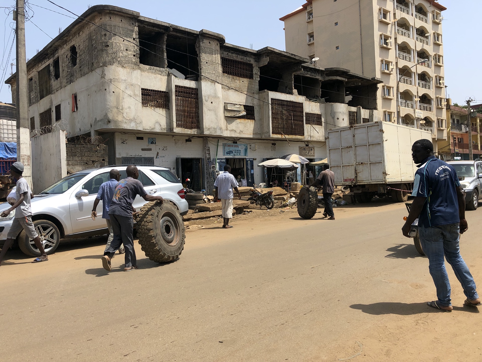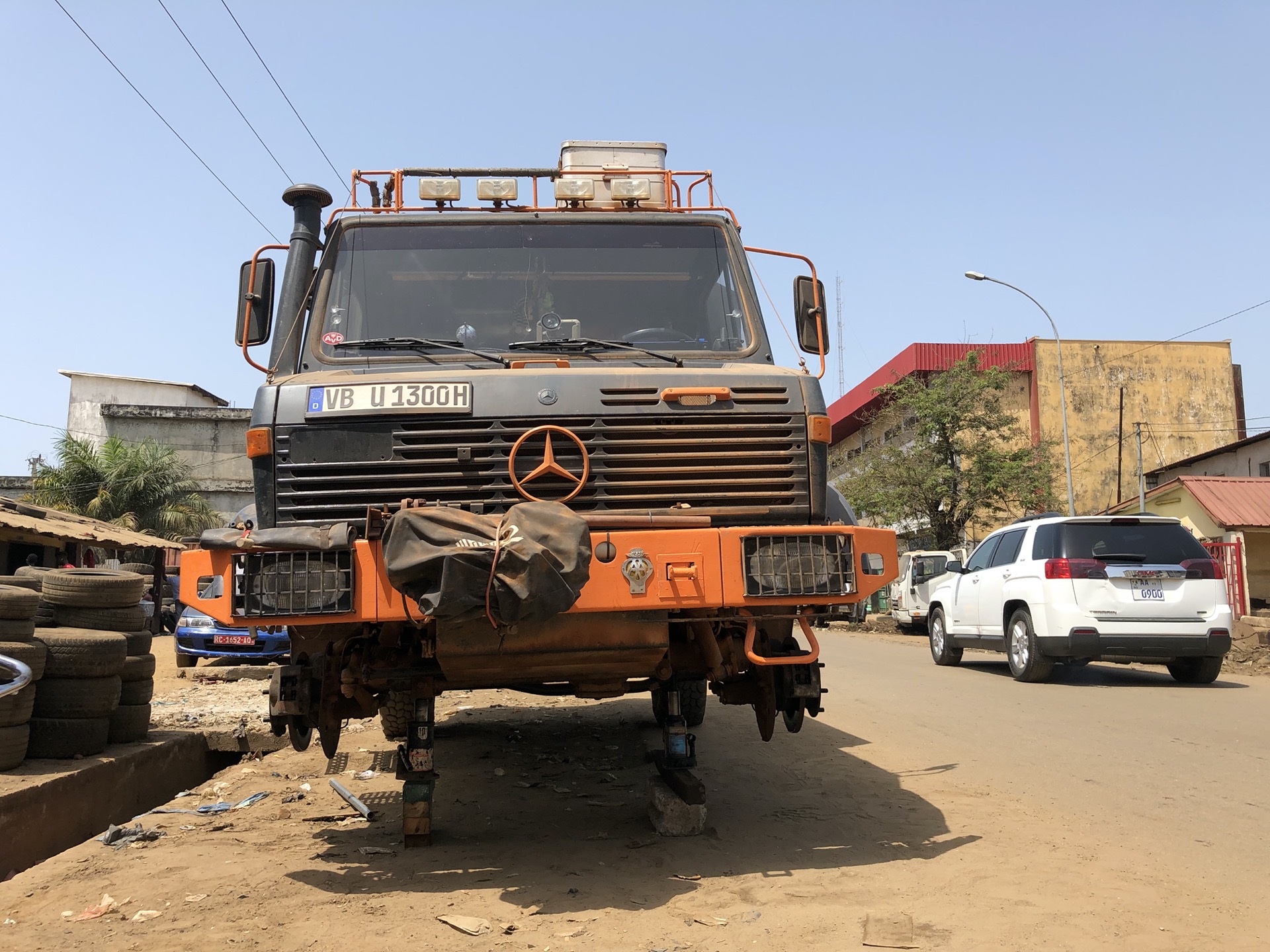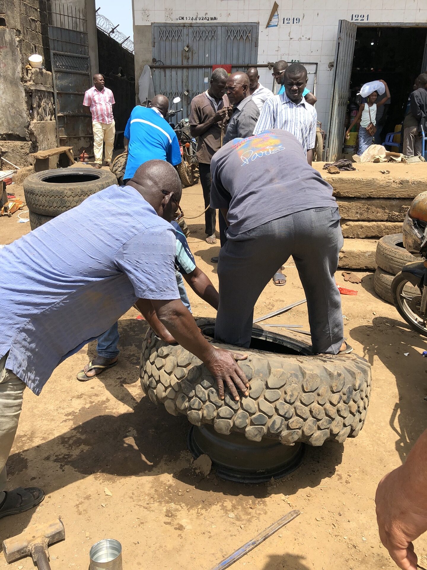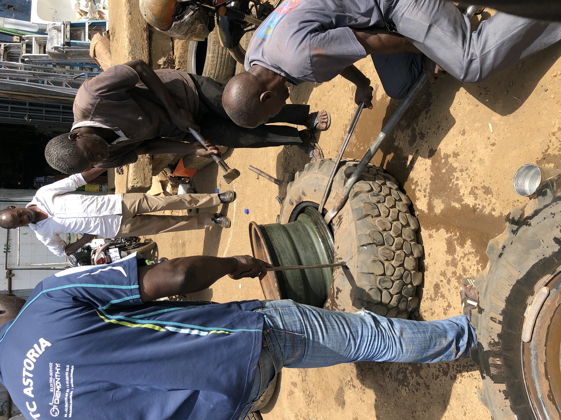 Wir haben Conakry mit dem Visum für die Elfenbeinküste hinter uns gelassen und sind auf dem Weg nach Süden. Vorher haben wir noch die Vorderreifen in der „Autostrasse“ von rechts nach links und umgekehrt tauschen lassen. Von mehreren Werkstätten wurde uns versichert, eine Maschine dafür gibt es in ganz Guinea nicht und auswuchten schon mal gar nicht. Also wurde das Ganze dann doch wie überall zu unserer aller Leidwesen mit Vorschlaghammer und Brechstange erledigt.
