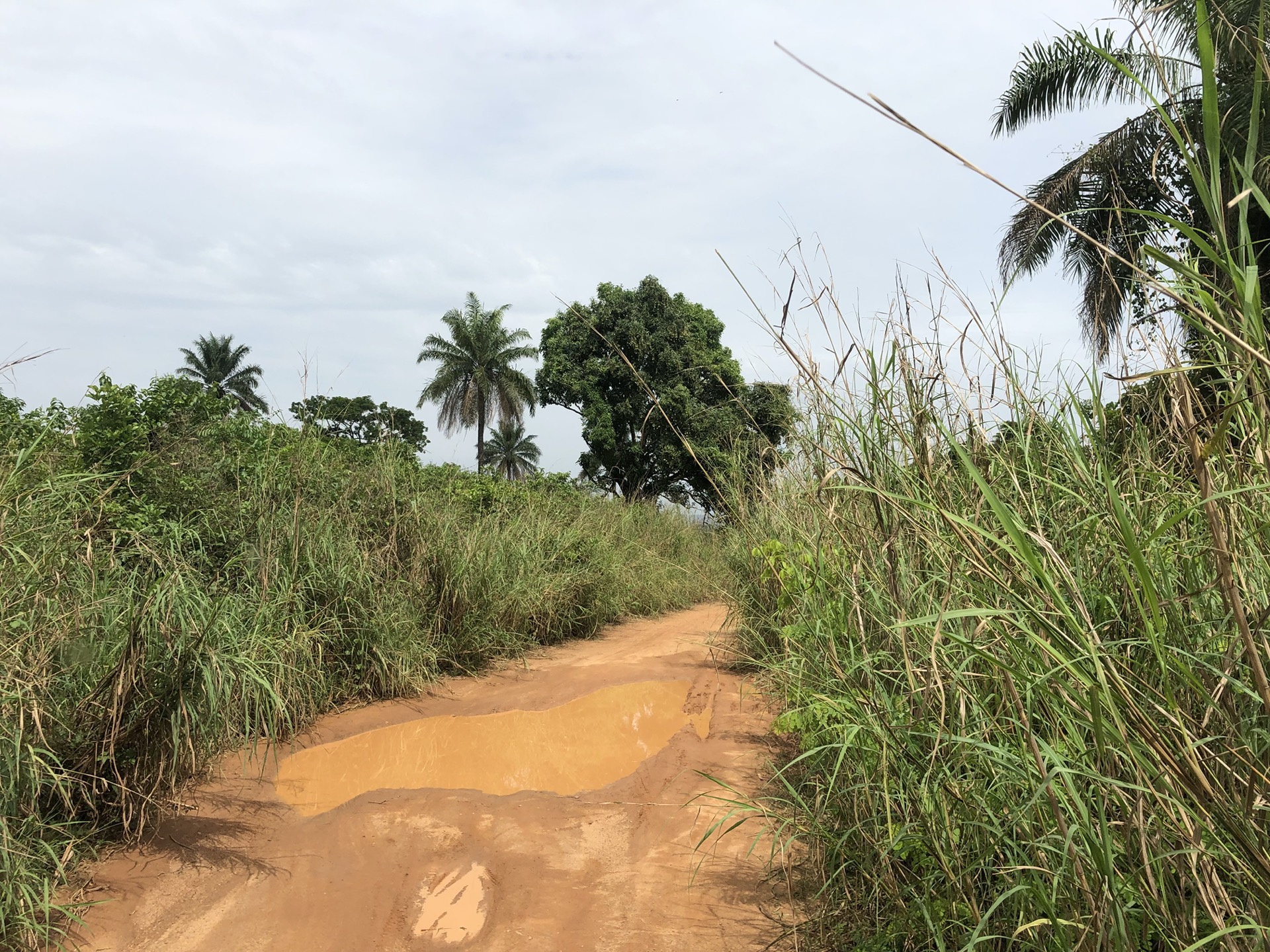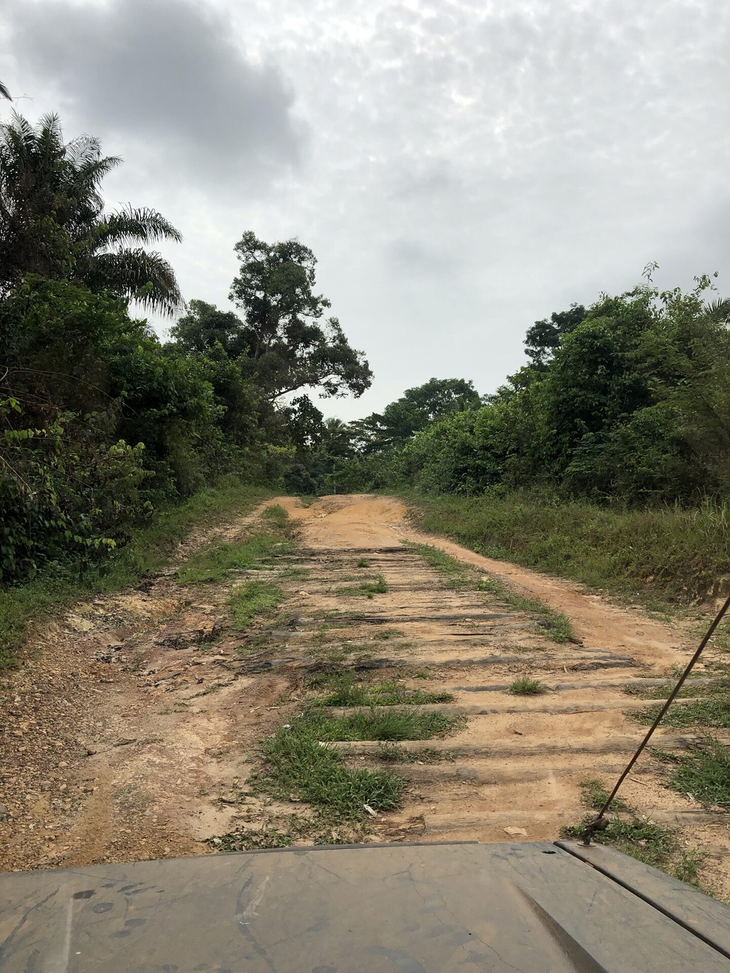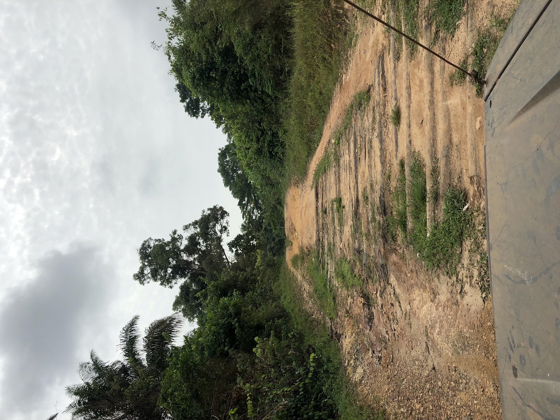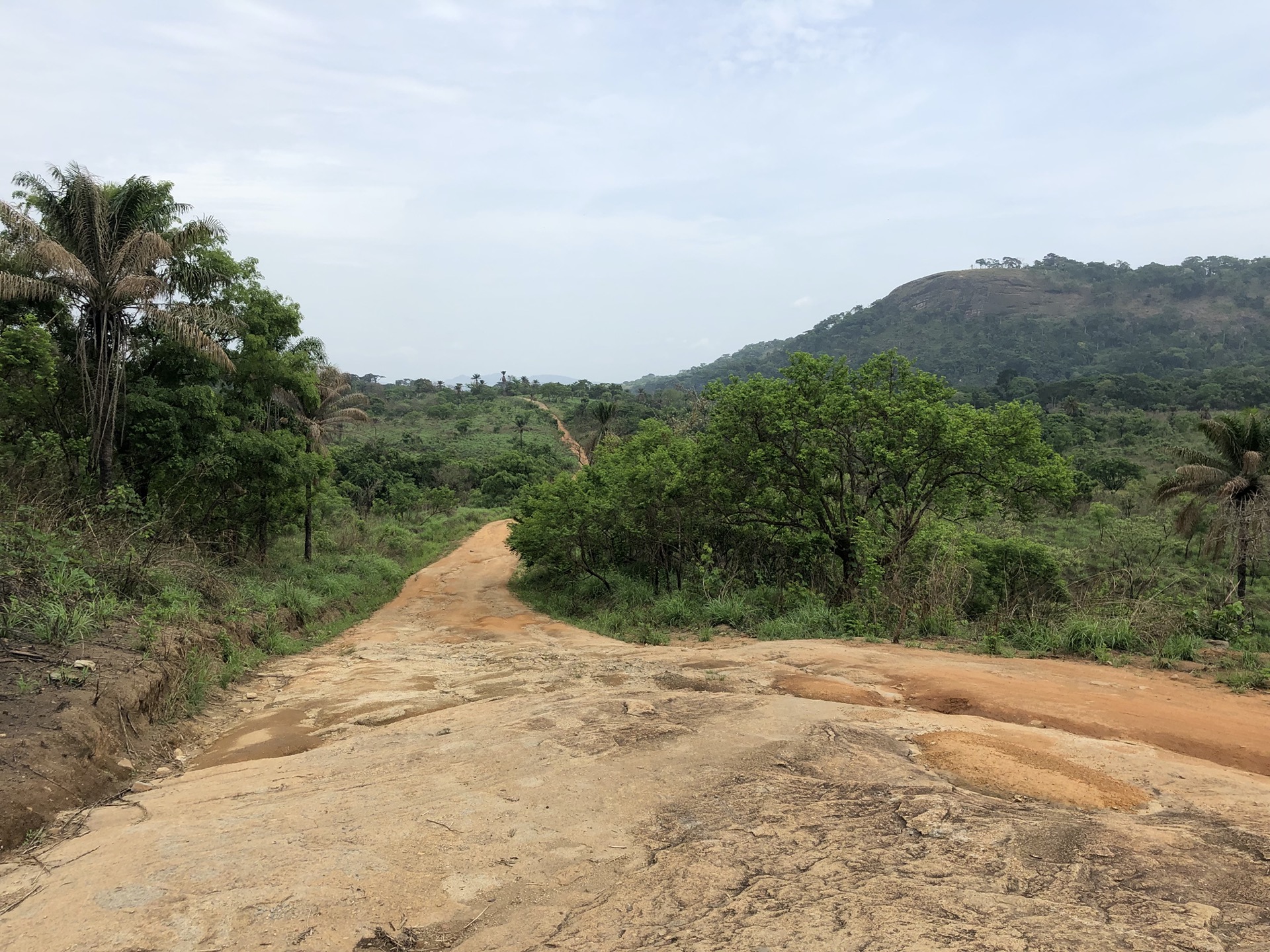 Das Landschaftsbild hat sich relativ „plötzlich“ gewandelt. Endlich sind die Bäume mal richtig saftig grün, wieder richtig groß und nicht komplett unter rotem Sandstaub begraben. Auch haben die Menschen in ihren „Vorgärten“ nicht mehr nur gestampften Boden, sondern kleine Büsche oder auch sowas wie Grünfläche. Das sieht nicht nur schön aus, irgendwie hab ich das sogar vermisst. Also das ganze Grün in den verschiedenen Tönen. Die Strasse ist eigentlich asphaltiert, aber besteht zum größten Teil aus Schlaglöchern mit unglaublichen Ausmaßen und das alle paar Meter. Die Nächte sind erfrischender und auch am Tag ist es laut Thermometer nicht mehr so warm, dafür haben wir jetzt eine deutlich erhöhte Luftfeuchtigkeit, was es nicht unbedingt leichter macht. Uns läuft das Wasser aus allen Poren beim nichts Tun. Gut, dass ich so viele kleine „Gästehandtücher“ mitgenommen habe. Nachdem wir mal einen Tag perfekten Asphalt hatten, habe ich in unserer App eine Strecke gefunden, die sich Route de Cafe nennt und auch noch 30 Km kürzer ist als die N2. Die ersten paar Kilometer war die Piste auch sehr gut zu fahren, doch dann kamen die üblichen Steine, Stufen und teilweise breite Spalten im Boden dazu.