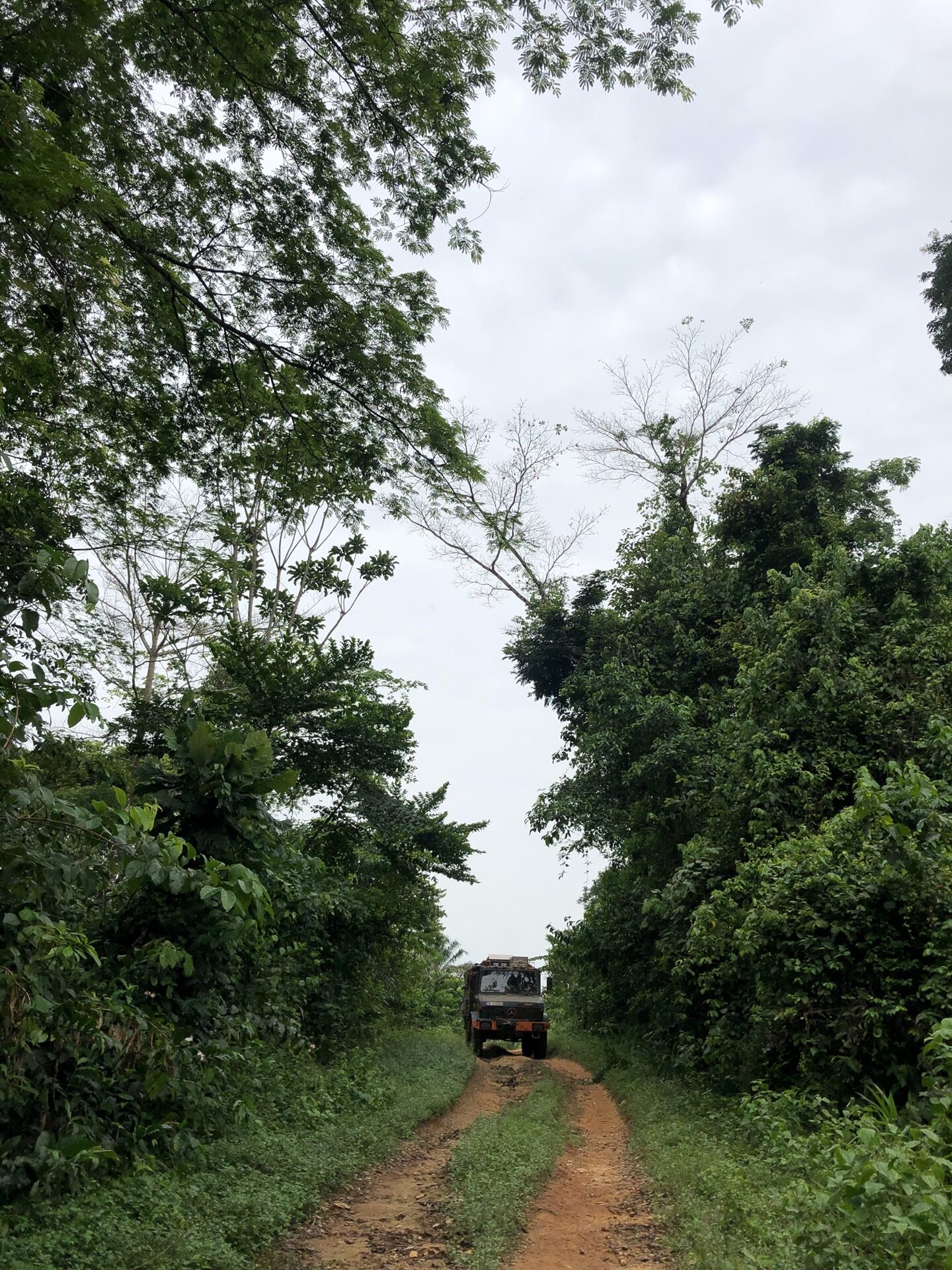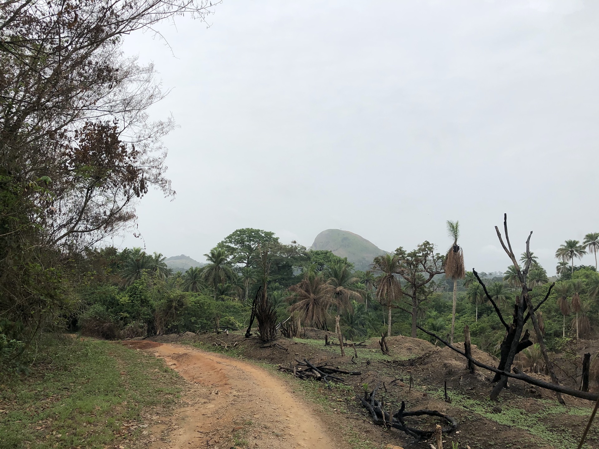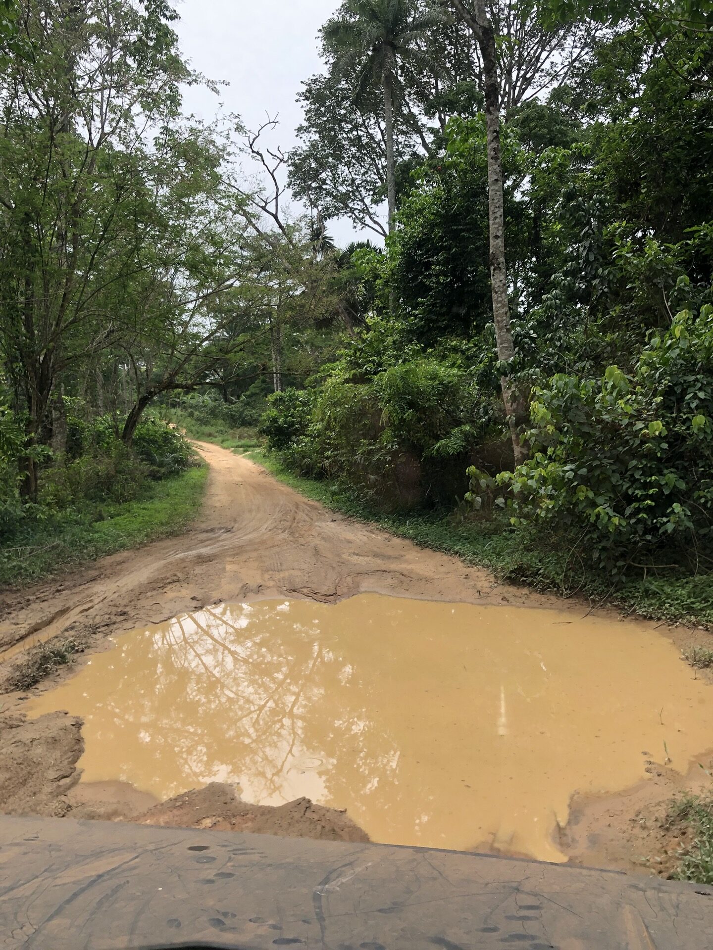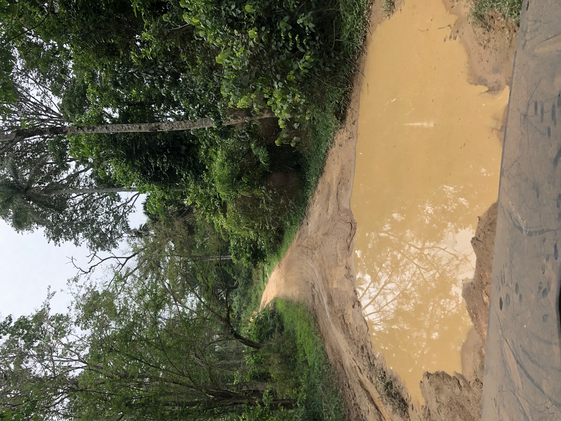Das Landschaftsbild hat sich relativ „plötzlich“ gewandelt. Endlich sind die Bäume mal richtig saftig grün, wieder richtig groß und nicht komplett unter rotem Sandstaub begraben. Auch haben die Menschen in ihren „Vorgärten“ nicht mehr nur gestampften Boden, sondern kleine Büsche oder auch sowas wie Grünfläche. Das sieht nicht nur schön aus, irgendwie hab ich das sogar vermisst. Also das ganze Grün in den verschiedenen Tönen. Die Strasse ist eigentlich asphaltiert, aber besteht zum größten Teil aus Schlaglöchern mit unglaublichen Ausmaßen und das alle paar Meter. Die Nächte sind erfrischender und auch am Tag ist es laut Thermometer nicht mehr so warm, dafür haben wir jetzt eine deutlich erhöhte Luftfeuchtigkeit, was es nicht unbedingt leichter macht. Uns läuft das Wasser aus allen Poren beim nichts Tun. Gut, dass ich so viele kleine „Gästehandtücher“ mitgenommen habe. Nachdem wir mal einen Tag perfekten Asphalt hatten, habe ich in unserer App eine Strecke gefunden, die sich Route de Cafe nennt und auch noch 30 Km kürzer ist als die N2. Die ersten paar Kilometer war die Piste auch sehr gut zu fahren, doch dann kamen die üblichen Steine, Stufen und teilweise breite Spalten im Boden dazu.