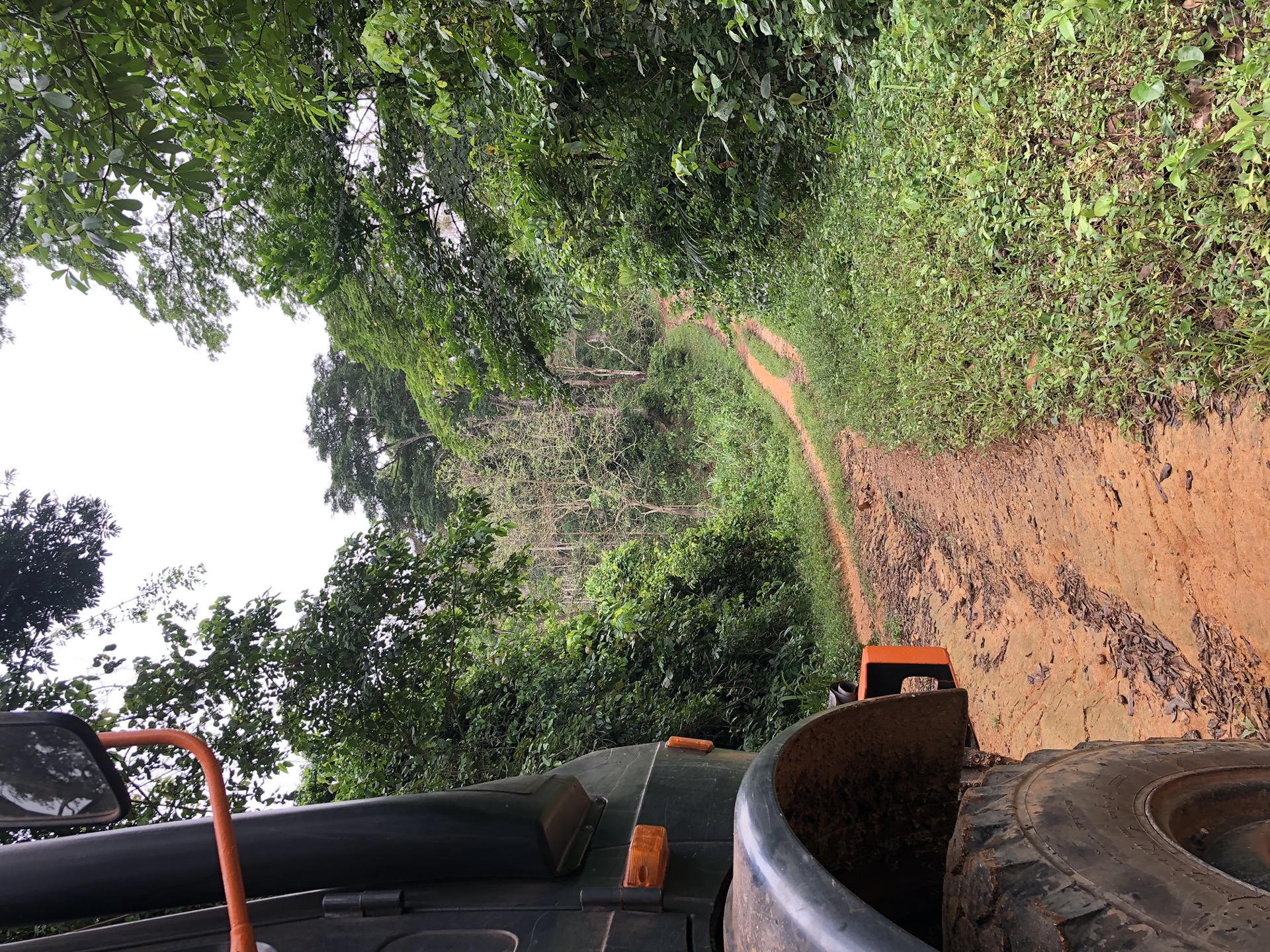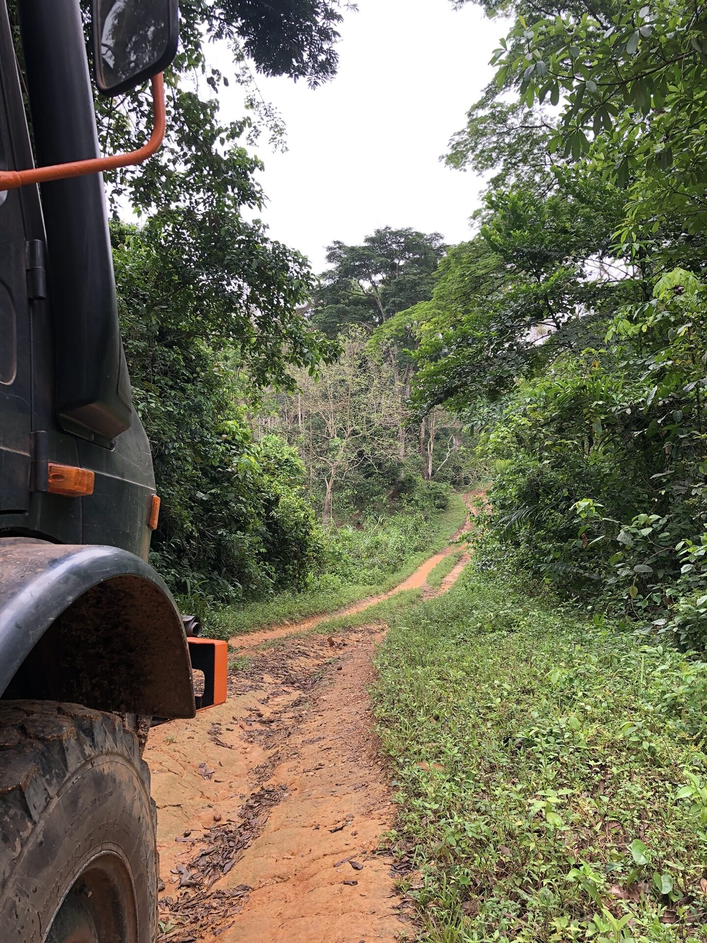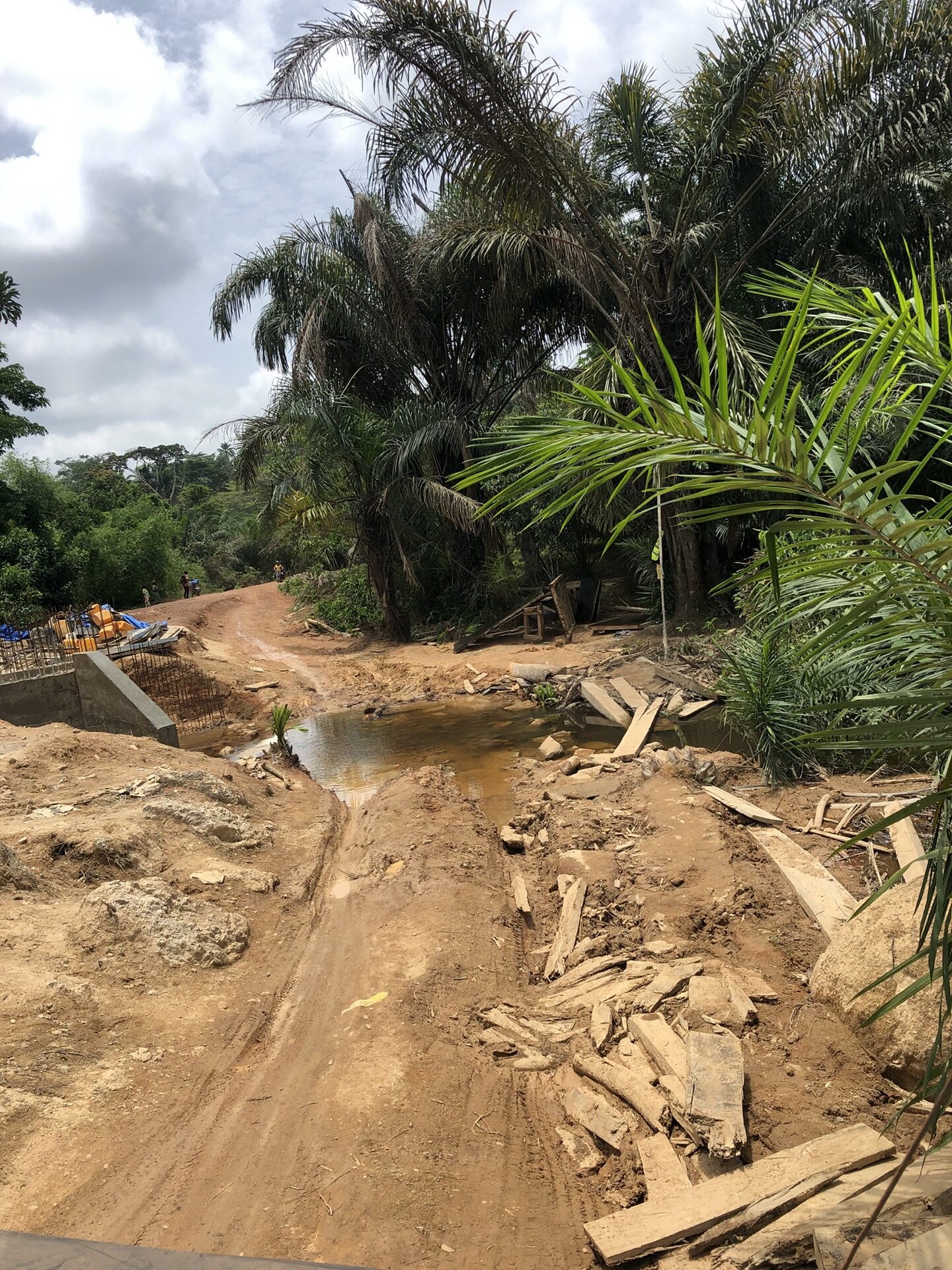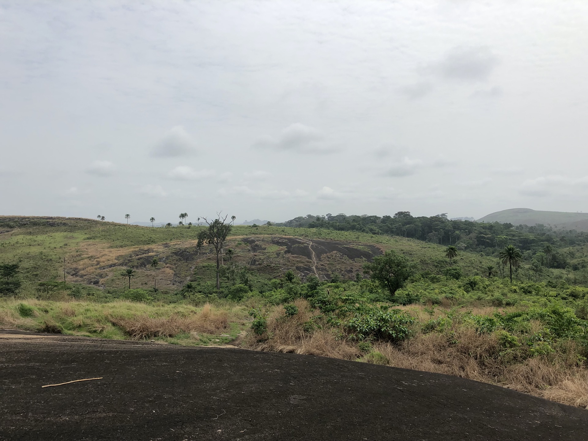 Das Landschaftsbild hat sich relativ „plötzlich“ gewandelt. Endlich sind die Bäume mal richtig saftig grün, wieder richtig groß und nicht komplett unter rotem Sandstaub begraben. Auch haben die Menschen in ihren „Vorgärten“ nicht mehr nur gestampften Boden, sondern kleine Büsche oder auch sowas wie Grünfläche. Das sieht nicht nur schön aus, irgendwie hab ich das sogar vermisst. Also das ganze Grün in den verschiedenen Tönen. Die Strasse ist eigentlich asphaltiert, aber besteht zum größten Teil aus Schlaglöchern mit unglaublichen Ausmaßen und das alle paar Meter. Die Nächte sind erfrischender und auch am Tag ist es laut Thermometer nicht mehr so warm, dafür haben wir jetzt eine deutlich erhöhte Luftfeuchtigkeit, was es nicht unbedingt leichter macht. Uns läuft das Wasser aus allen Poren beim nichts Tun. Gut, dass ich so viele kleine „Gästehandtücher“ mitgenommen habe. Nachdem wir mal einen Tag perfekten Asphalt hatten, habe ich in unserer App eine Strecke gefunden, die sich Route de Cafe nennt und auch noch 30 Km kürzer ist als die N2. Die ersten paar Kilometer war die Piste auch sehr gut zu fahren, doch dann kamen die üblichen Steine, Stufen und teilweise breite Spalten im Boden dazu.