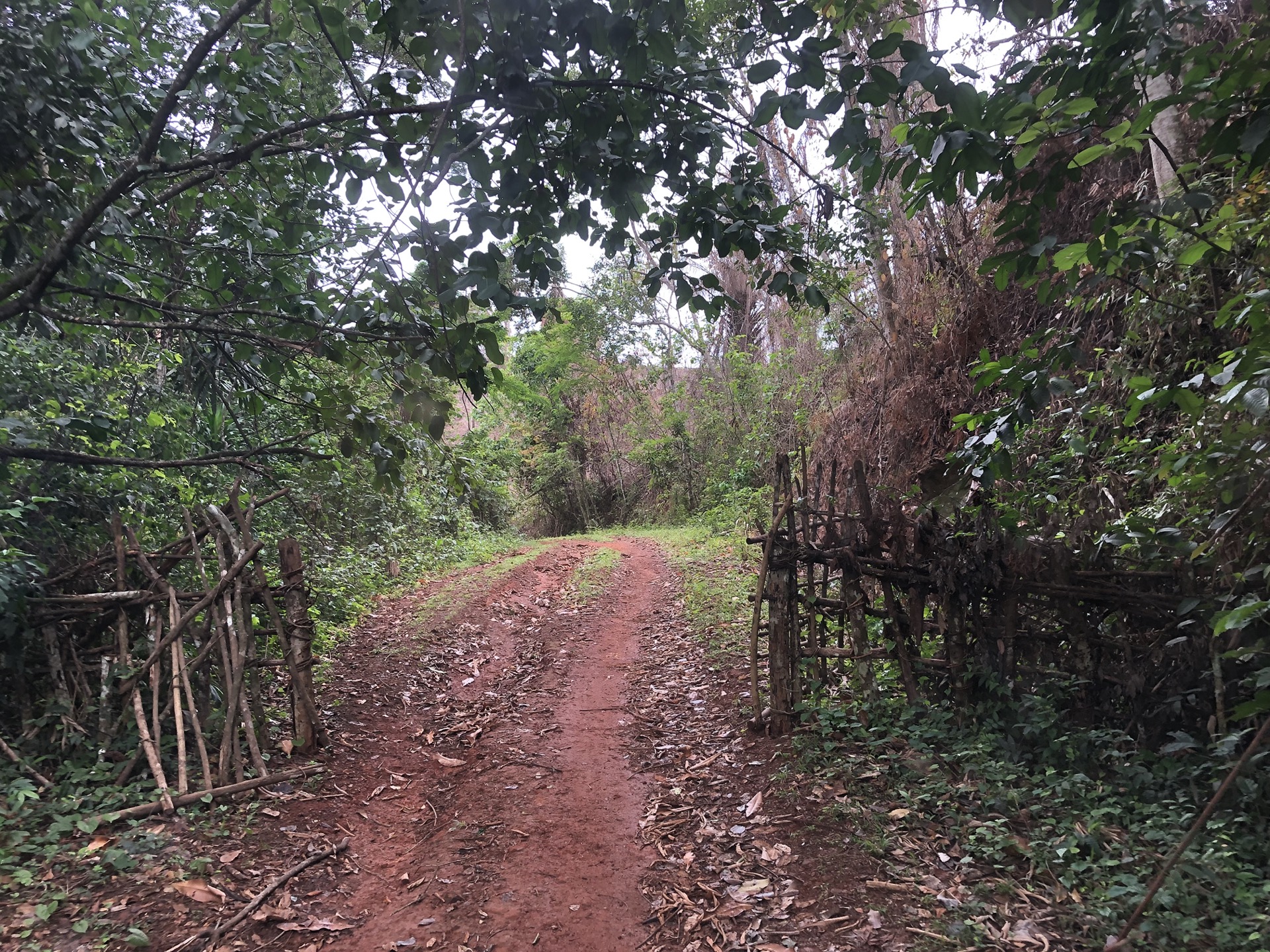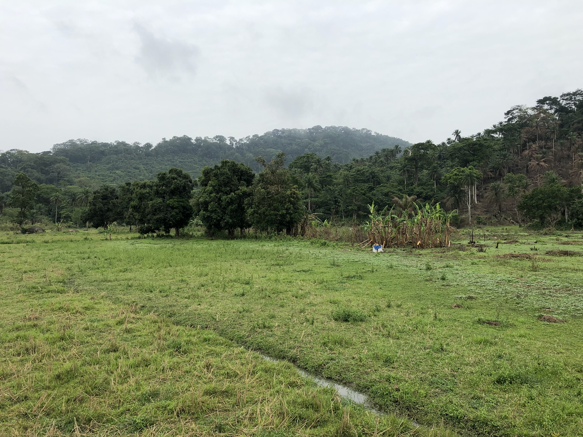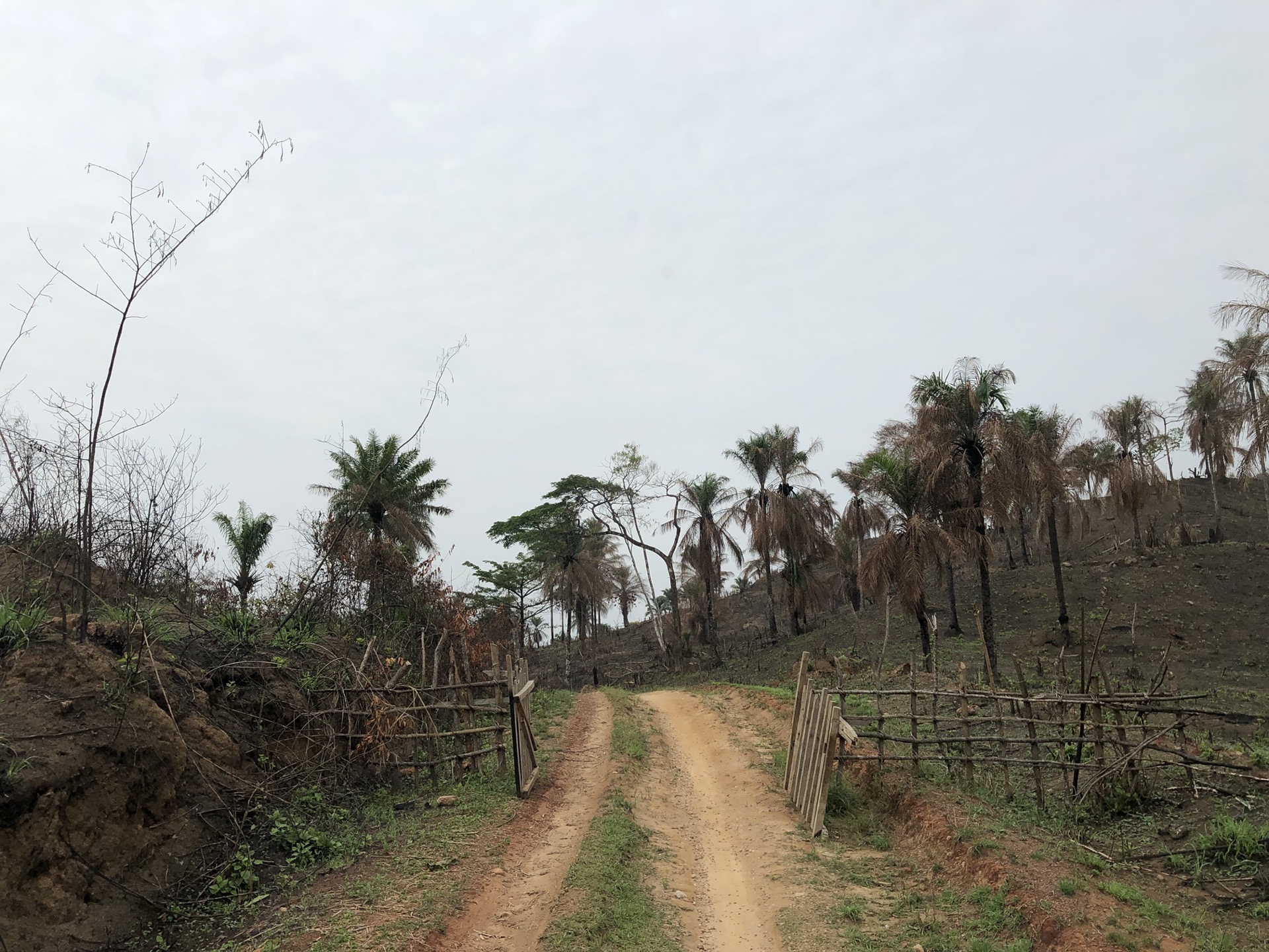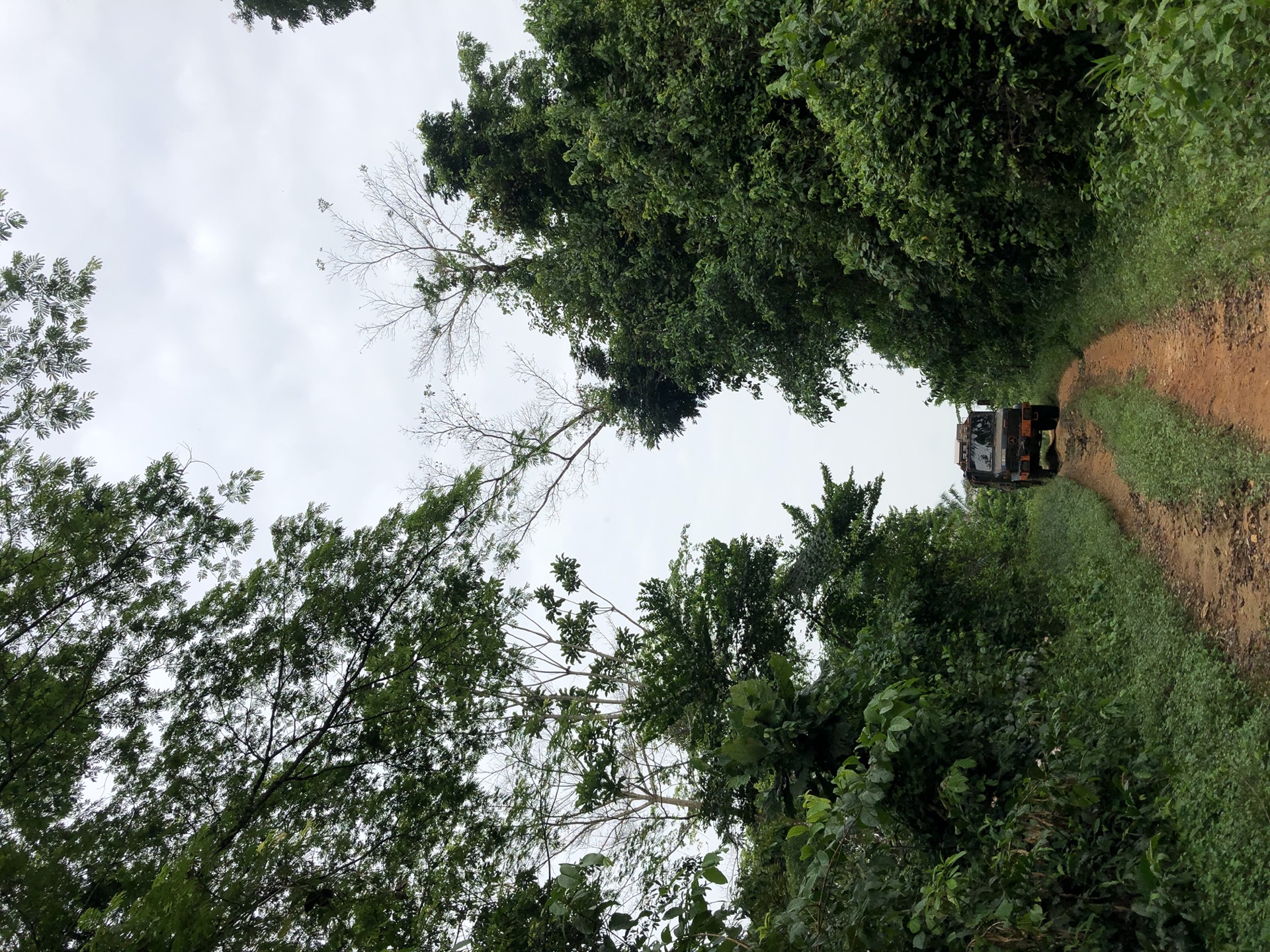 Das Landschaftsbild hat sich relativ „plötzlich“ gewandelt. Endlich sind die Bäume mal richtig saftig grün, wieder richtig groß und nicht komplett unter rotem Sandstaub begraben. Auch haben die Menschen in ihren „Vorgärten“ nicht mehr nur gestampften Boden, sondern kleine Büsche oder auch sowas wie Grünfläche. Das sieht nicht nur schön aus, irgendwie hab ich das sogar vermisst. Also das ganze Grün in den verschiedenen Tönen. Die Strasse ist eigentlich asphaltiert, aber besteht zum größten Teil aus Schlaglöchern mit unglaublichen Ausmaßen und das alle paar Meter. Die Nächte sind erfrischender und auch am Tag ist es laut Thermometer nicht mehr so warm, dafür haben wir jetzt eine deutlich erhöhte Luftfeuchtigkeit, was es nicht unbedingt leichter macht. Uns läuft das Wasser aus allen Poren beim nichts Tun. Gut, dass ich so viele kleine „Gästehandtücher“ mitgenommen habe. Nachdem wir mal einen Tag perfekten Asphalt hatten, habe ich in unserer App eine Strecke gefunden, die sich Route de Cafe nennt und auch noch 30 Km kürzer ist als die N2. Die ersten paar Kilometer war die Piste auch sehr gut zu fahren, doch dann kamen die üblichen Steine, Stufen und teilweise breite Spalten im Boden dazu.