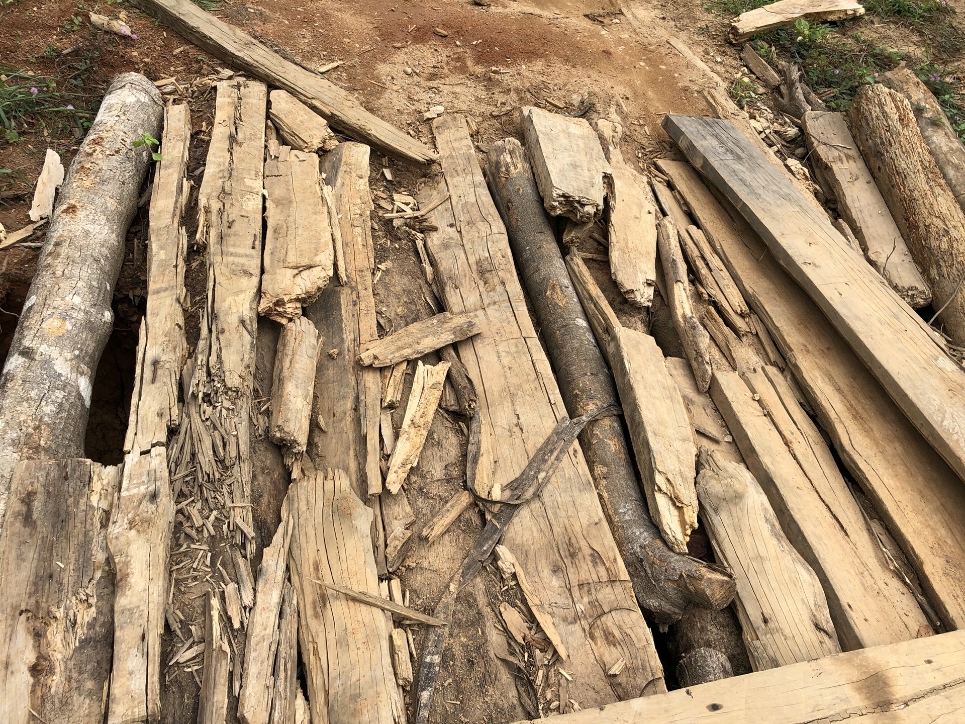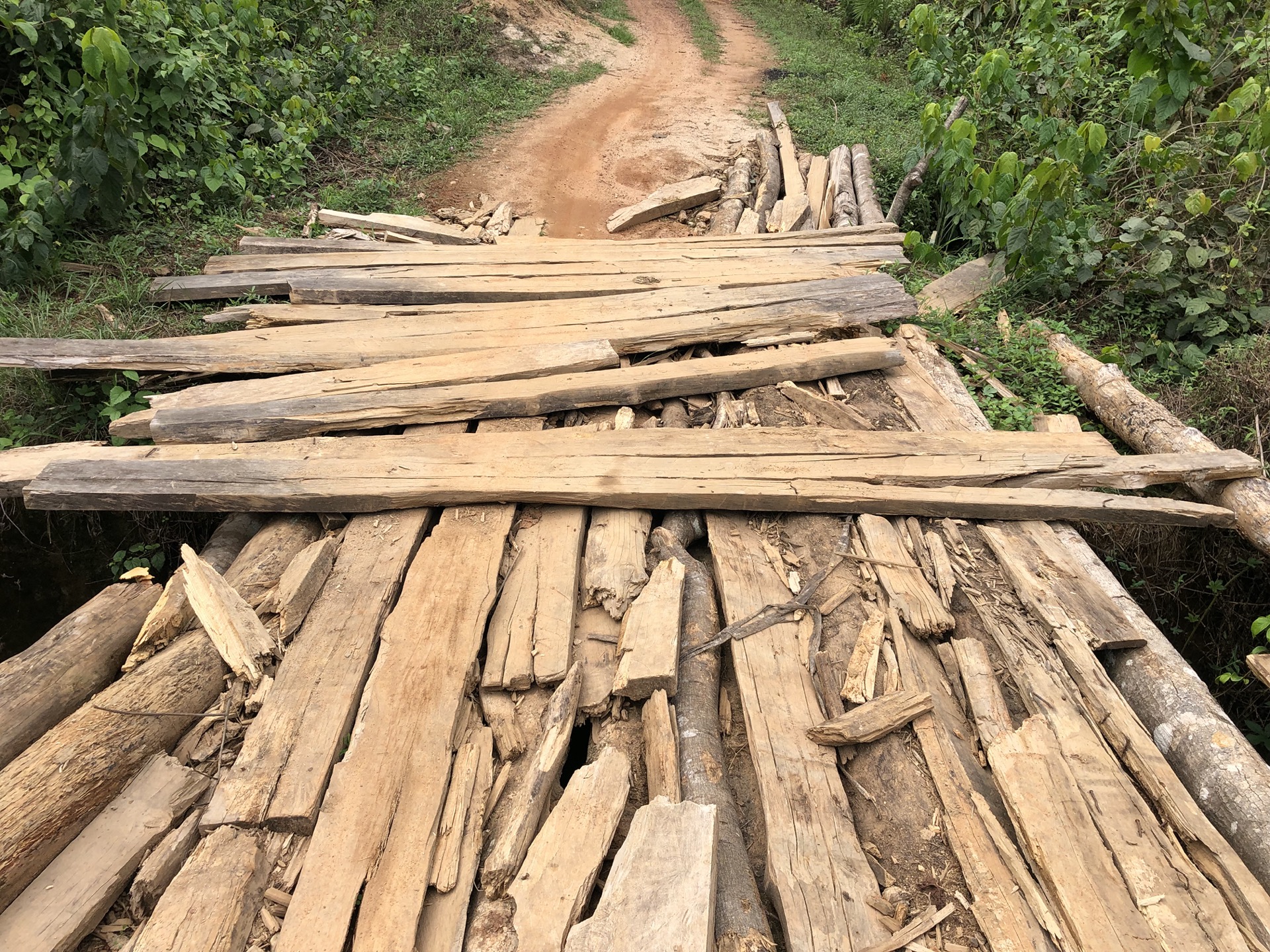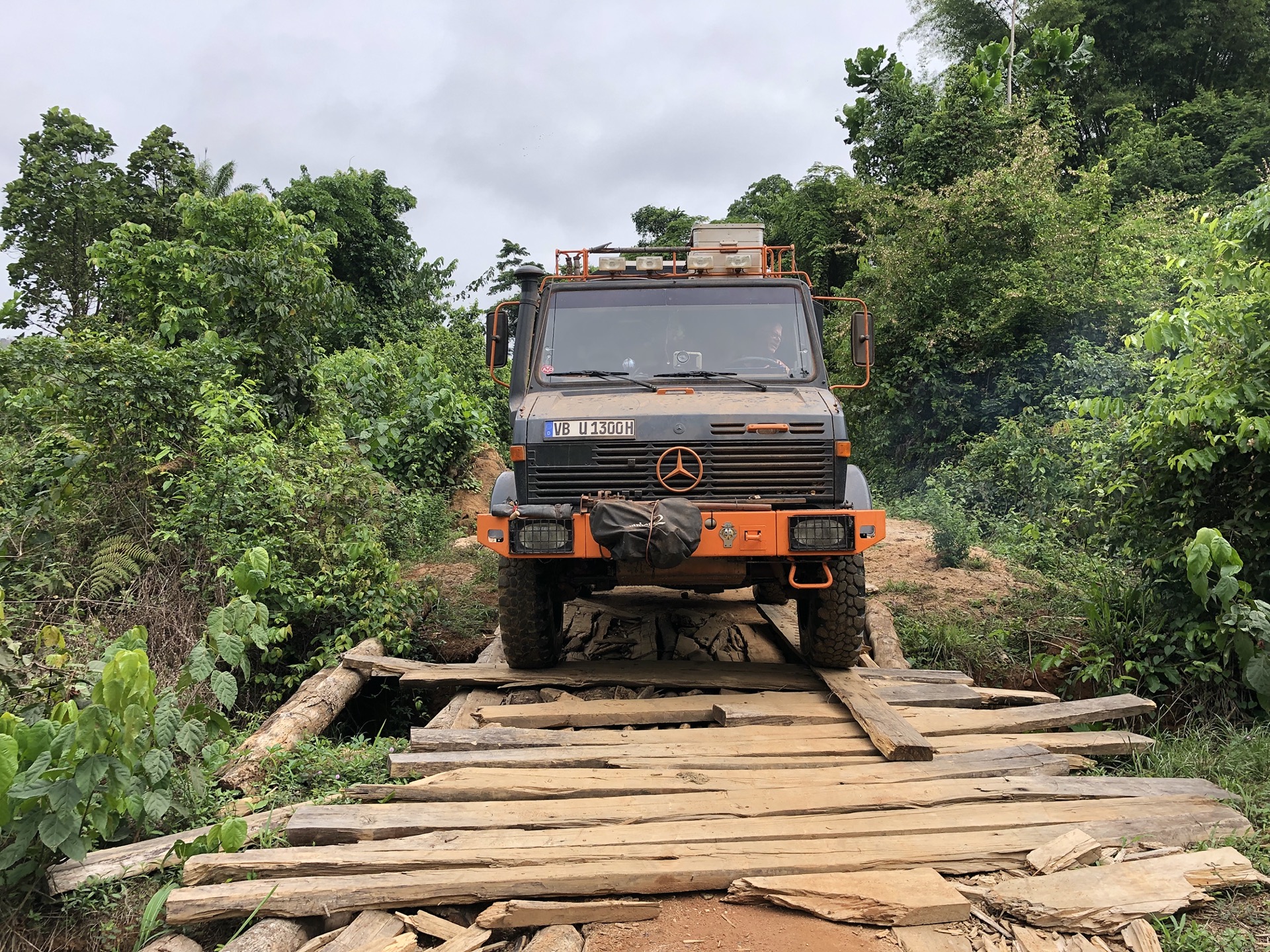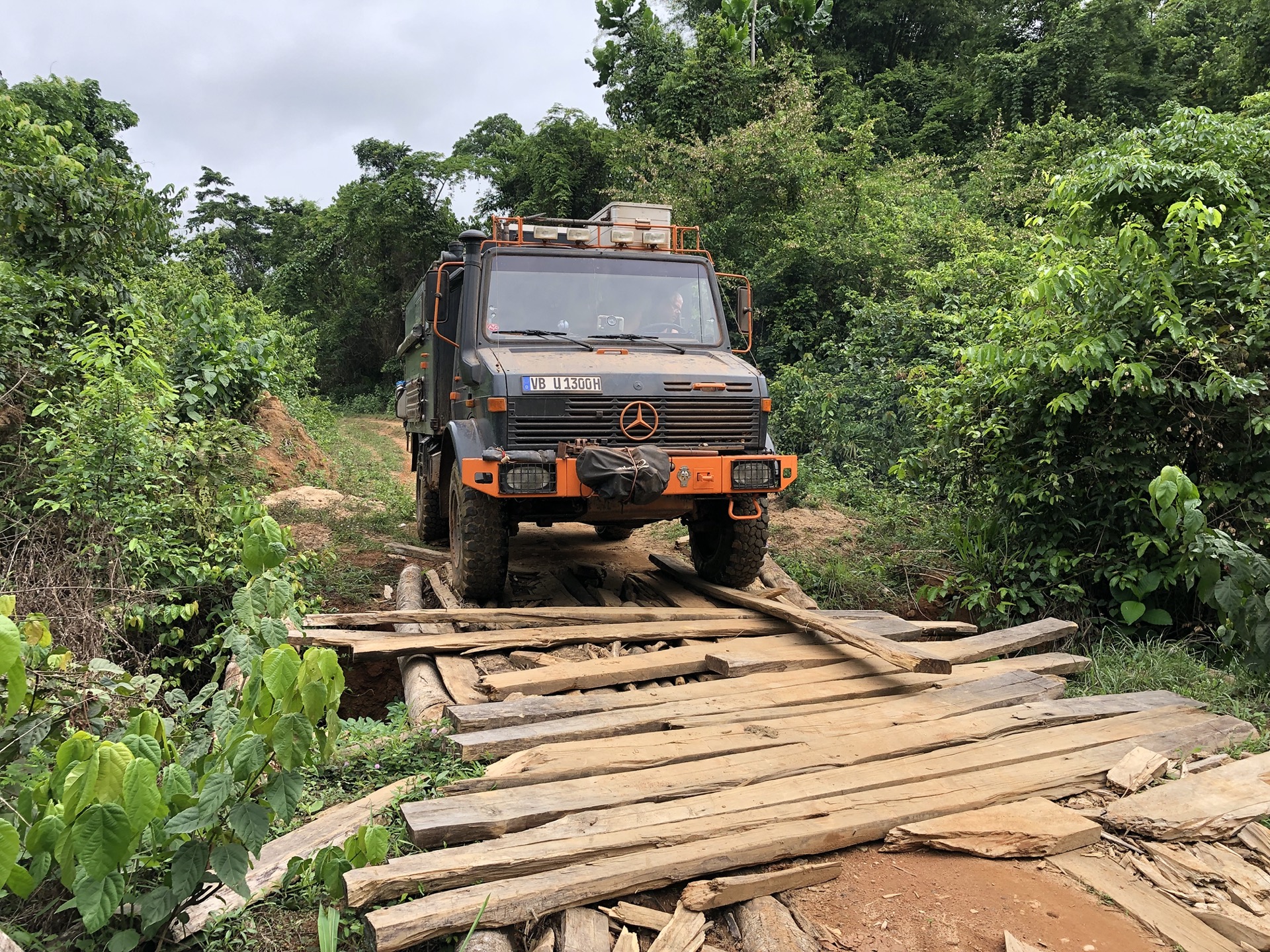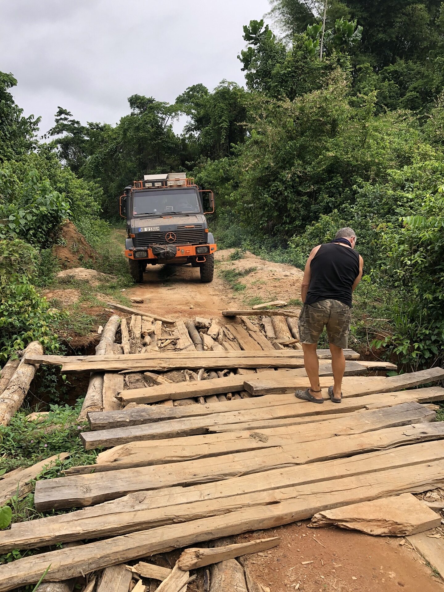 Wir müssen eine Holzbrücke passieren, die schon vor unserem Befahren nicht gut aussah. Siggi ist vorher ausgestiegen und hat ein paar Ausbesserungsarbeiten unternommen, damit der Moggel unbeschadet drüber fahren kann. Ich hab mir das Ganze von der anderen Seite angeschaut und hatte ein wenig Sorge, dass die Brücke hält. Als Siggi mit den Hinterreifen über den „Bretterhaufen“ fährt, sind fast alle in der Luft und es gibt einen mächtigen Knall als sie wieder runterfallen, doch die beiden haben es geschafft und wir können weiter fahren. Später wurden wir mal gefragt, wie wir über diese Brücke gekommen sind.