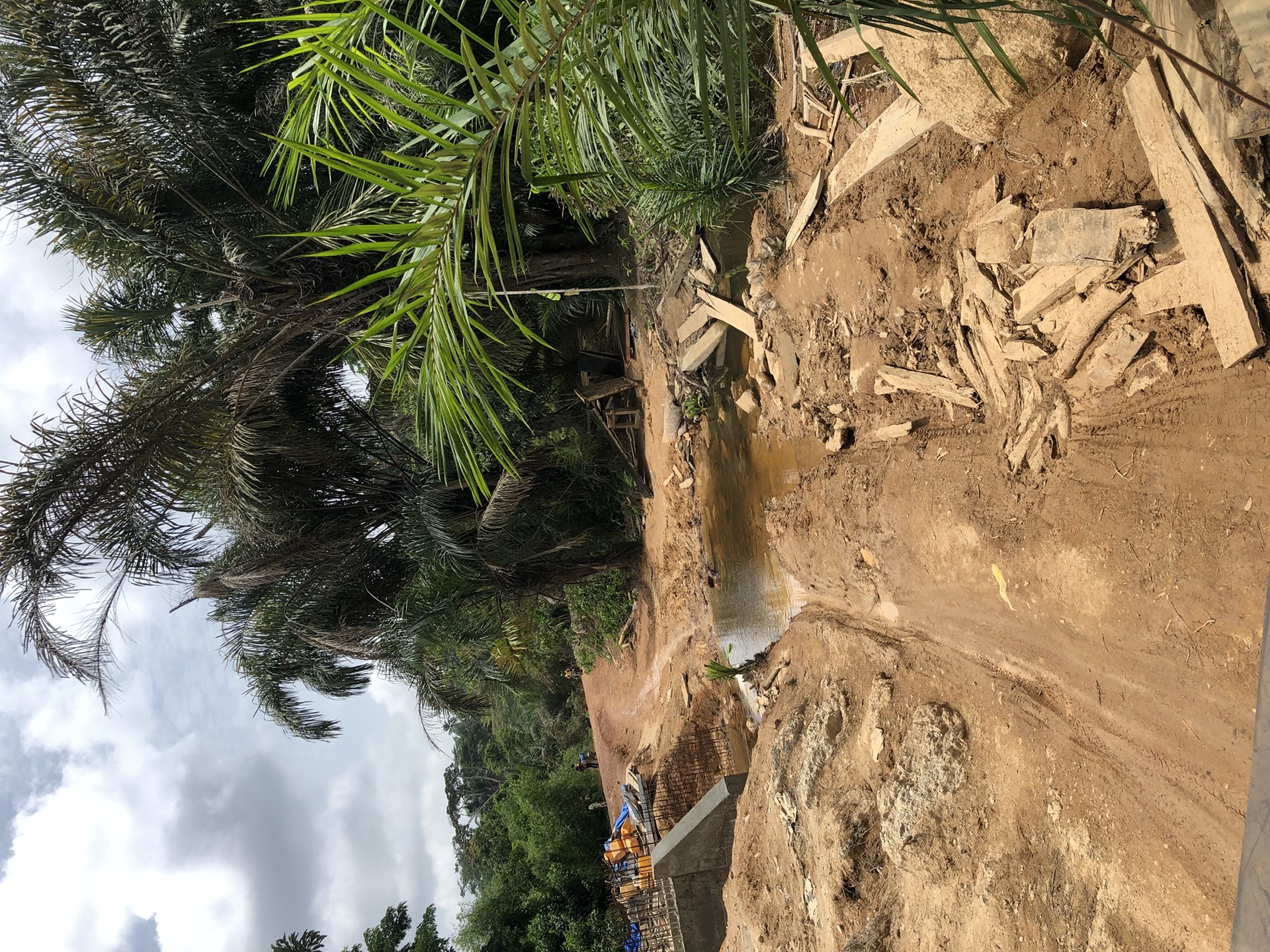 Da sind zum einen Palmölpalmen, Kautschuck Bäume, aber auch Felder mit Reis, Gemüse und Bananen dabei. Überall am Strassenrand sieht man Menschen, die die Palmölfrüchte zu Öl verkochen.