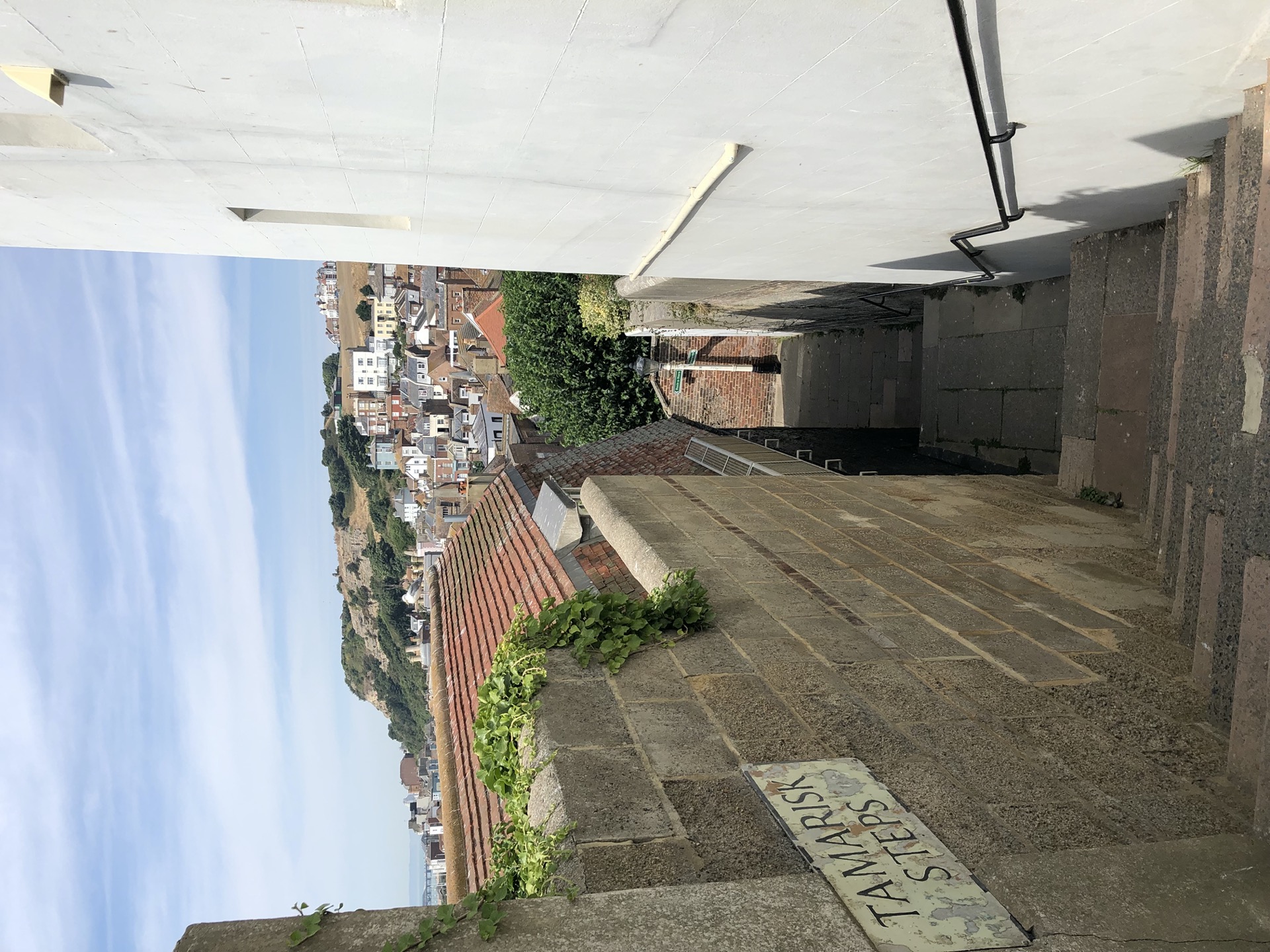 Es gibt eine Standseilbahn (die East Cliff Railway), sie ist wohl die steilste Standseilbahn Großbritanniens. Mit der kann man auf den East Hill fahren. Natürlich kann man auch über viele Stufen den East Hill erreichen. Ich bin über die Stufen nach oben gelaufen, habe den tollen Ausblick übers Meer, das Rock-a-Nore Viertel und die Altstadt bestaunt, ein paar Bilder gemacht und bin dann wieder nach unten, wo Siggi auf einer Bank im Rock-a-Nore Stadtteil, in der Nähe des Fischerei Museums gewartet hat.