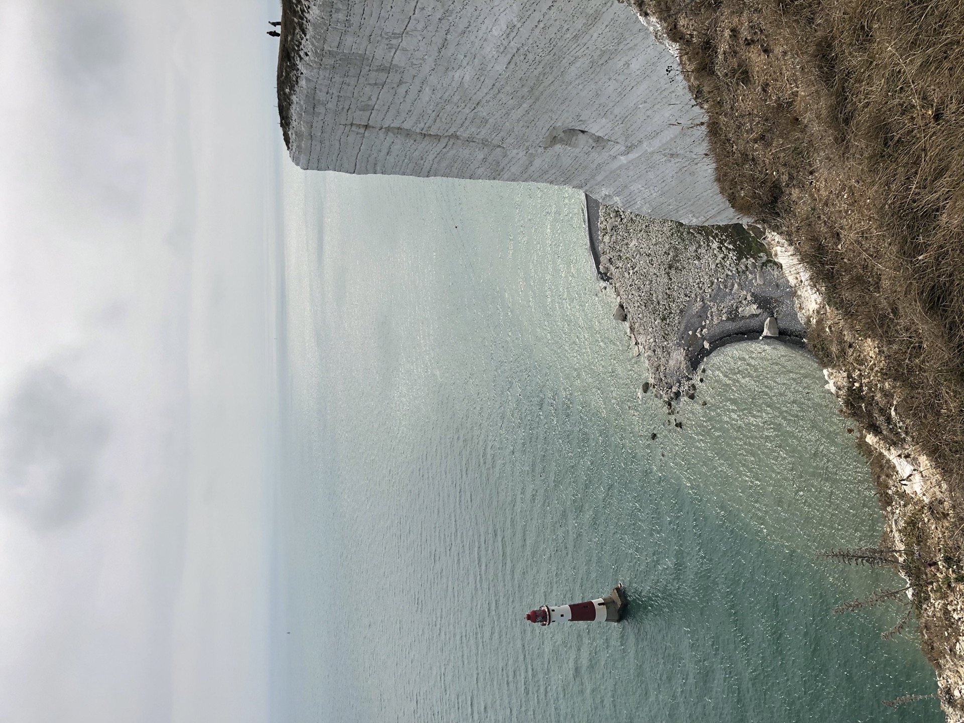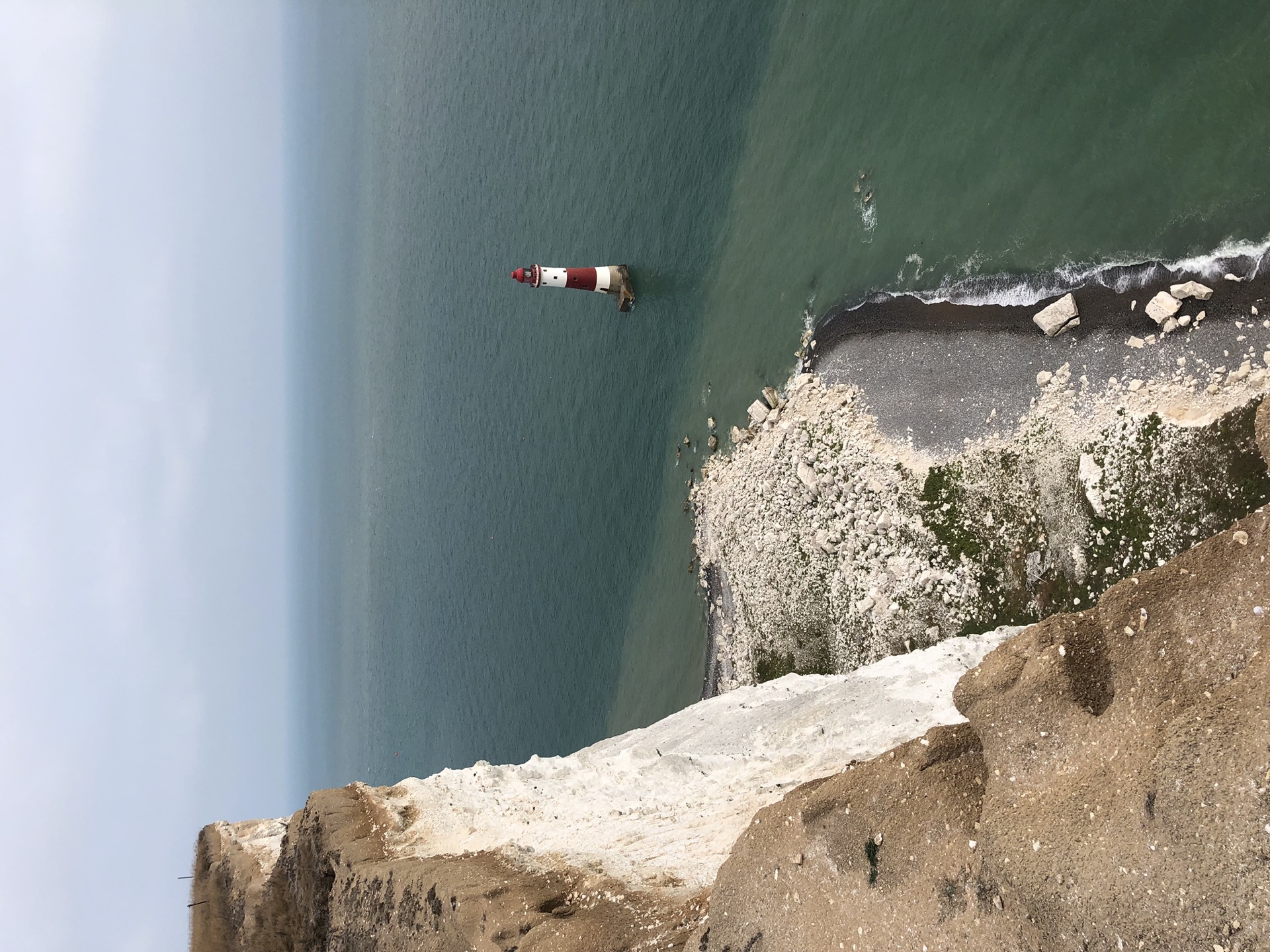 Am nächsten Tag schauen wir uns den Leuchtturm von Beachy Head an. Das liegt auf unserem Weg, passt also super. Wir machen eine kleine Wanderung auf dem Kreidefelsen, der ist übrigens mit 162 m über dem Meeresspiegel der höchste in Großbritannien. Leider wird dieser auch gerne für Suizidversuche genommen, sodass eigens dafür tagsüber und abends ein Seelsorge-Team dort stationiert ist. Der Leuchtturm wurde ins Meer vor den Klippen gebaut, ist 43 m hoch und 1902 in Betrieb genommen worden.