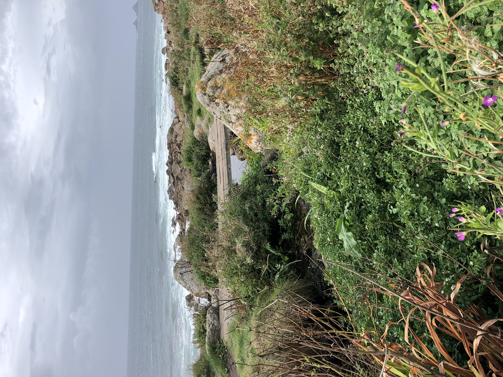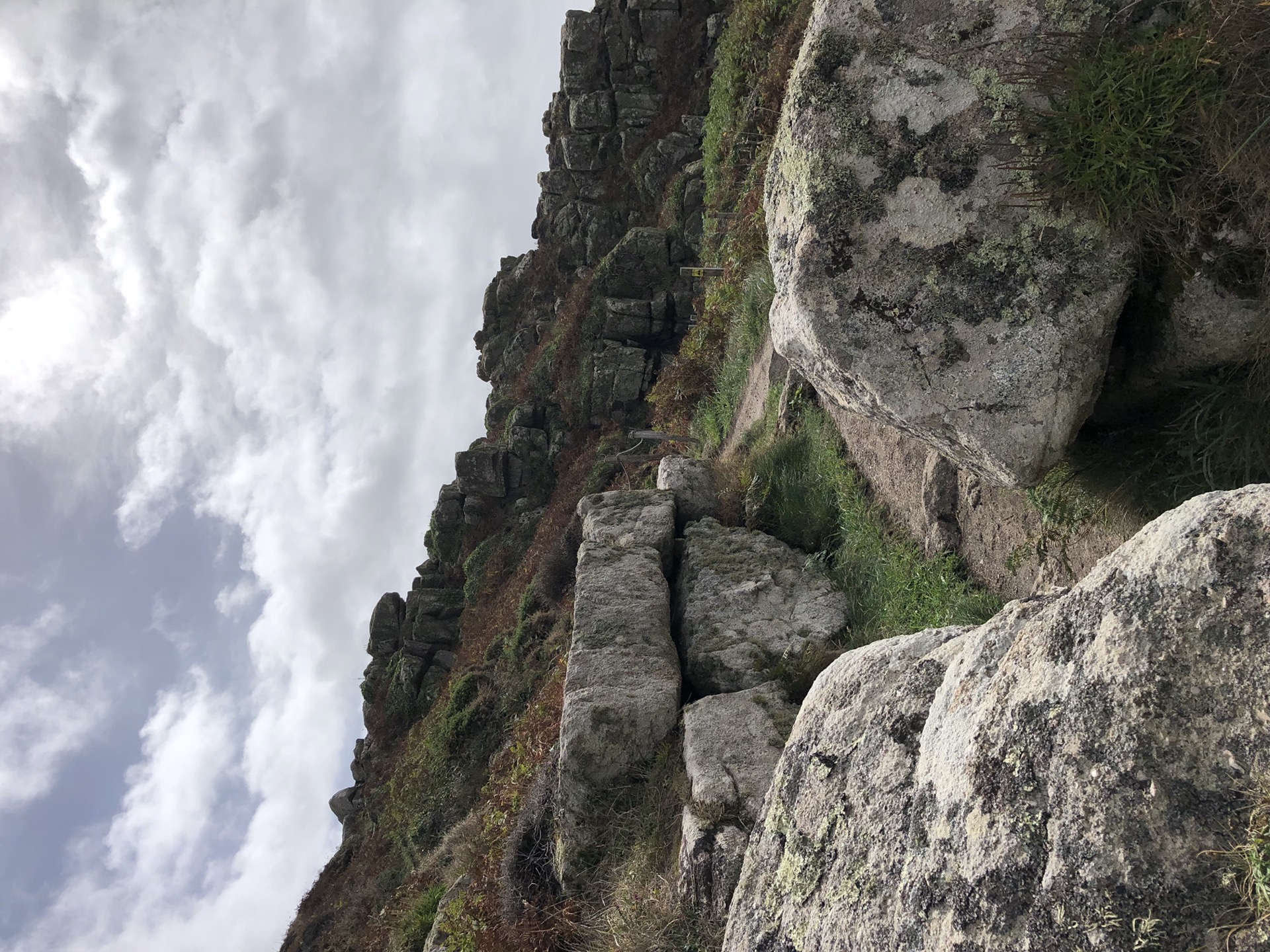 Der Weg an sich war sehr unterschiedlich. Teilweise einfach ein sehr schmaler fest getretener Pfad, dann wieder mit Steinen dazwischen oder auch mal eine Breite Grasfläche auf einer Klippe. Die Stellen wo es steil bergab bzw. bergauf ging waren meist mit Trittstufen versehen. Das war teilweise einfacher, aber es gab auch Stellen da musste ich mich mit meinen kurzen Beinen doch recht anstrengen. Aber kein Problem, ich will mich ja bewegen! Irgendwann hab ich dann registriert, dass der Himmel von Land’s End her immer dunkler wurde und das Ganze in meine Richtung kam.