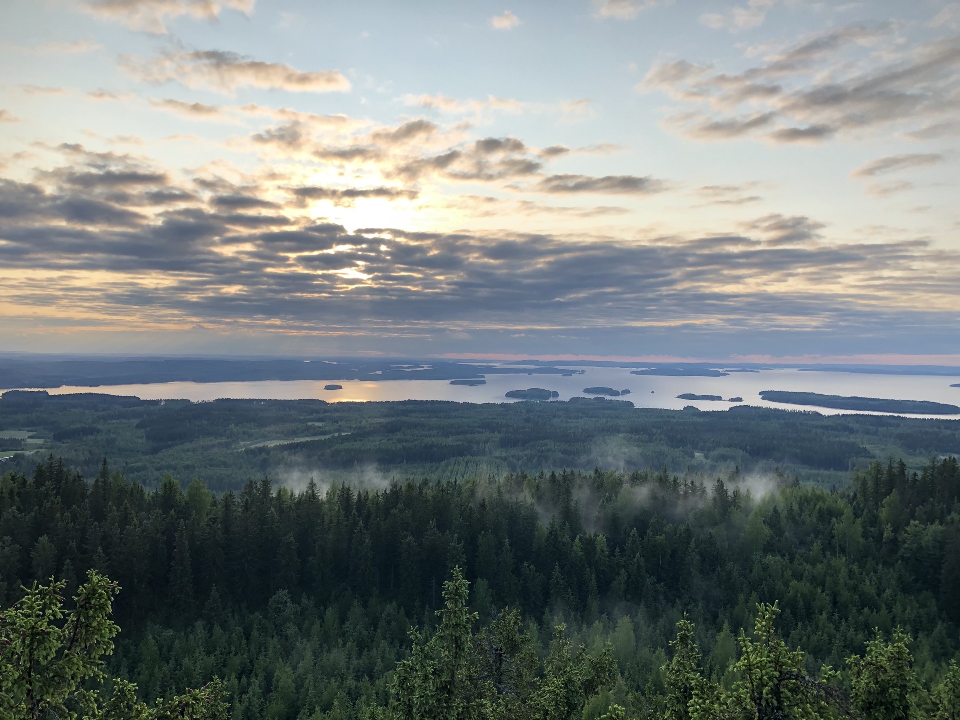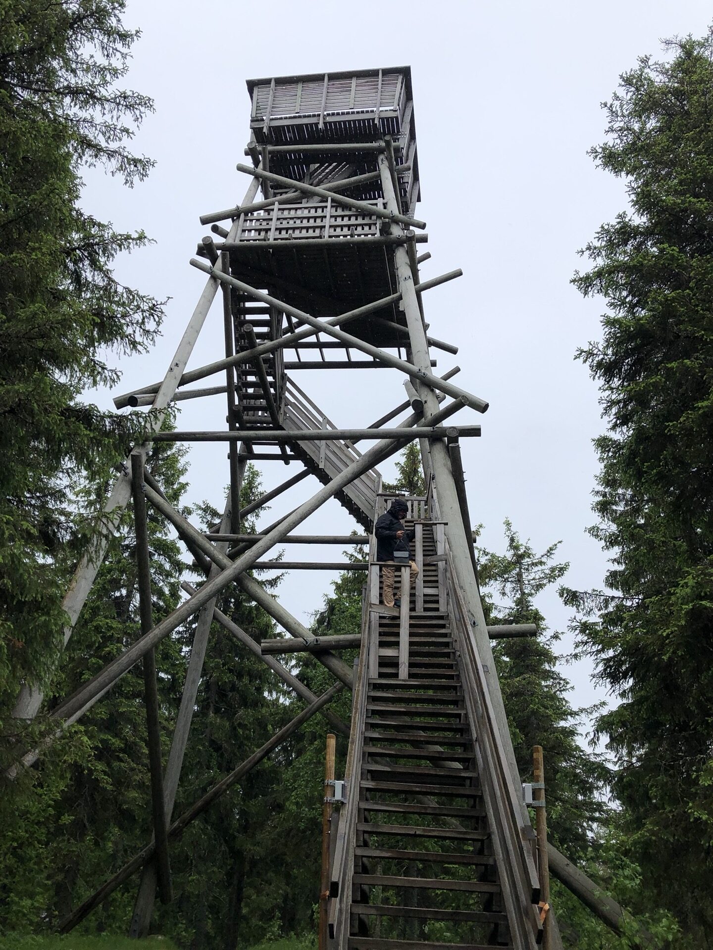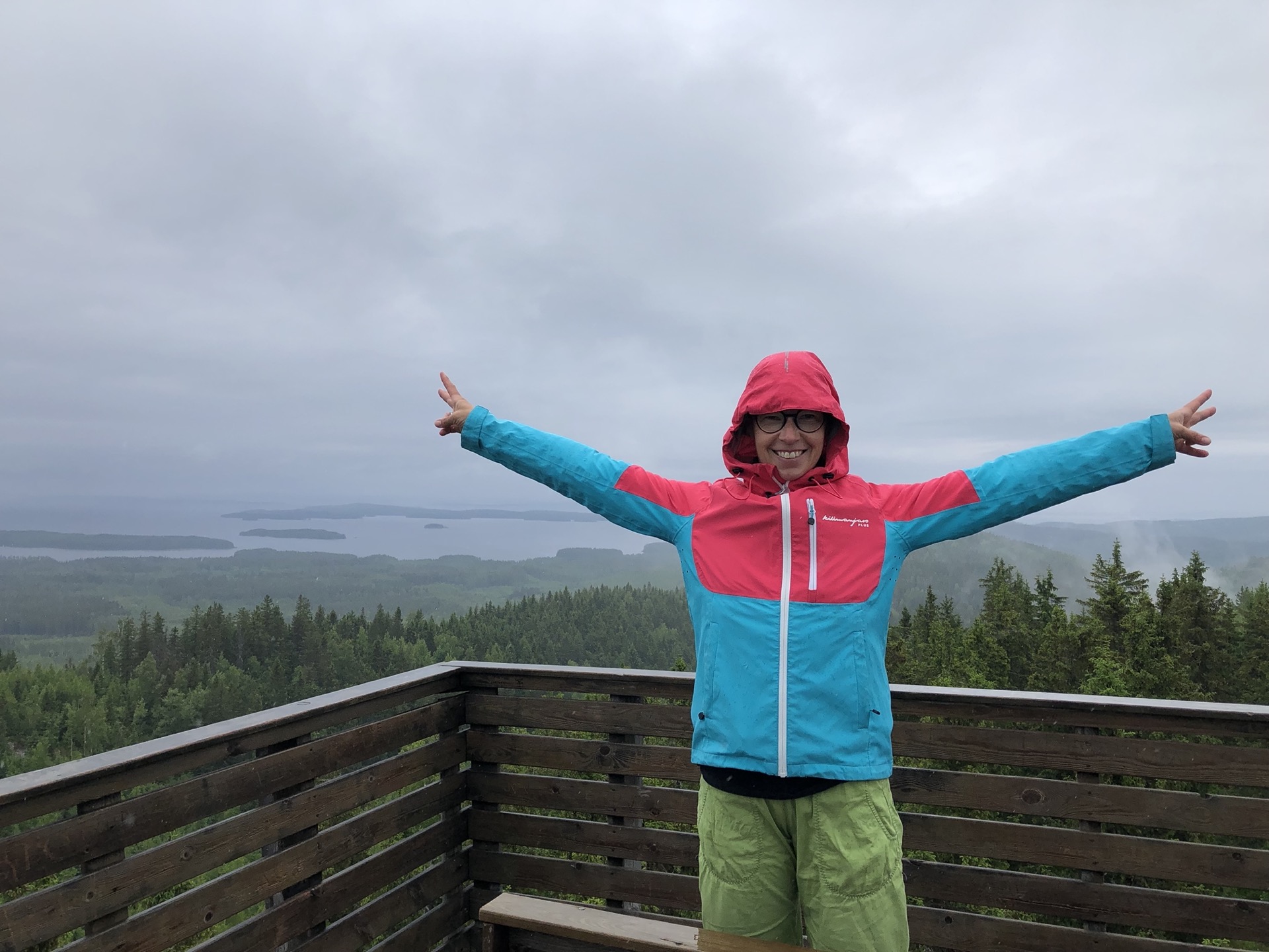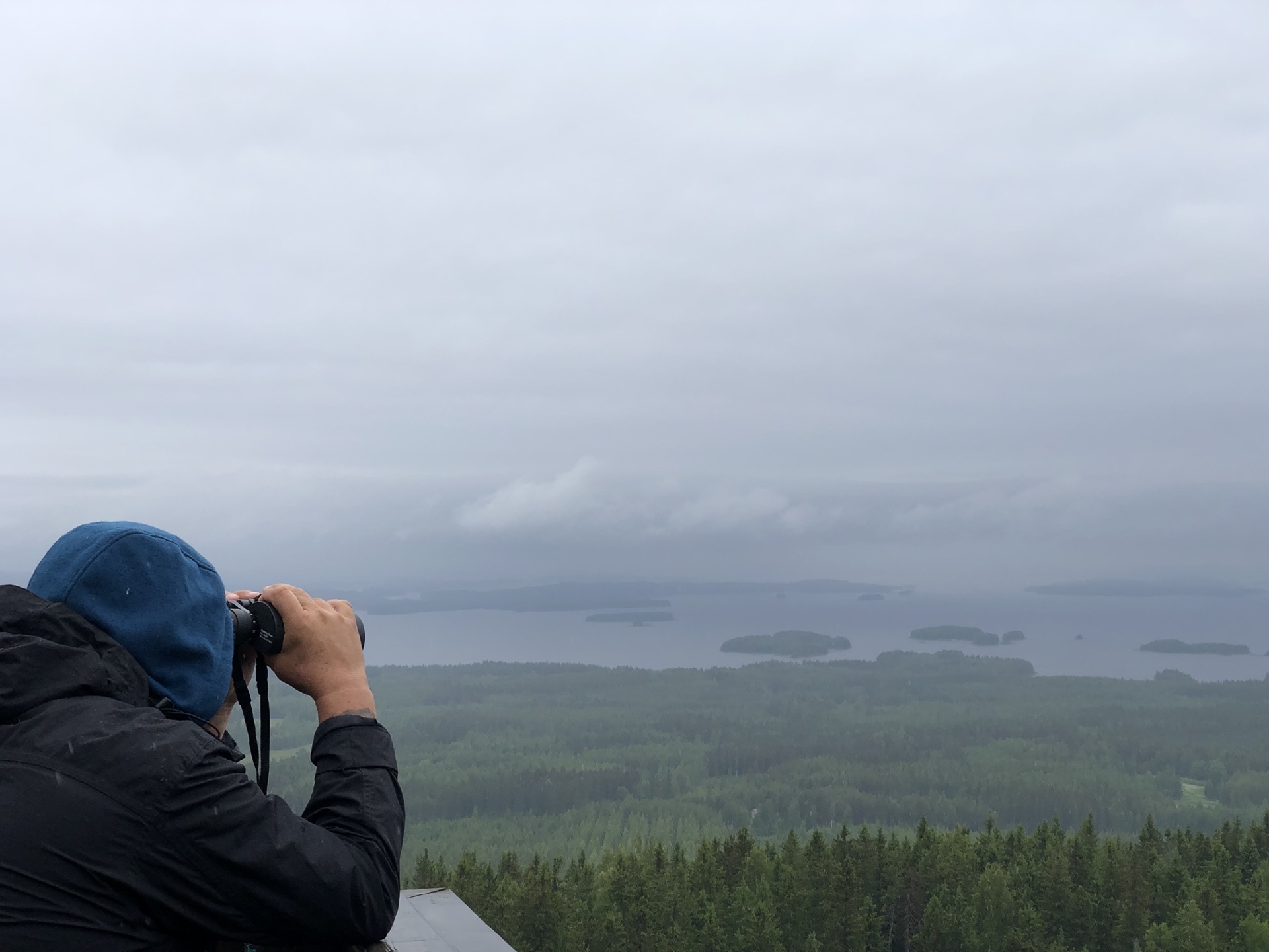Der nächste Tag ist leider eher durchwachsen und mein Plan im Koli Nationalpark wandern zu gehen, sehe ich schon dahin fliessen. So fahren wir erstmal auf einen Picknickplatz im Wald oberhalb des Nationalparks. Dort gibt es in fußläufiger Entfernung einen Aussichtsturm, doch bis wir oben sind hat es sich ziemlich zugezogen und die Aussicht ist eher naja.