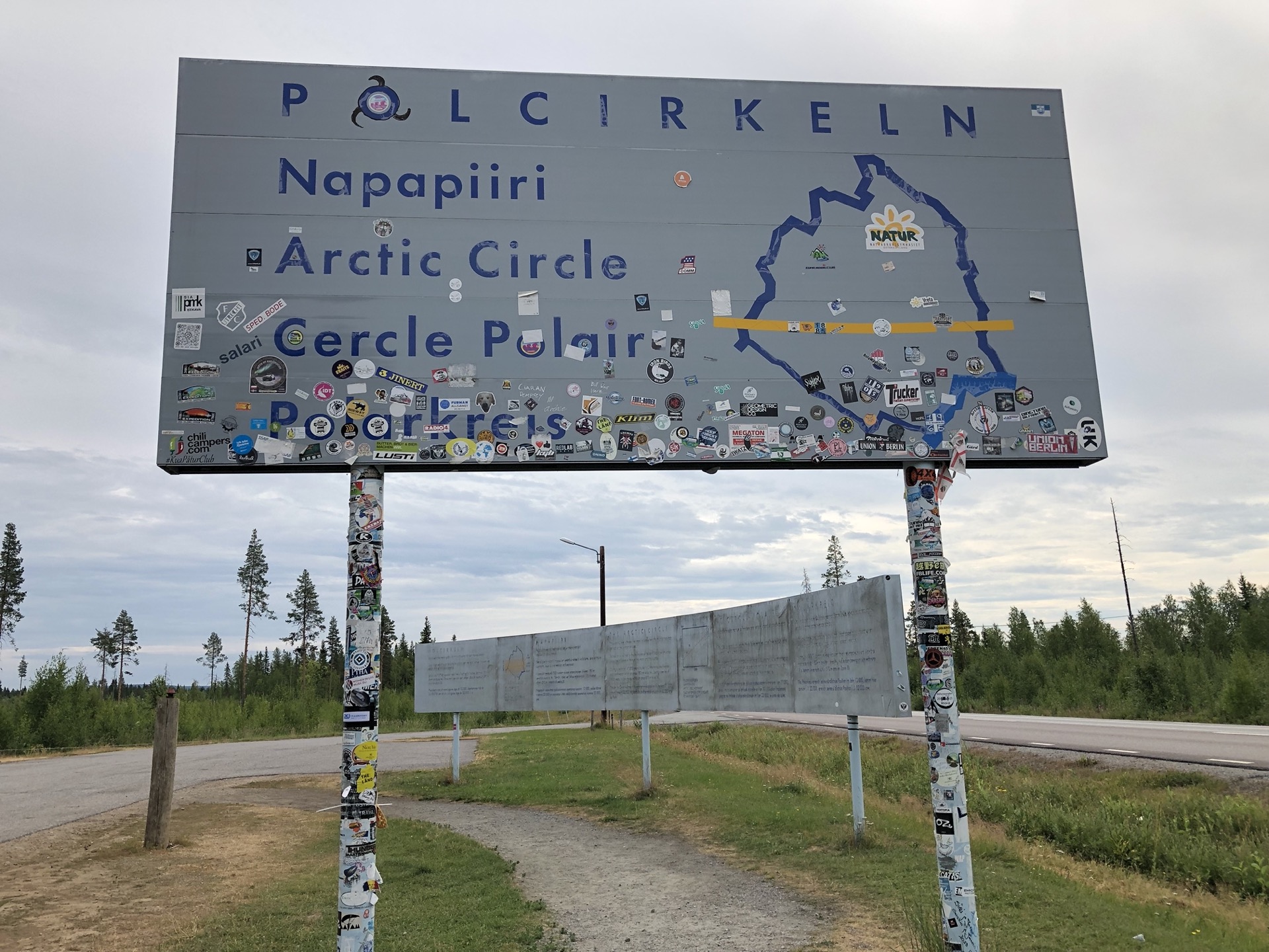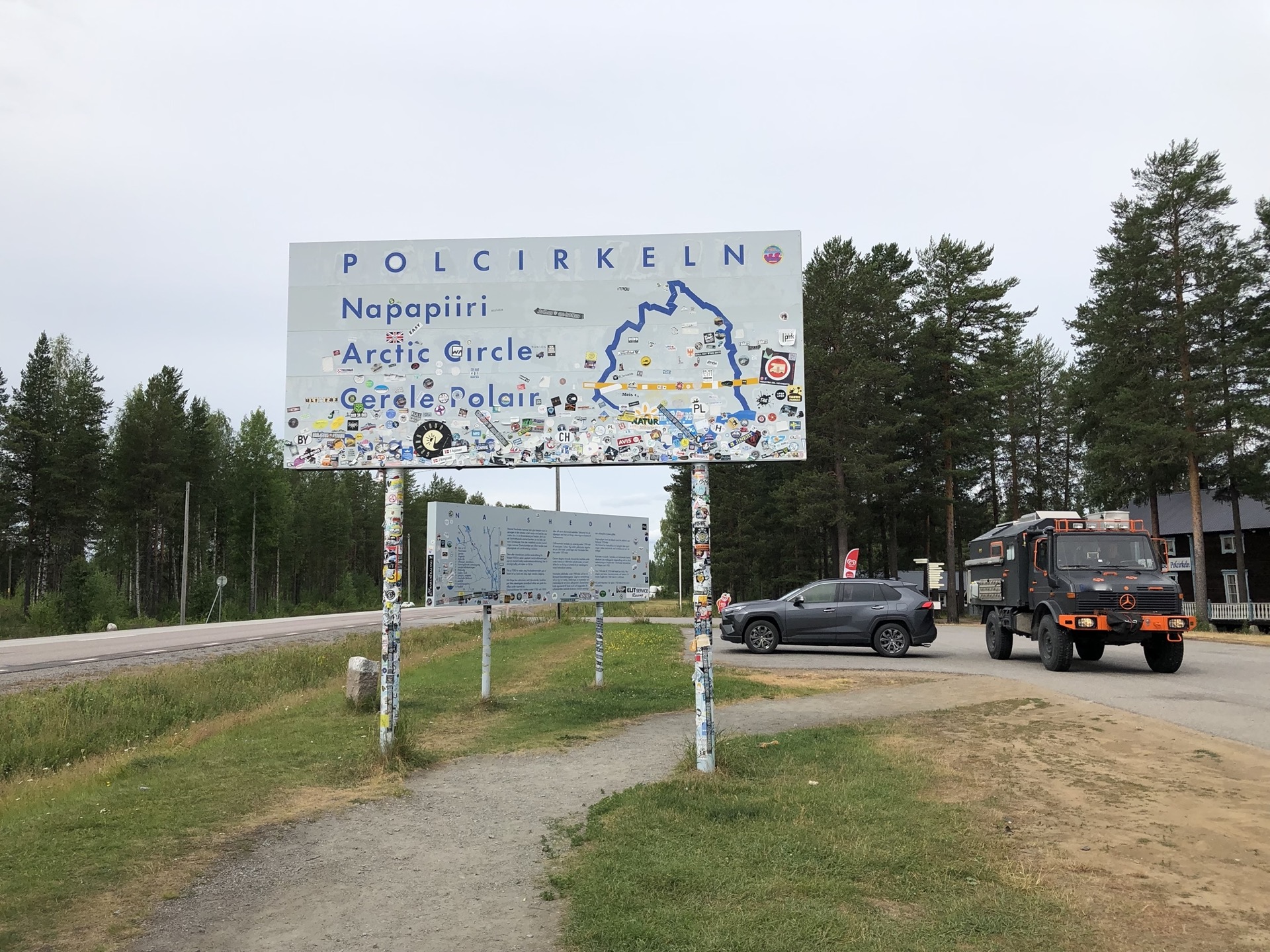 Leider werden wir ziemlich schnell von der Realität eingeholt. Der Einbau des Filters, am Vortag und die Probefahrt waren perfekt, doch heute bläst das Überdruckventil nicht ab! Also alles wieder beim Alten, heisst, alle 3 – 5 km anhalten und Druck abpumpen. Vor lauter Frust und weil wir eigentlich keine Lust mehr auf den ganzen Ärger haben, verpassen wir fast, dass wir den Polarkreis in Südliche Richtung überqueren. Siggi fährt in letzter Sekunde auf den Parkplatz, ich mache ein Foto und schon geht es weiter. Das bedeutet, ab hier wird es jetzt abends wieder deutlich dunkler und es gibt Sonnenuntergänge zu bestaunen.