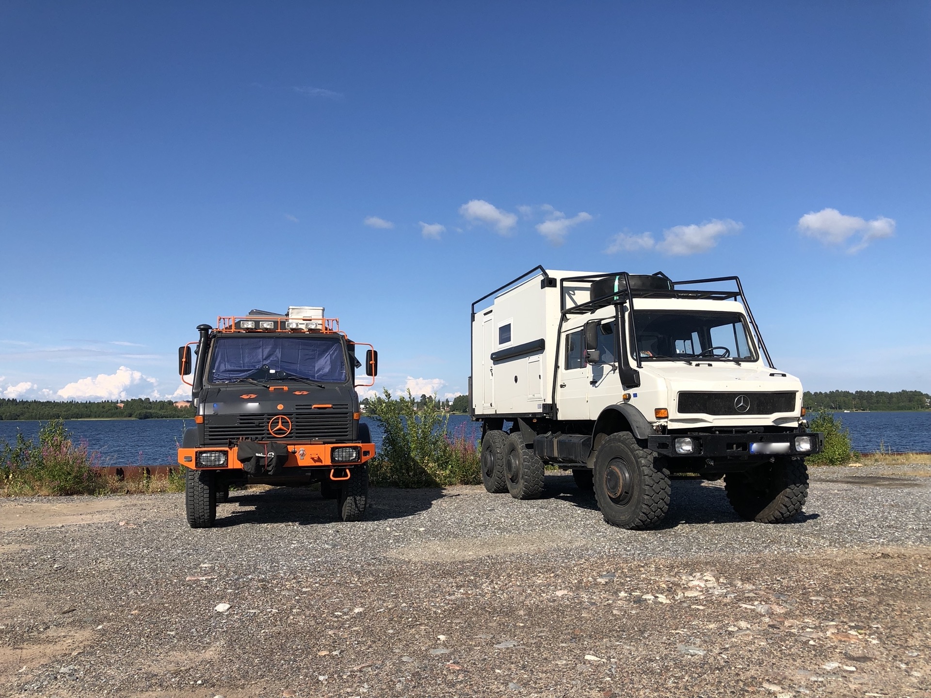 Der nächste Tag führt uns nach Lueå. Das ist auch wieder eine große Stadt mit einer Mercedes Werkstatt. Da aber Sonntag ist und die Werkstatt geschlossen, gehen wir Lebensmittel besorgen und fahren im Anschluß zu einem tollen Übernachtungsplatz. Als wir dort ankommen steht da tatsächlich ein Unimog 6×6 aus Deutschland. Gibts ja gar nicht! Wir parken und gehen gleich mal „Hallo“ sagen. Die beiden sind leider im Aufbruch, somit haben wir nur kurz Zeit ein bisschen zu quatschen. Das ist total schade, denn die beiden sind uns auf Anhieb sympathisch, das kommt leider nicht so häufig vor.