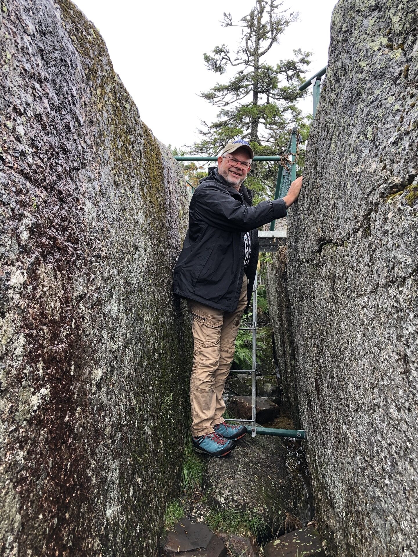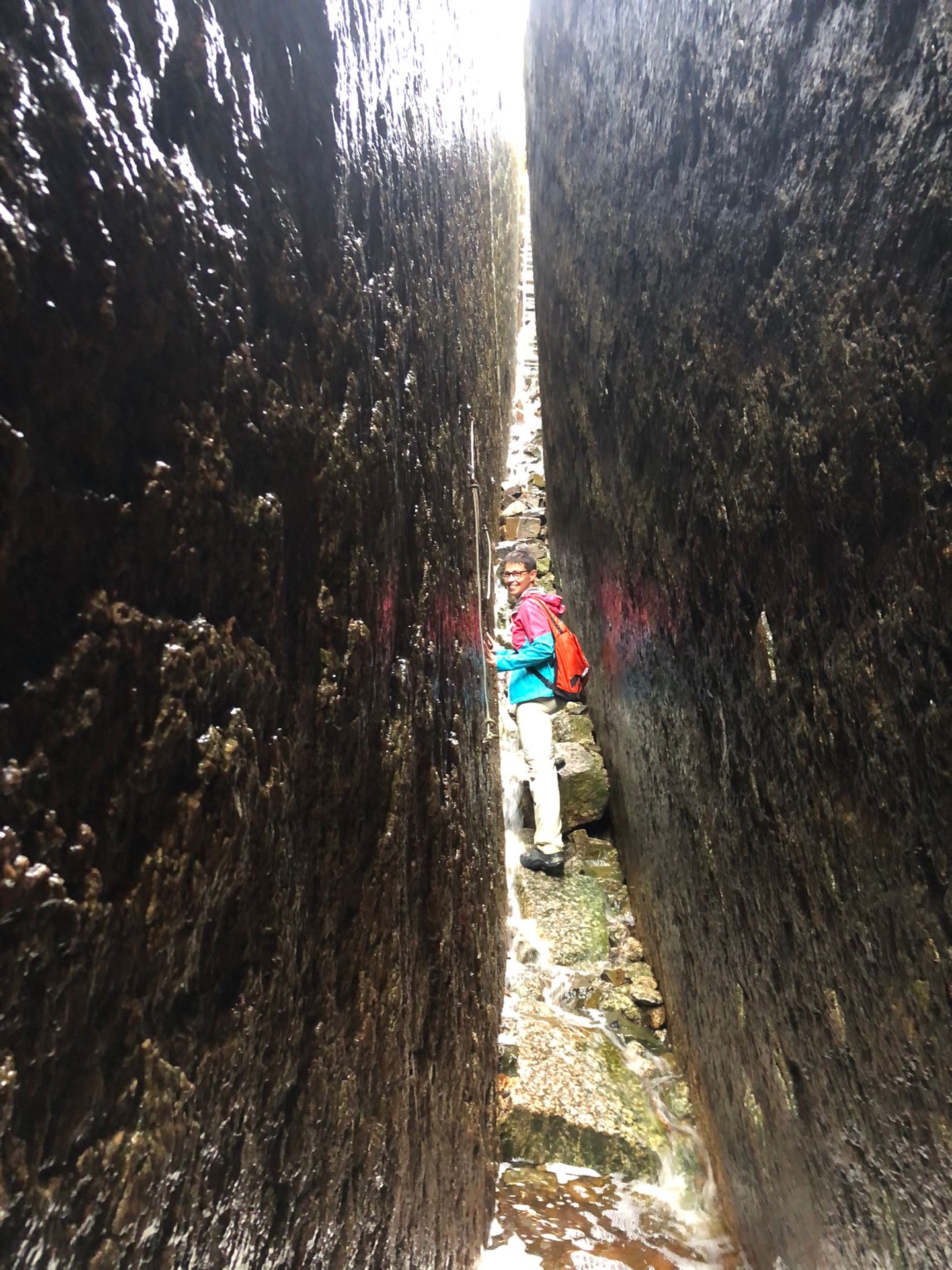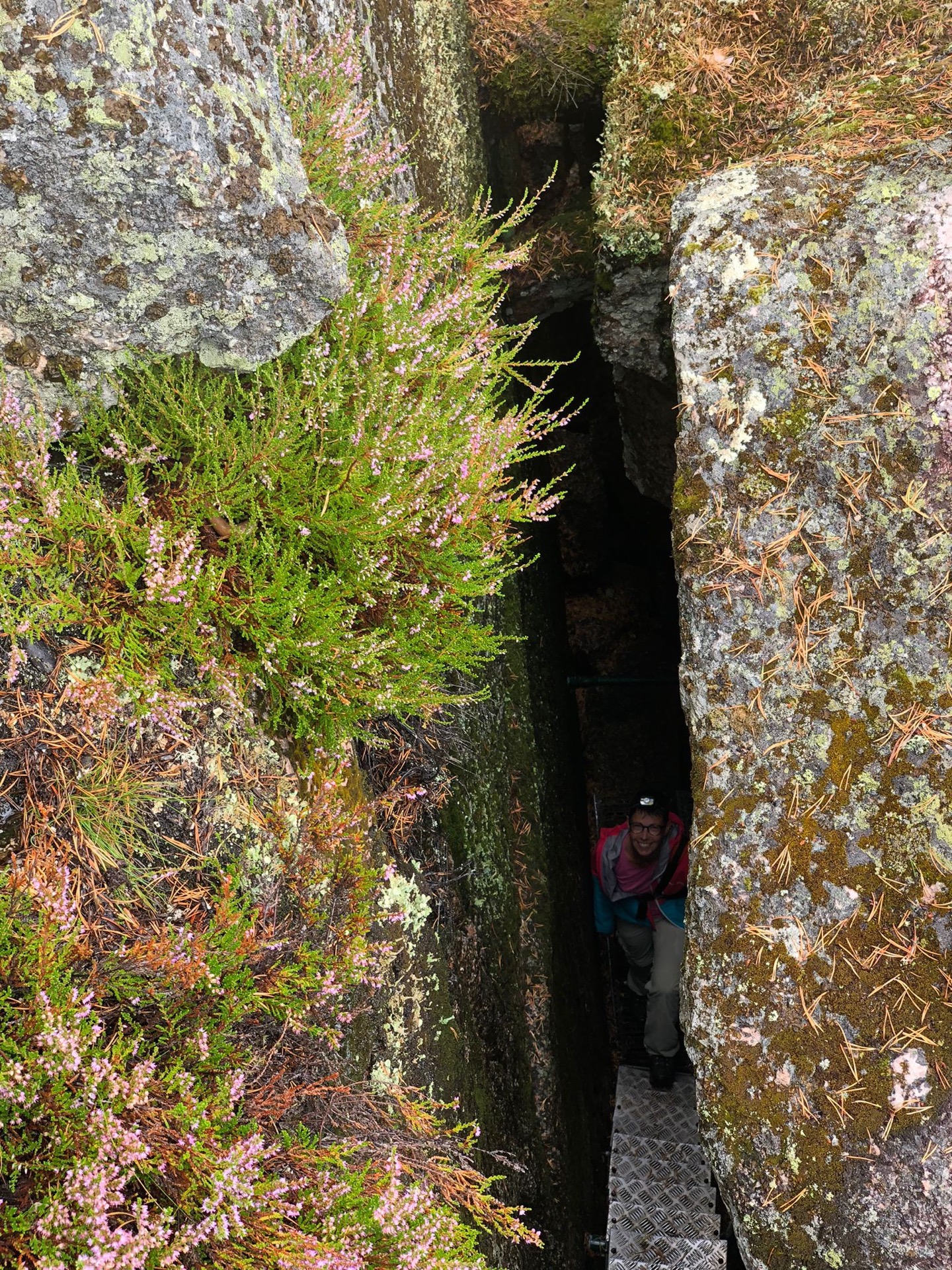 Oben angekommen gibt es eine ziemlich beeindruckende Felsspalte in die man über eine Leiter nach unten ca. 30m absteigen kann. Puuh, ganz ehrlich, ich wäre da alleine niemals runter gegangen. Schon alleine, als ich das Wasser am Boden der Felsspalte gesehen habe, war für mich klar, da geh ich nicht runter. Viel zu gefährlich!! Tja, dieses mal hatte ich aber Siggi mit auf den Berg „geschleppt“ und der war der Meinung: „Da gehen wir jetzt auch runter, wenn wir schon extra hier hoch gelatscht sind!“