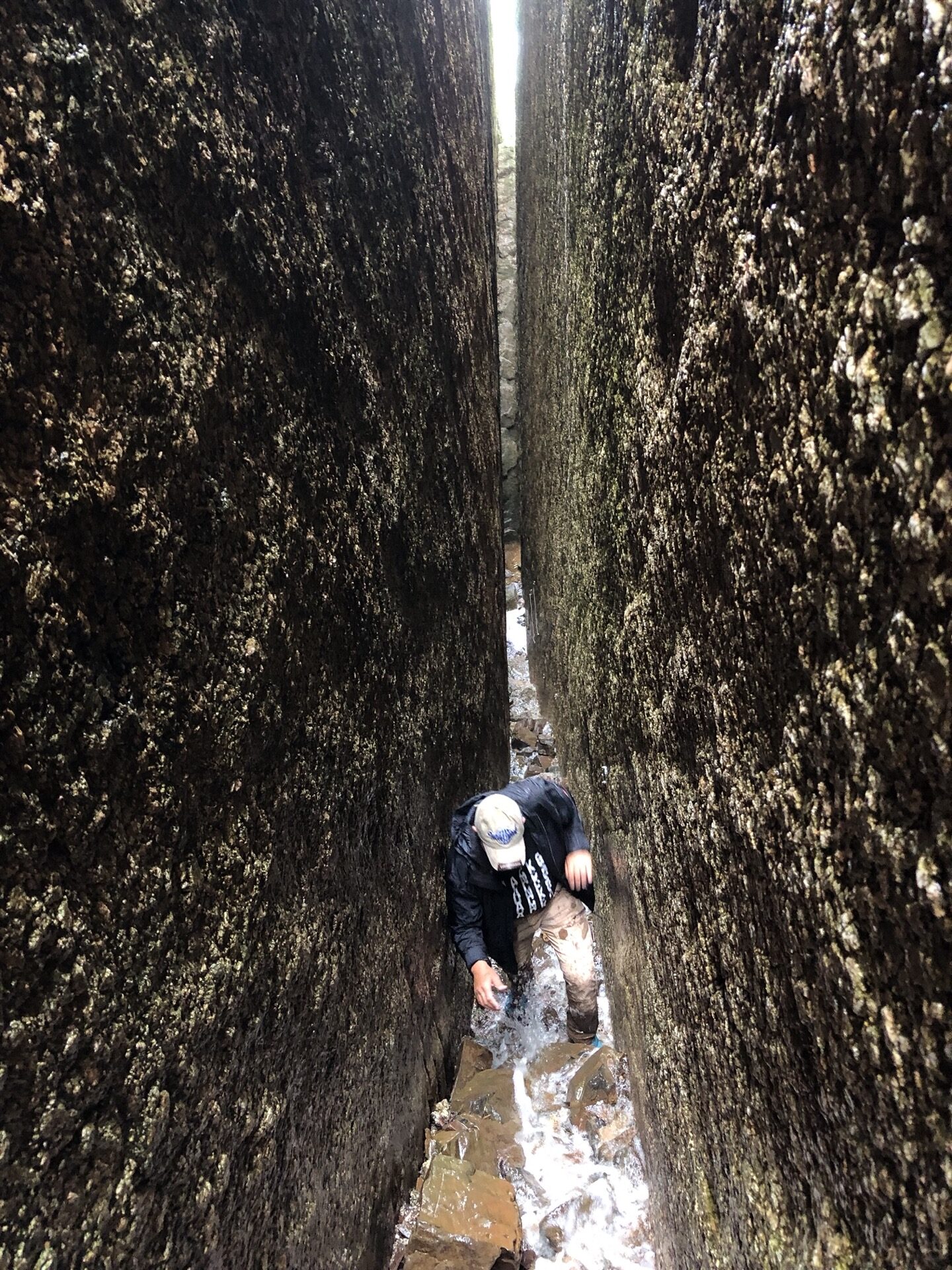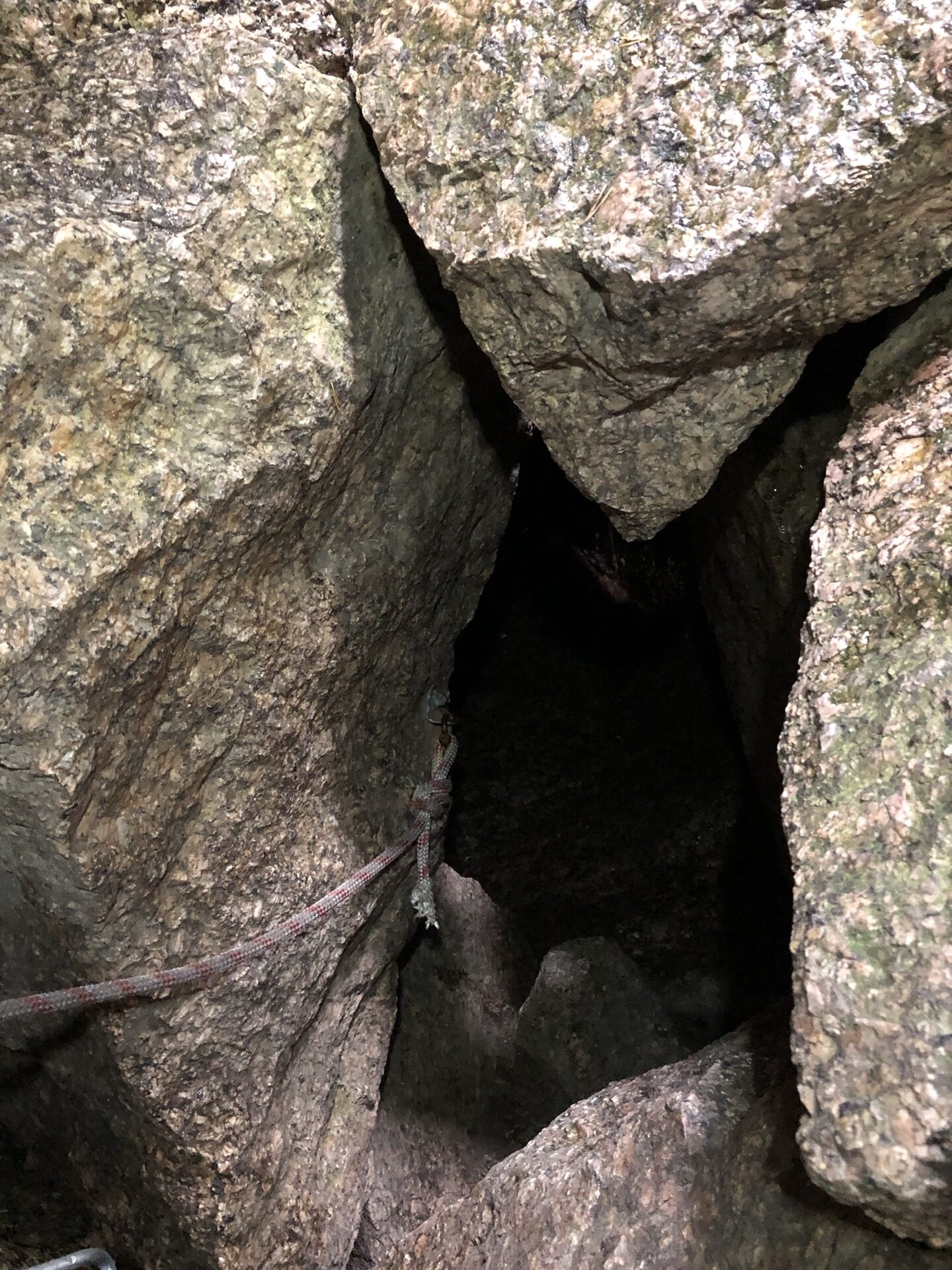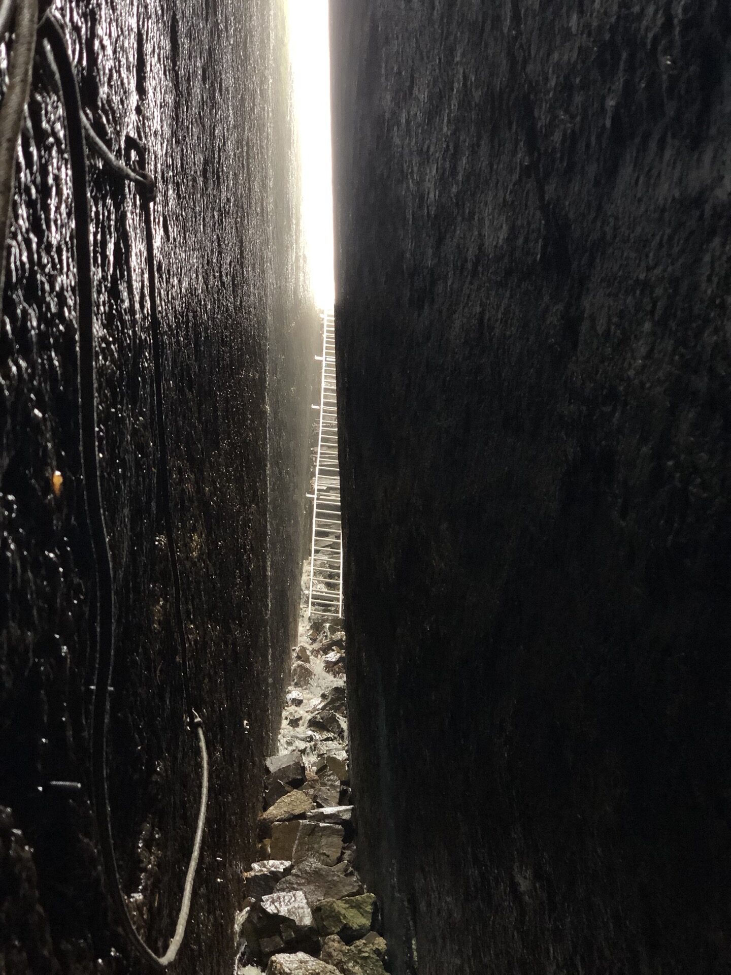 Oben angekommen gibt es eine ziemlich beeindruckende Felsspalte in die man über eine Leiter nach unten ca. 30m absteigen kann. Puuh, ganz ehrlich, ich wäre da alleine niemals runter gegangen. Schon alleine, als ich das Wasser am Boden der Felsspalte gesehen habe, war für mich klar, da geh ich nicht runter. Viel zu gefährlich!! Tja, dieses mal hatte ich aber Siggi mit auf den Berg „geschleppt“ und der war der Meinung: „Da gehen wir jetzt auch runter, wenn wir schon extra hier hoch gelatscht sind!“