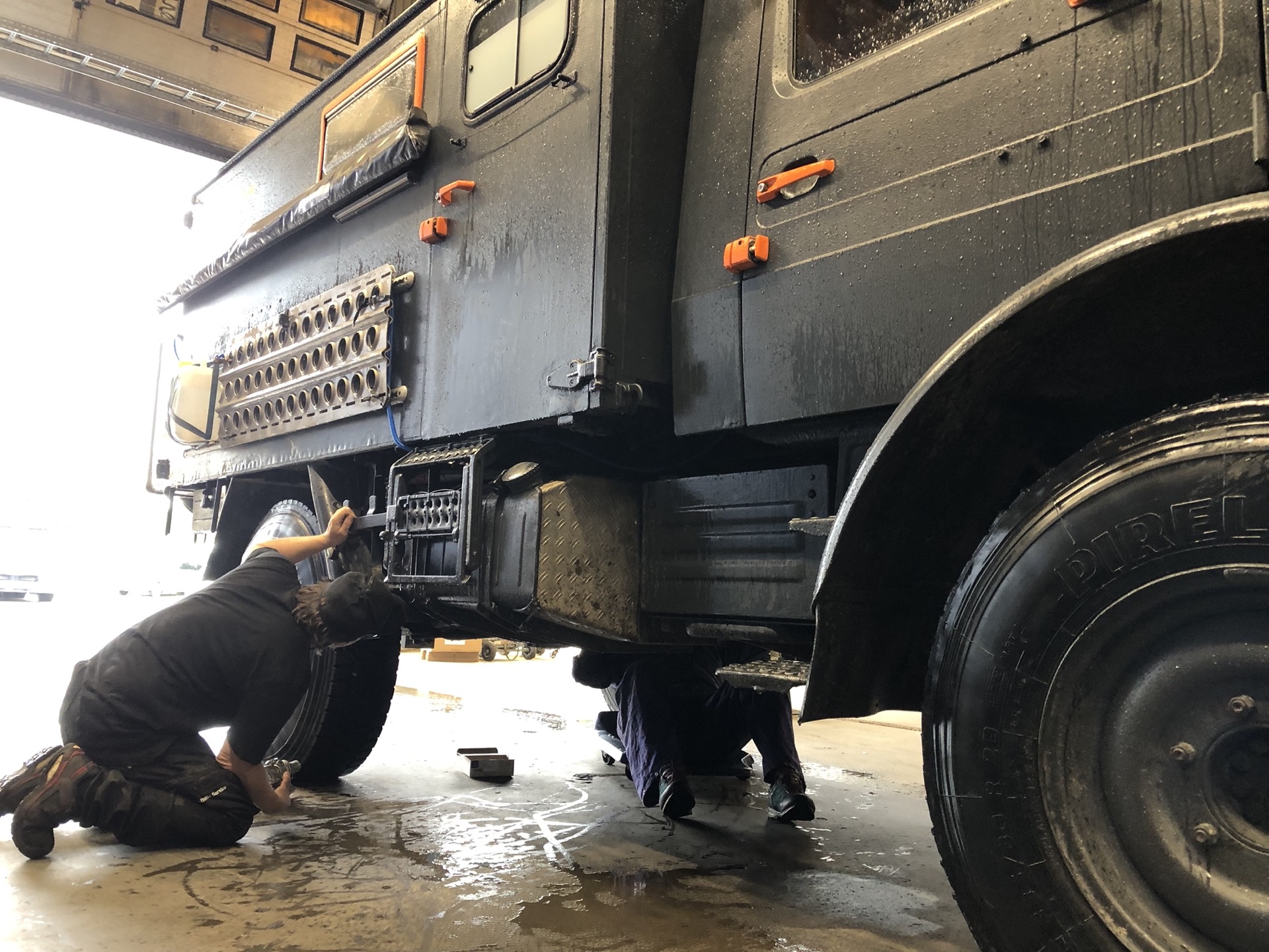 Nach dem schönen Wochenende ist es Zeit für den letzten Anlauf unseren Moggel in einer Werkstatt wieder fit zu machen. Die Ersatzteile sollen heute ankommen und dann so schnell es geht zu unserem Termin zu Mercedes. Die Ersatzteile holen wir an einem Postschalter ganz in der Nähe der Werkstatt ab. Der Erste Eindruck der Werkstatt ist top, die wissen direkt wer wir sind und dass wir ein Problem mit unserem Unimog haben. Das war es dann aber auch schon. Der Mechaniker lässt sich von Siggi alles erklären, schaut sich die Ersatzteile an, aber dann weiß er leider nicht weiter! Aahhh, es ist doch wirklich zum verrückt werden!! Wir haben jetzt wirklich alles versucht, doch irgendwie soll es einfach nicht sein. Da Siggis Lösung mit dem Luftschlauch ganz gut funktioniert, quälen wir uns und den Mechaniker nicht weiter und fahren wieder.