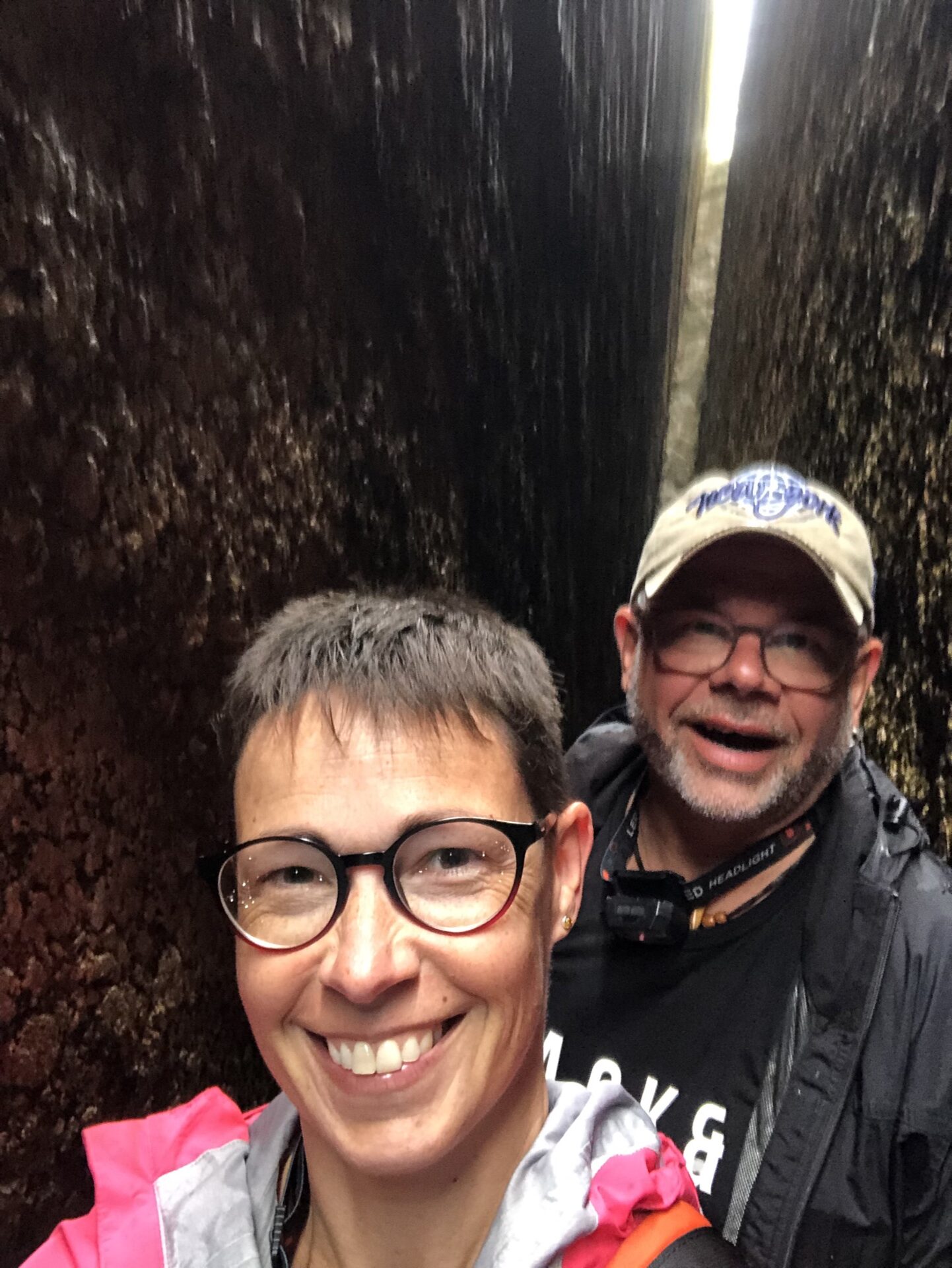 Wirklich, als wir am Parkplatz sind und umgezogen, wird der Himmel heller und es ist trocken, auf zur Höhle. Wir wandern den Berg ungefähr einen Kilometer hoch, anfangs über Holzstiegen, später teils über rutschige Felsen und weichen Waldboden. Es ist recht anspruchsvoll nach dem Regen, wir müssen wirklich aufpassen.