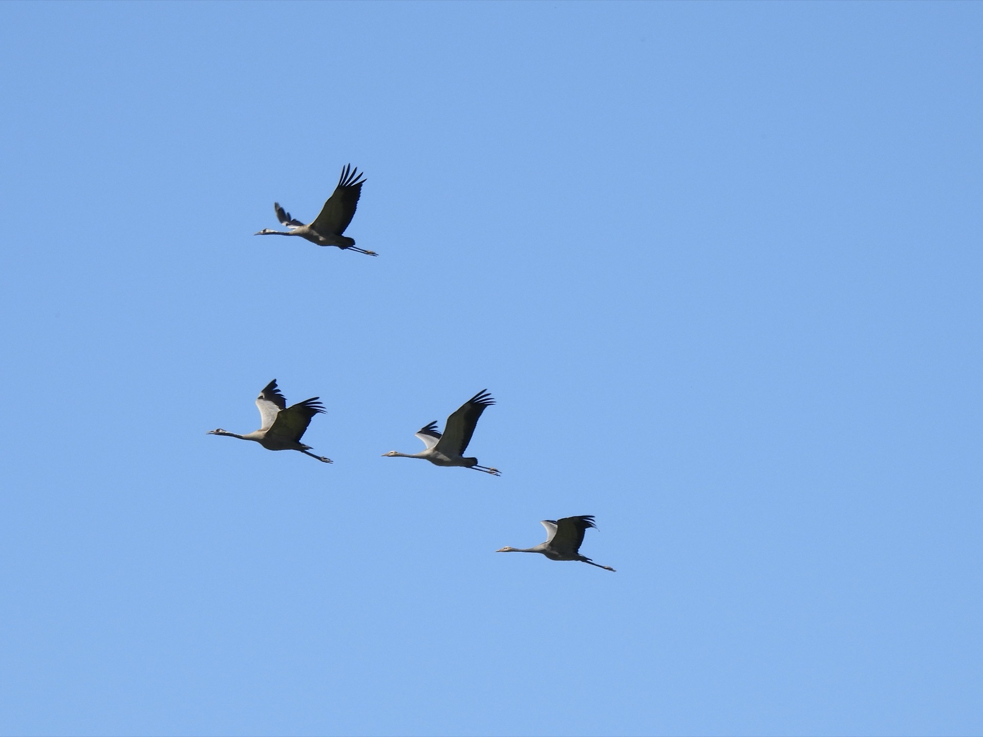 Wir haben zusammen mit unseren Freunden nach einer Route geschaut, die wir noch nicht kennen und auf der wir uns das eine oder andere noch ansehen können, ohne einen großen Umweg zu fahren. Denn wir wollen dem Moggel so wenige extra Kilometer als möglich zumuten. Die Strecke an sich ist nicht stark befahren, also genauso wie wir es mögen. Wir haben nochmal schöne Übernachtungsplätze in der Natur ganz für uns. So stehen wir an einem kleinen Naturreservat mit großen Weideflächen, einem See und einem kleinen Wald. Als Nachbarn haben wir Kühe, Gänse und einige Kraniche sind hier auch.