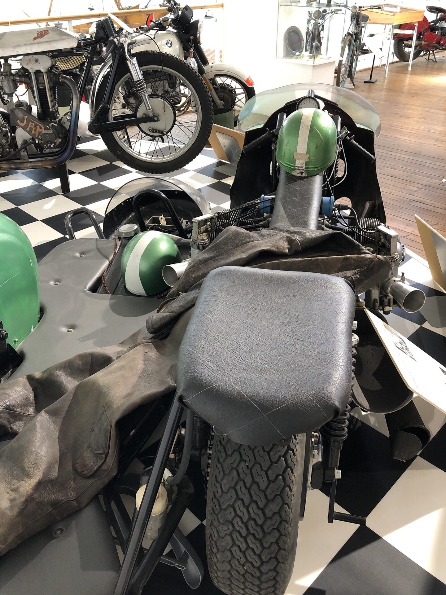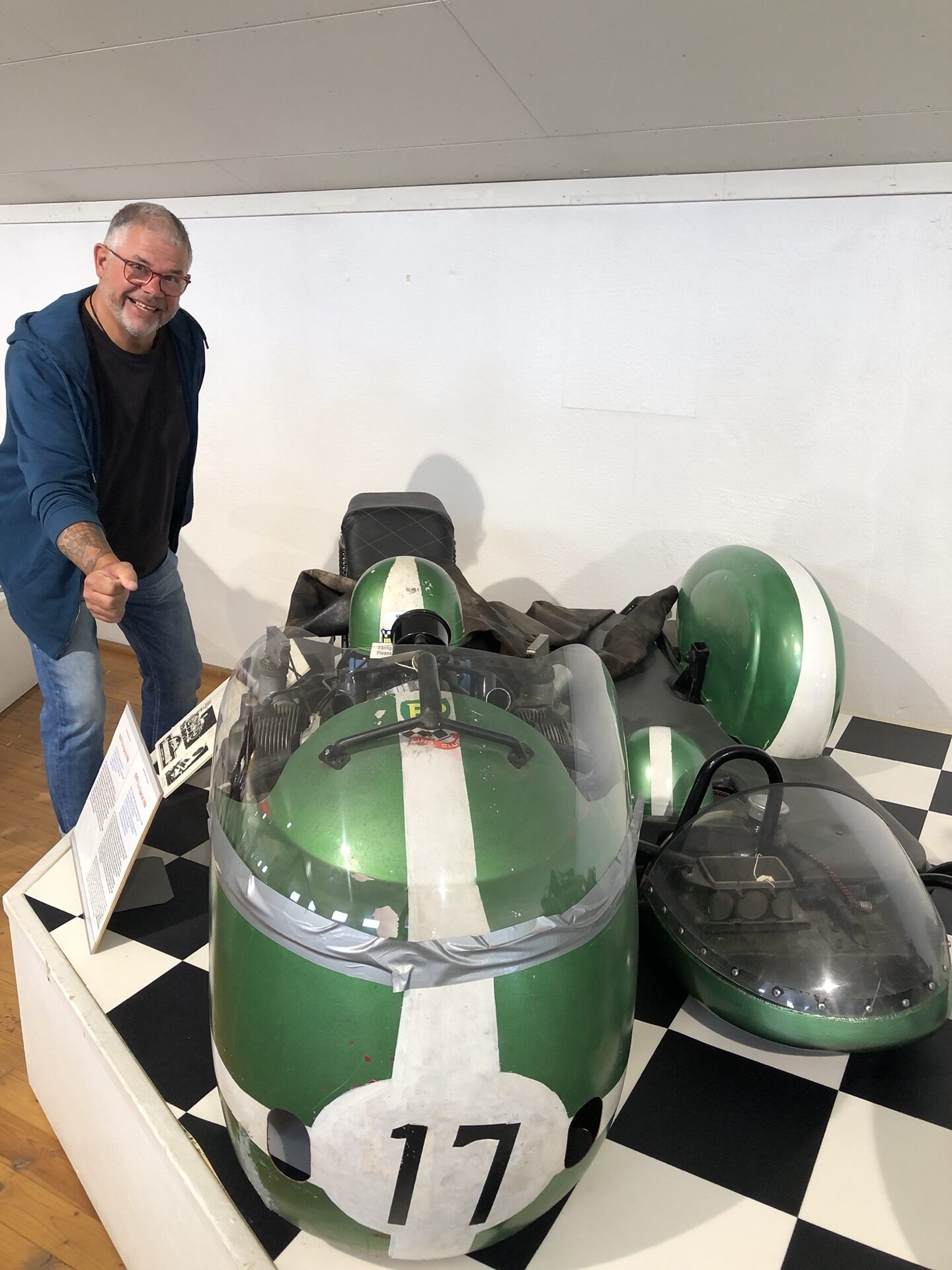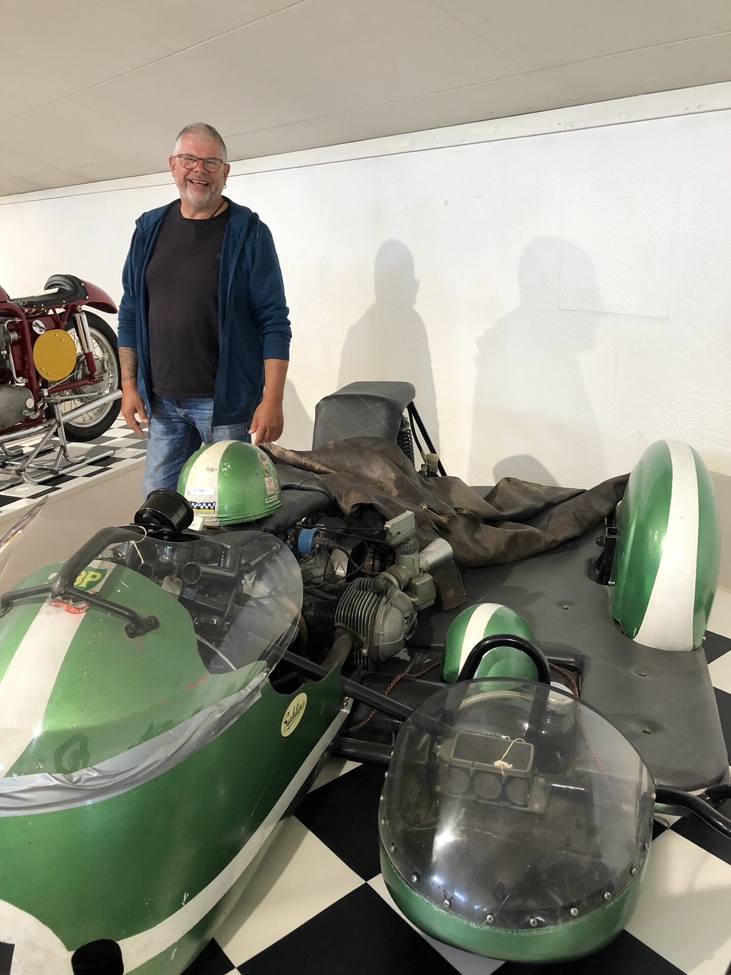 Auch gibt es verschiedene Motorräder zu bestaunen, eines davon ist ein Renngespann erbaut von Leif Ahl aus Arvika, er selbst ist bis 1971 Rennen gefahren. Das Modell bei dem Siggi so begeistert steht, ist ein BMW 700cc Kneelergespann mit Kettenantrieb. Das bedeutet es wurde halb liegend gefahren und ähnelt dem Renngespann, welches Siggi selbst besaß und gefahren ist.
