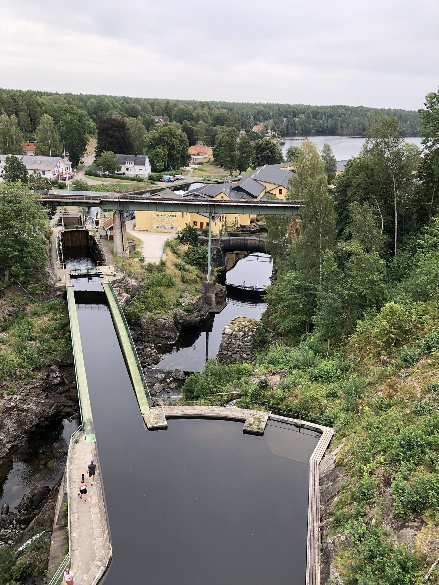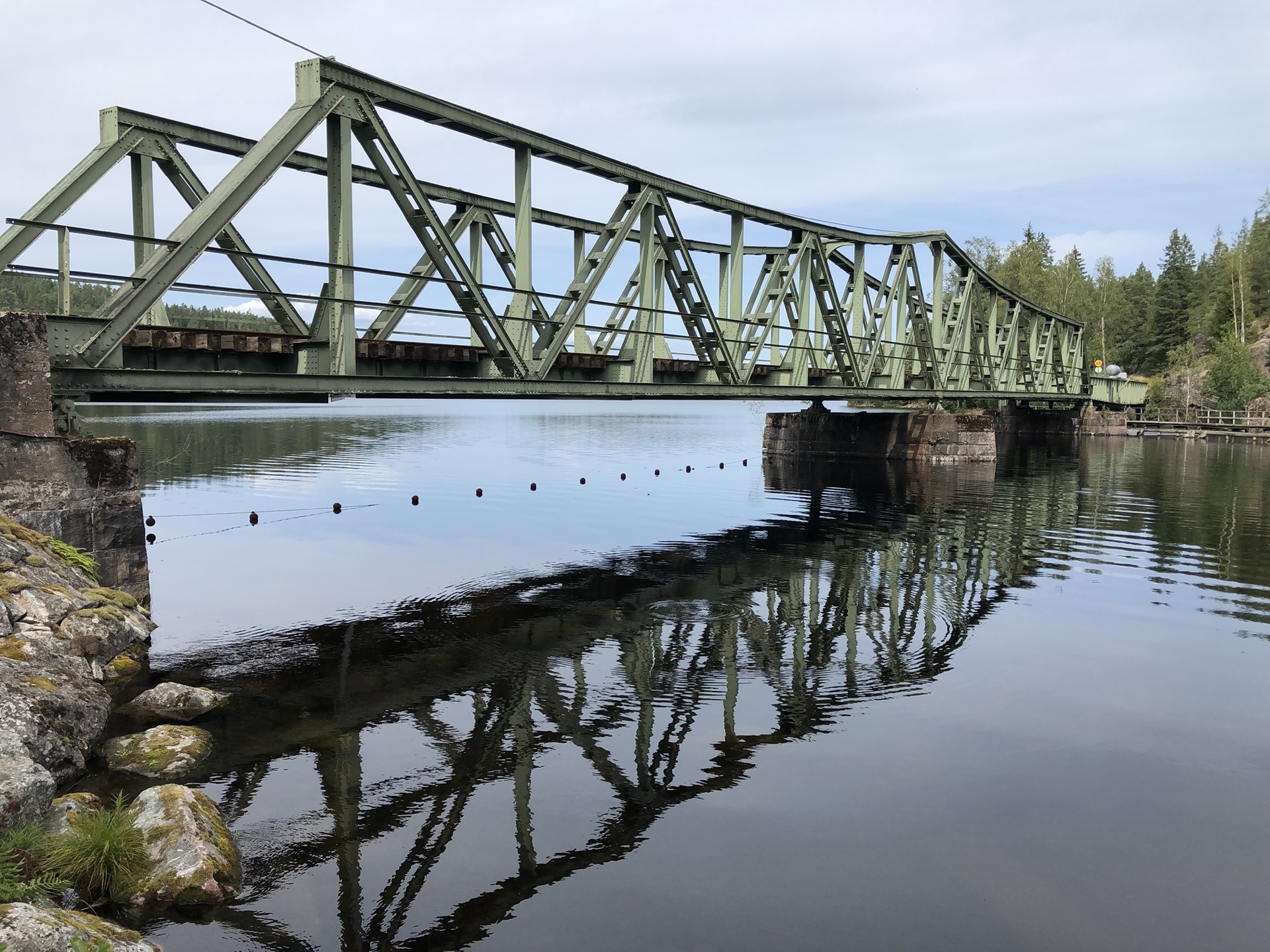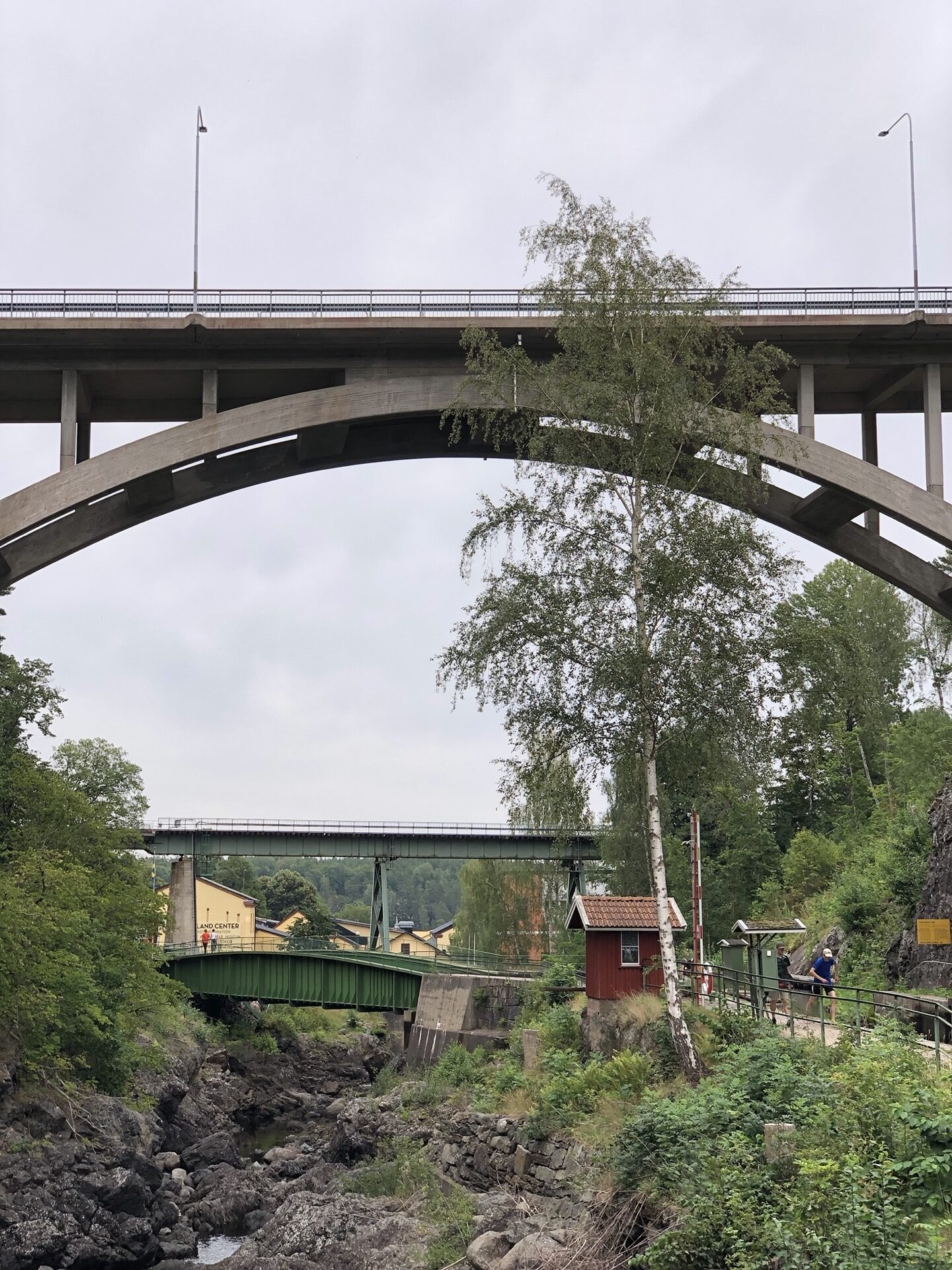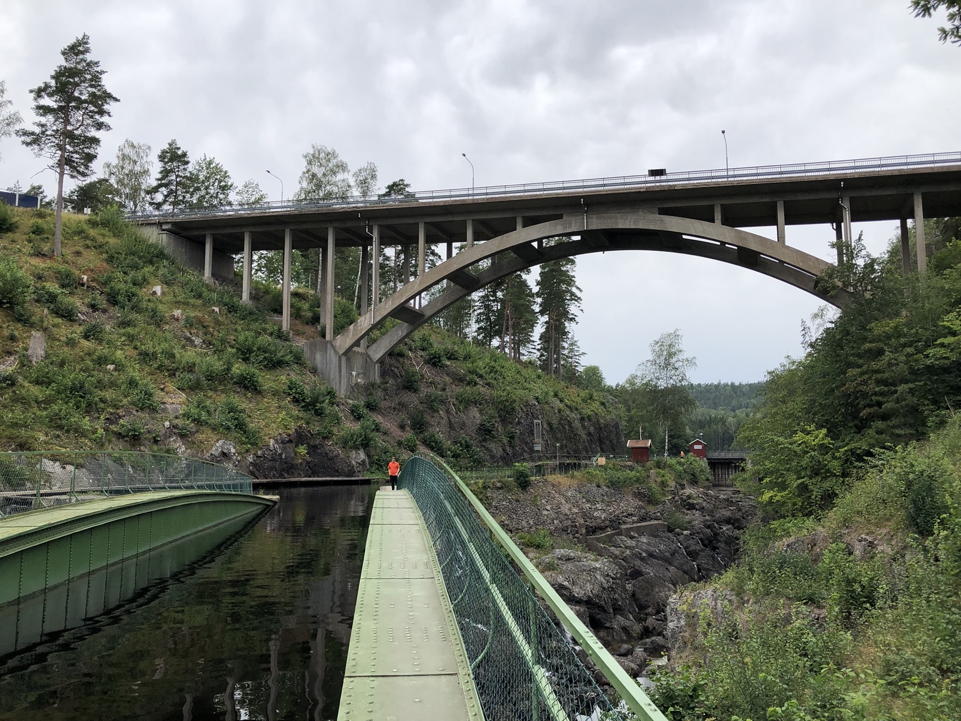 Håverud ist bekannt für sein spektakuläres Aquädukt, bei dem sich Wasserstraße, Eisenbahn und Autostraße auf faszinierende Weise kreuzen. Dieses Bauwerk aus genietetem Stahl ermöglicht es Booten über einen Fluss zufahren, während darüber sowohl eine Eisenbahn- als auch eine Straßenbrücke verlaufen. Das historischen Bauwerk, das mit seinen vier Schleusen eine Höhendifferenz von 9,9 Metern überwindet ist der Touristenmagnet des Dalslands Kanals schlecht hin! Wir schauen uns das ganze erstmal von der Autobrücke aus an und gehen dann runter ans Wasser.