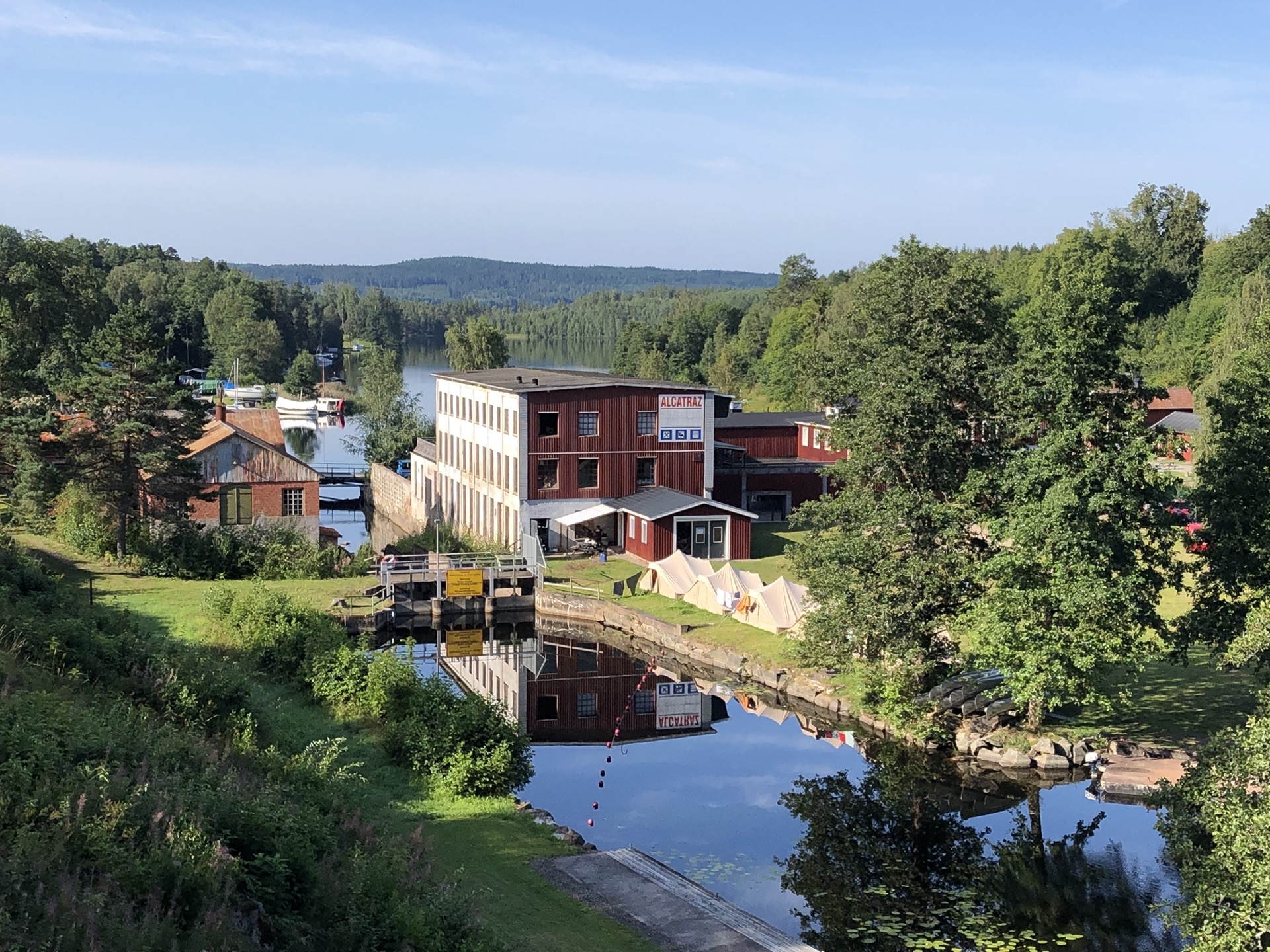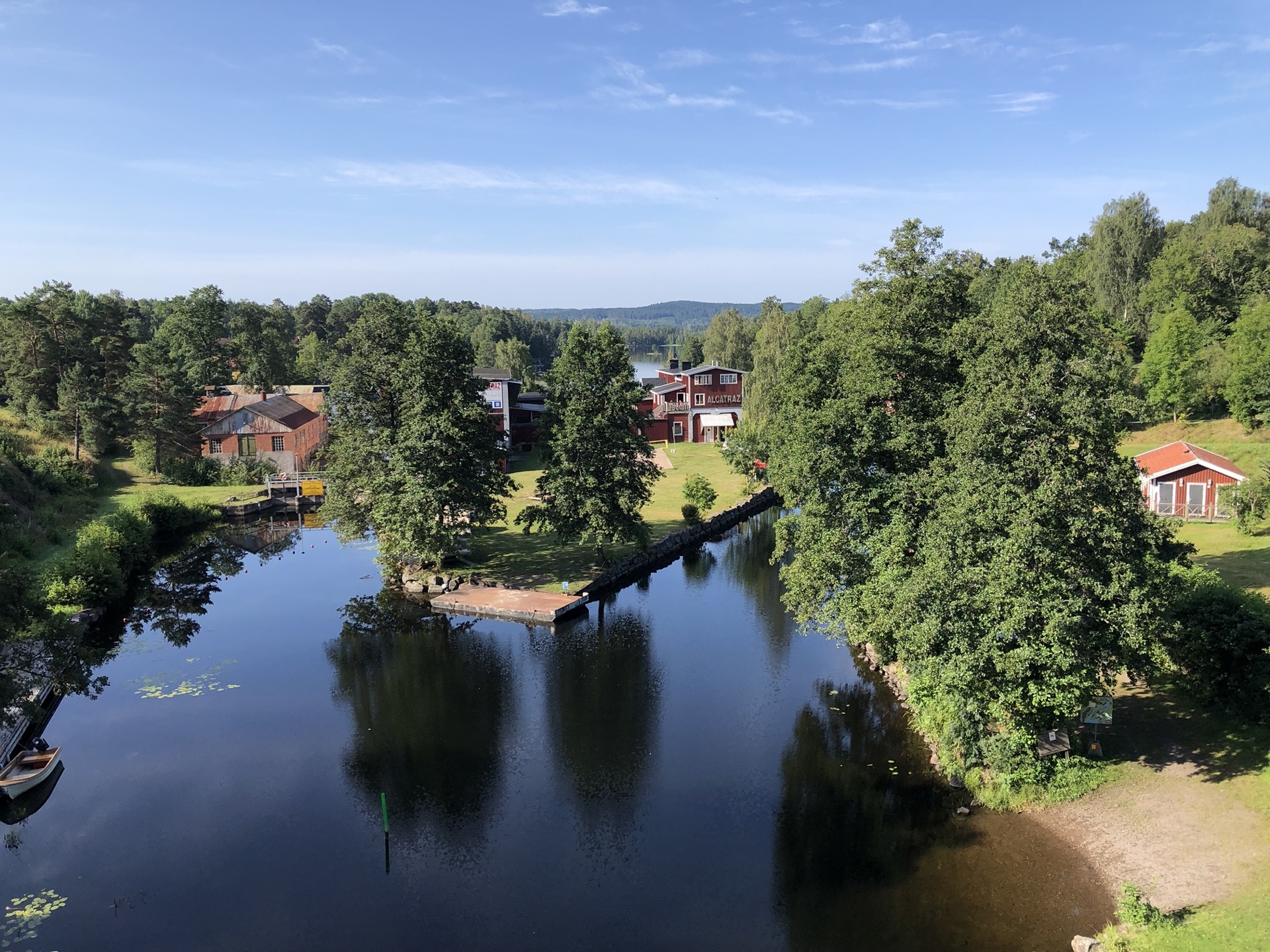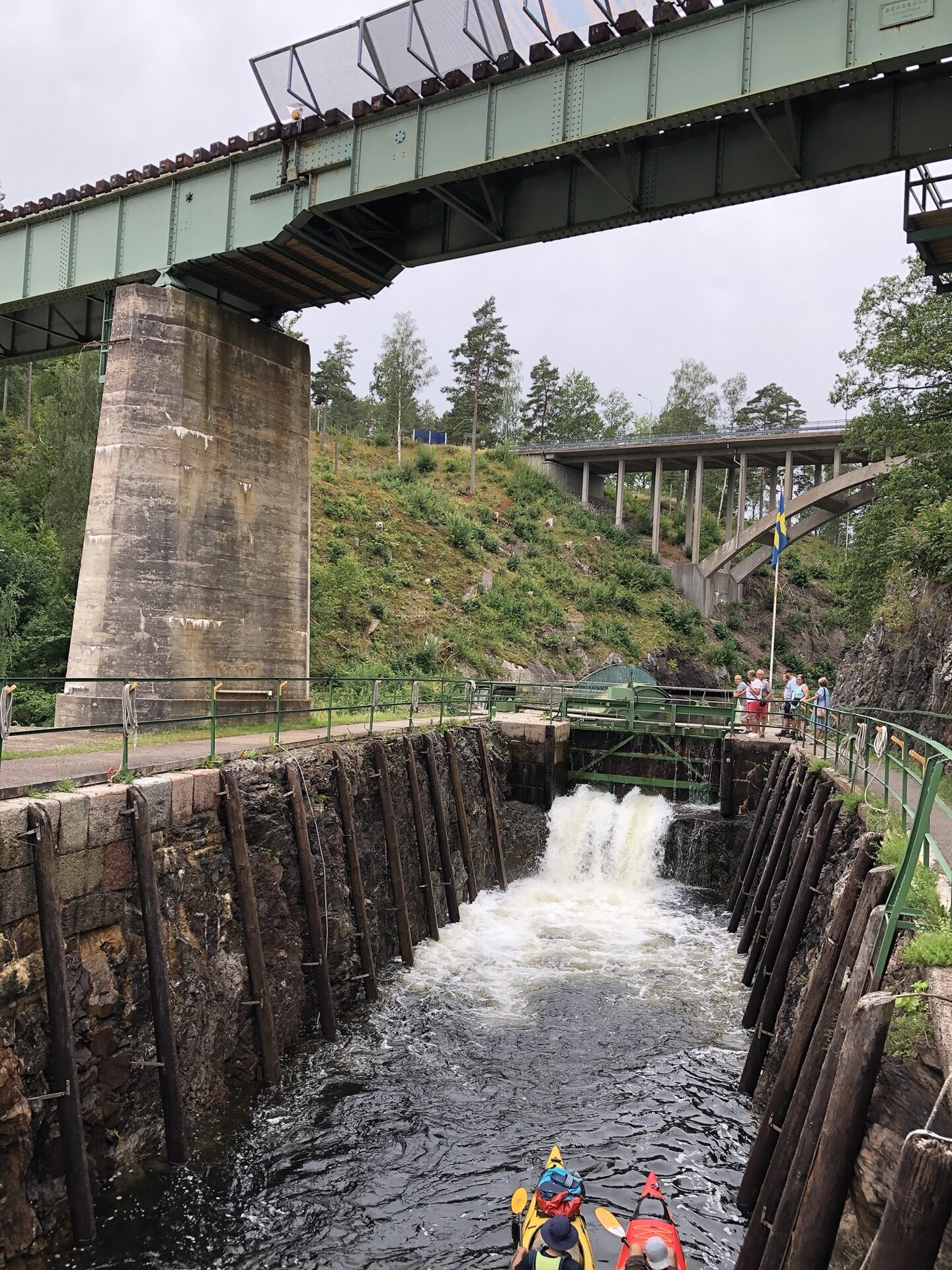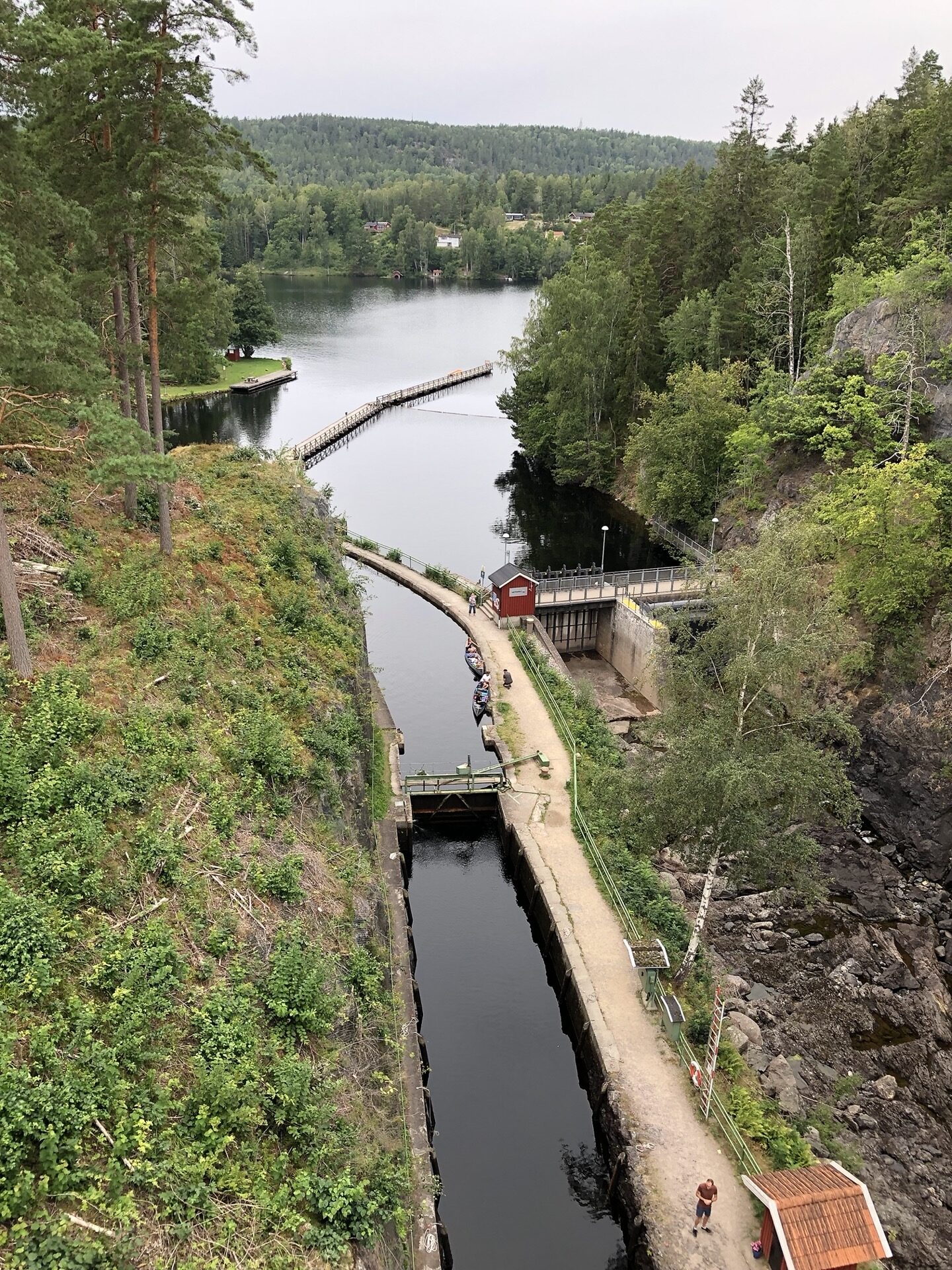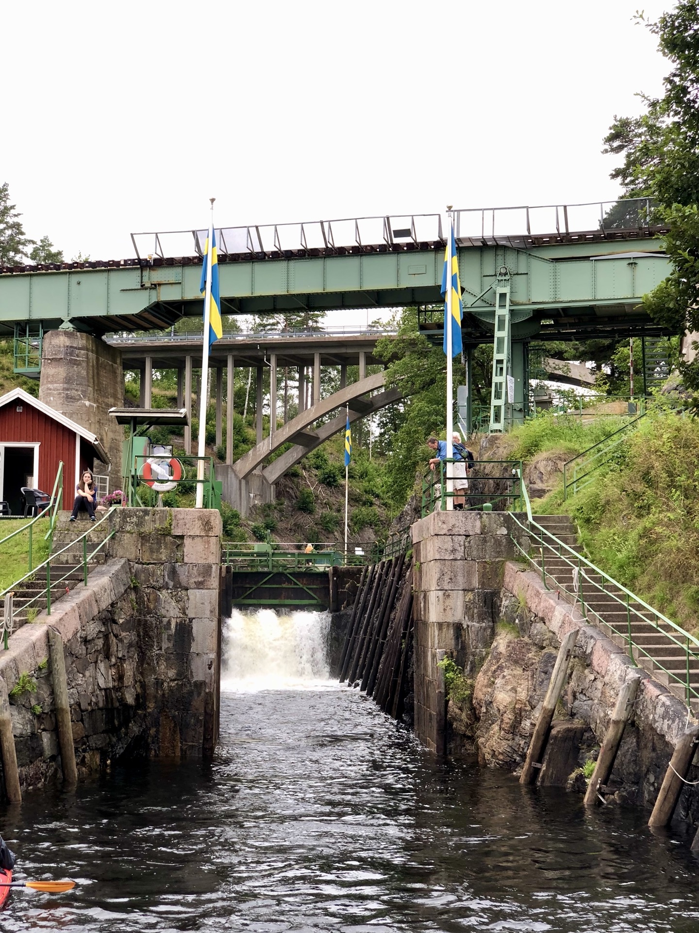 Håverud ist bekannt für sein spektakuläres Aquädukt, bei dem sich Wasserstraße, Eisenbahn und Autostraße auf faszinierende Weise kreuzen. Dieses Bauwerk aus genietetem Stahl ermöglicht es Booten über einen Fluss zufahren, während darüber sowohl eine Eisenbahn- als auch eine Straßenbrücke verlaufen. Das historischen Bauwerk, das mit seinen vier Schleusen eine Höhendifferenz von 9,9 Metern überwindet ist der Touristenmagnet des Dalslands Kanals schlecht hin! Wir schauen uns das ganze erstmal von der Autobrücke aus an und gehen dann runter ans Wasser.