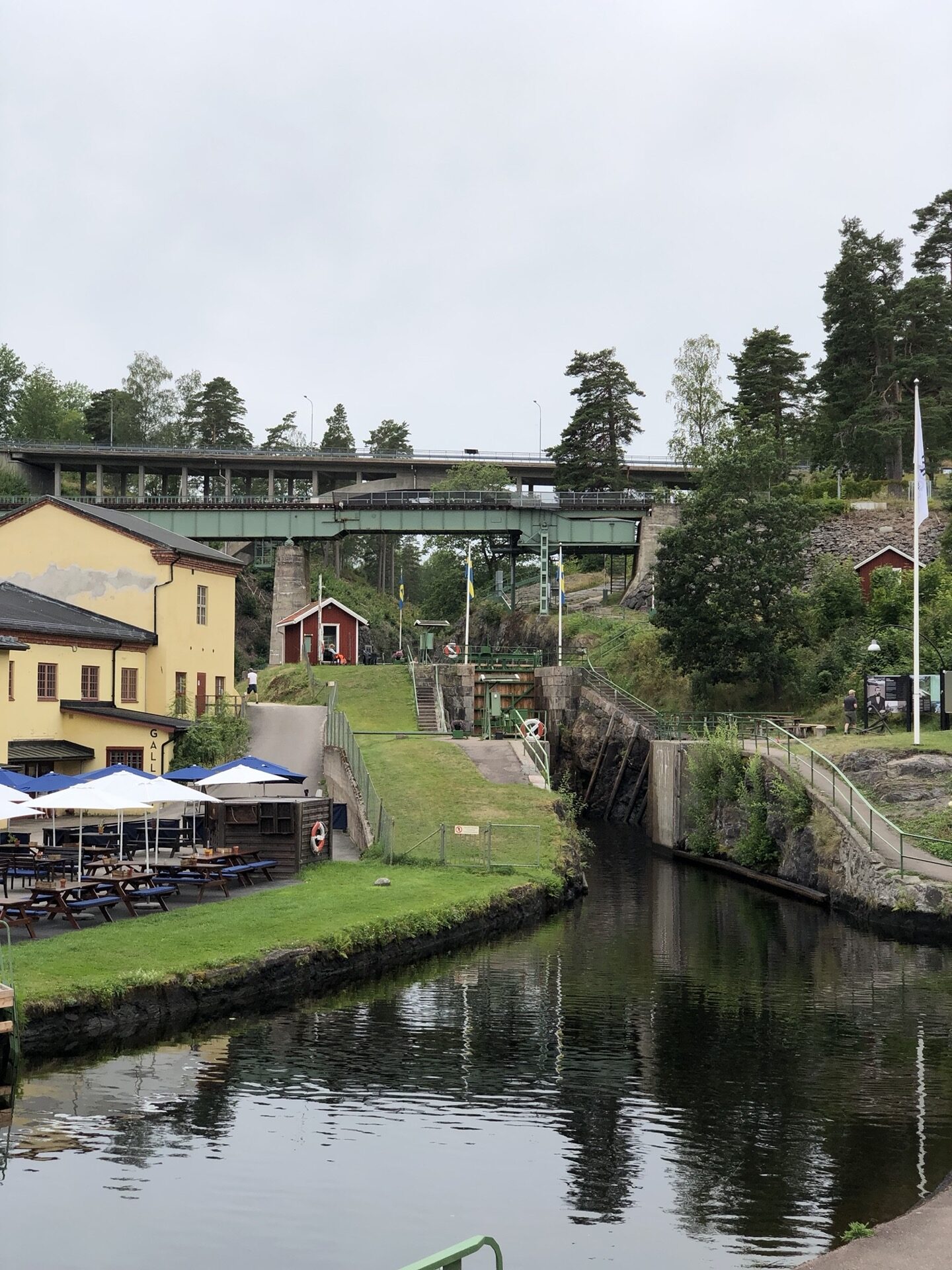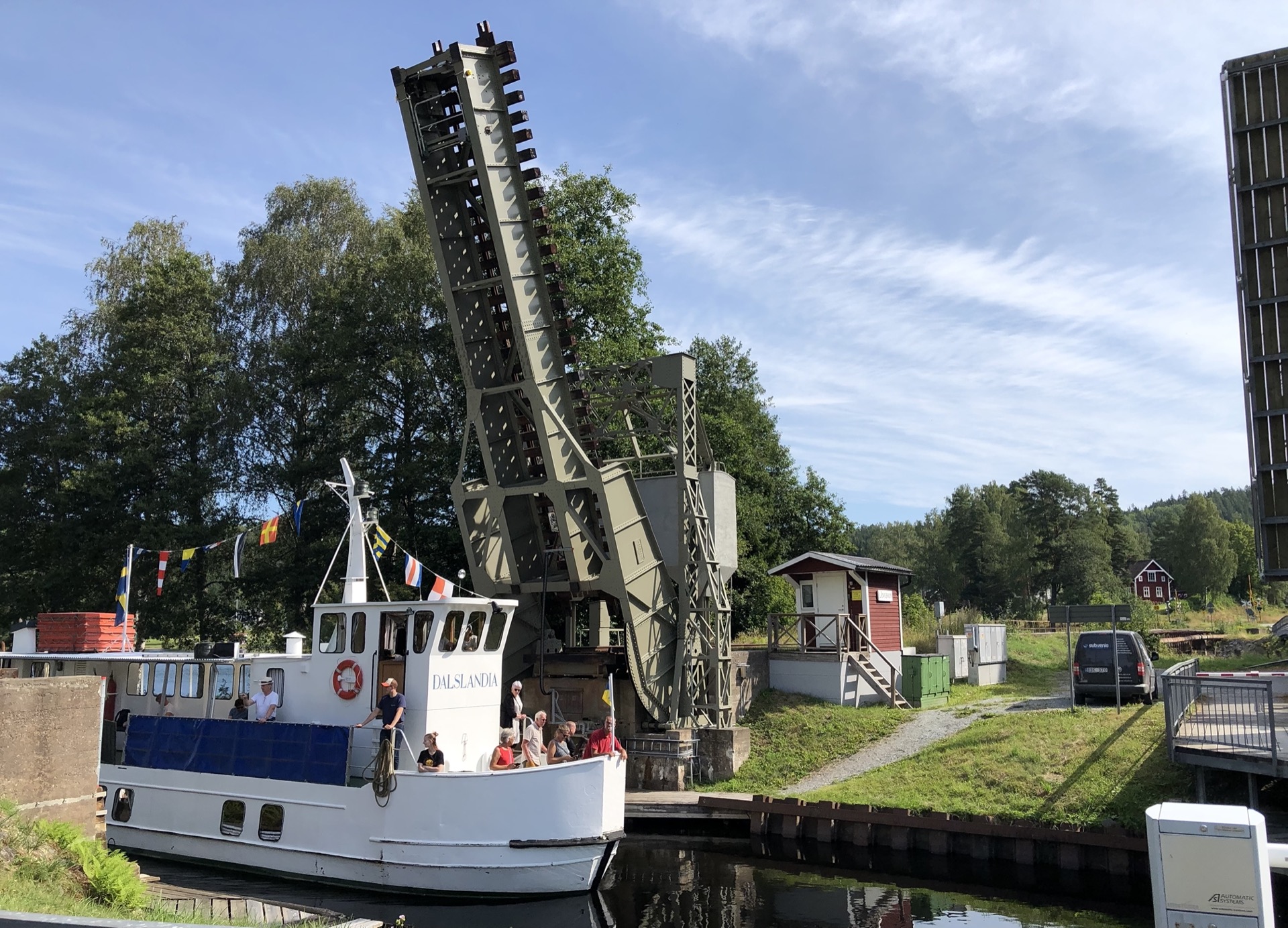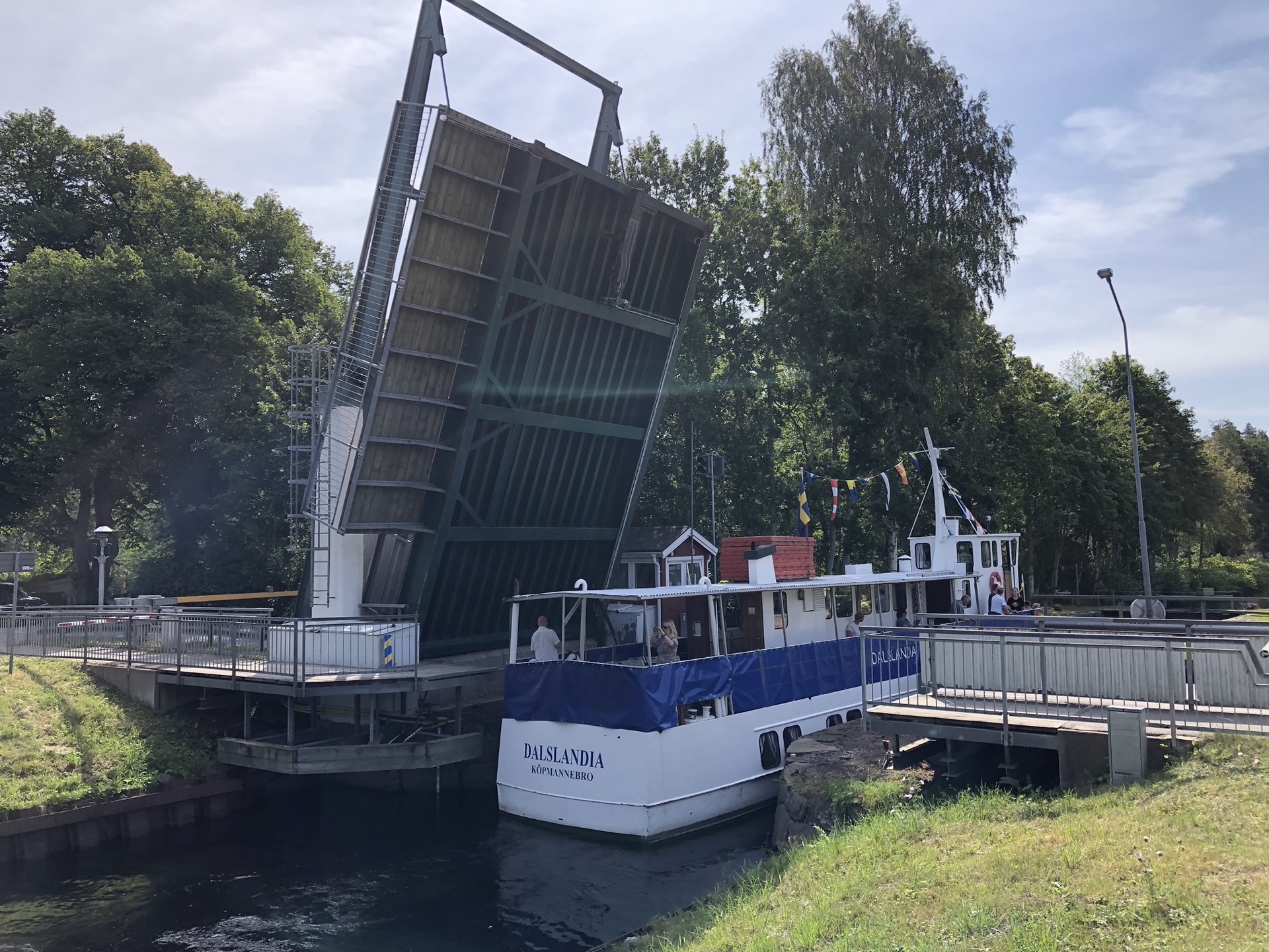 In Dals Långed kommen wir gerade an der Schleuse an, als das Ausflugsboot diese passiert. Dazu muss nicht nur die Brücke für die Autos hochgeklappt werden, auch die Gleise für den Schienenbus. Die Schleuse ist ziemlich eng und das Ausflugsboot scheint genau so gebaut zu sein, dass es exakt dort rein passt, tolles Schauspiel! Wir fahren noch ein paar wenige Kilometer und stärken uns am Ende der Ortschaft mit einer Pizza.